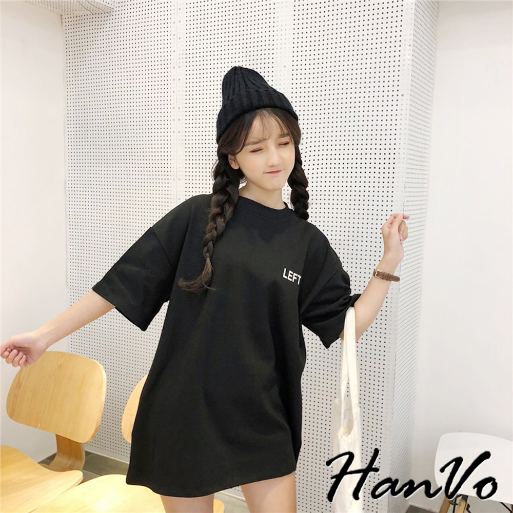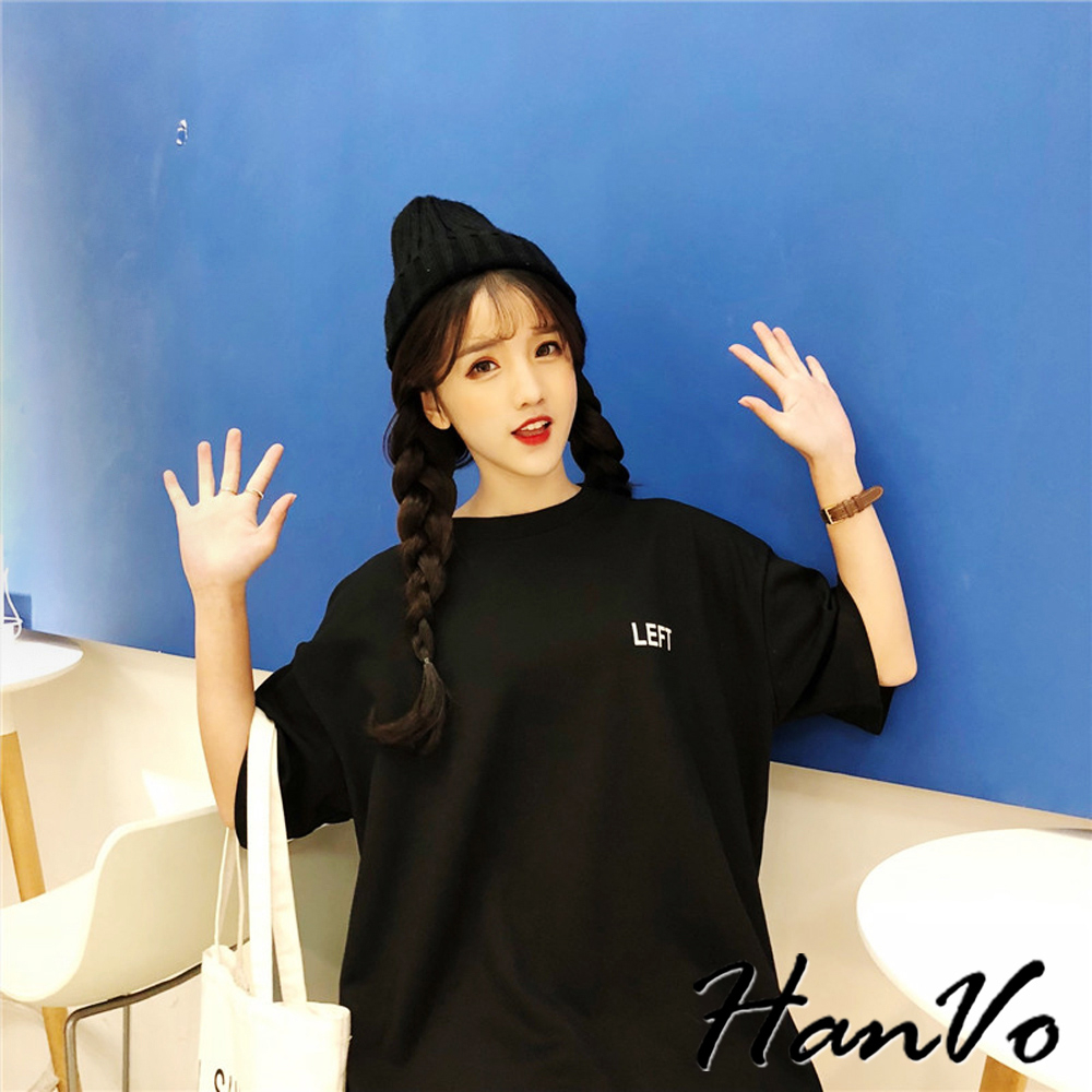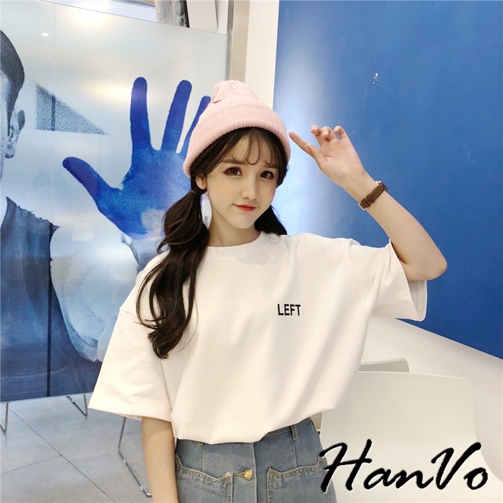 【HanVo】LEFT簡約英文字印花寬鬆T恤 親膚透氣百搭圓領短袖上衣 棉質日常T 韓系女裝 女生衣著 A01-0000黑色|白色T-shirtsHanVo Wear Collection