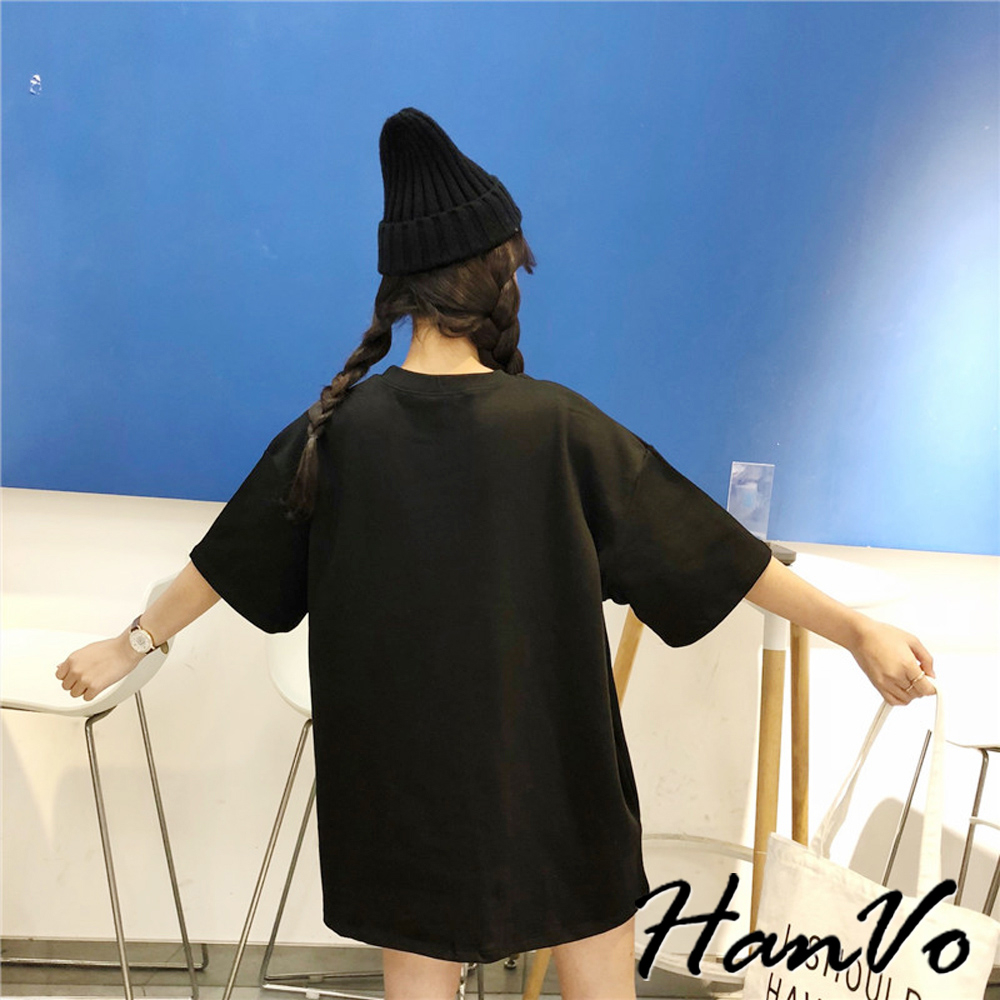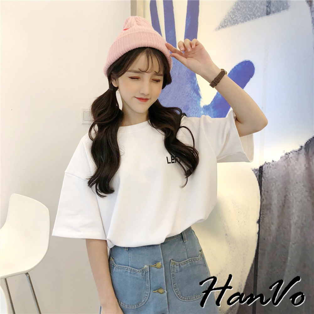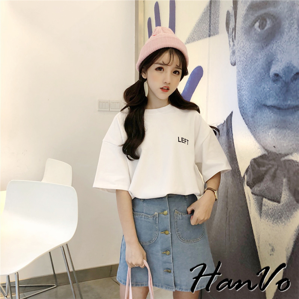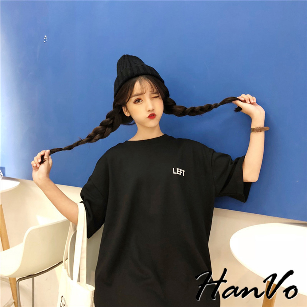【HanVo】LEFT簡約英文字印花寬鬆T恤 親膚透氣百搭圓領短袖上衣 棉質日常T 韓系女裝 女生衣著 A01-0000黑色|白色T-shirtsHanVo Wear Collection