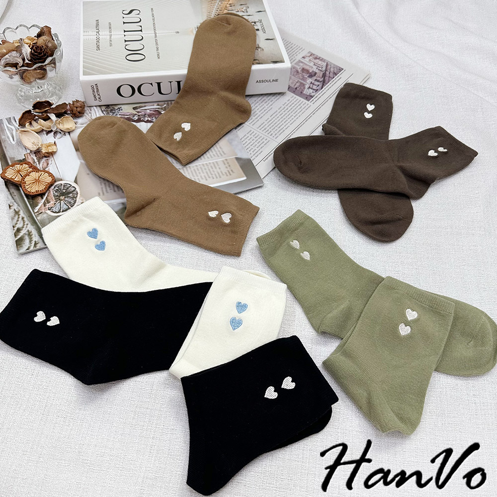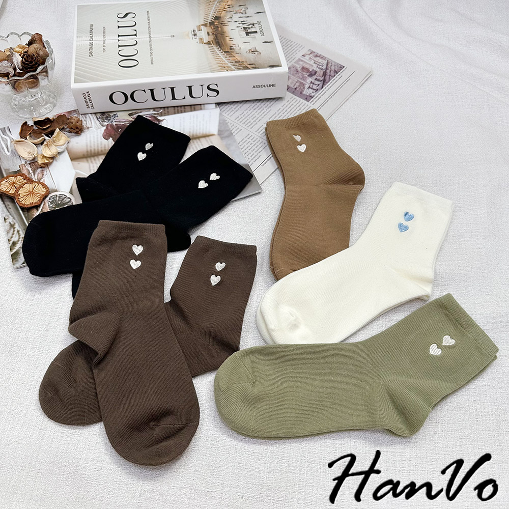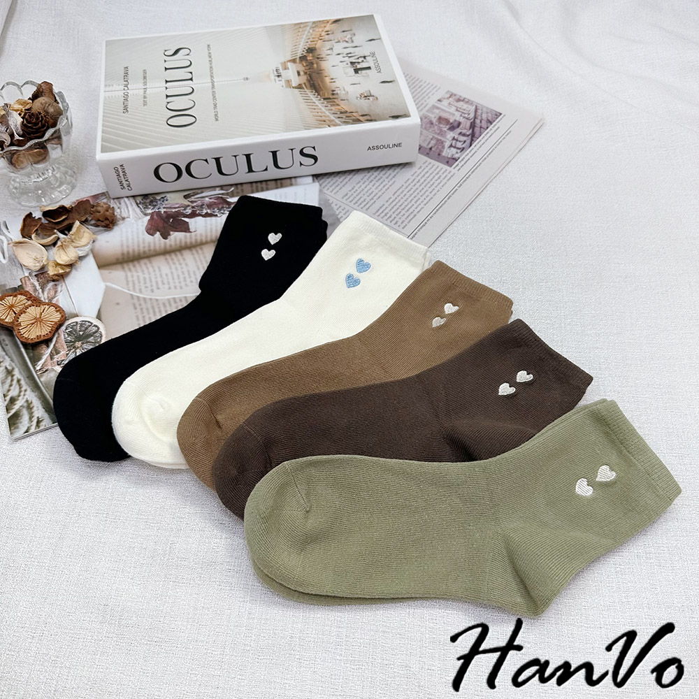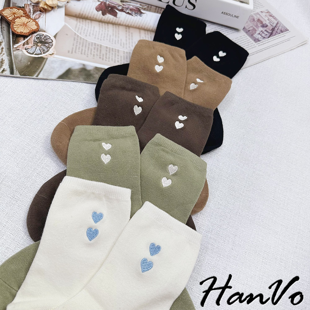 【HanVo】奶霧雙愛心刺繡中筒襪 韓系簡約百搭舒適棉質襪 韓國潮流時尚休閒襪 女生配件 A12-6269卡其|黑色|奶白|抹綠|深咖SocksHanVo Wear Collection