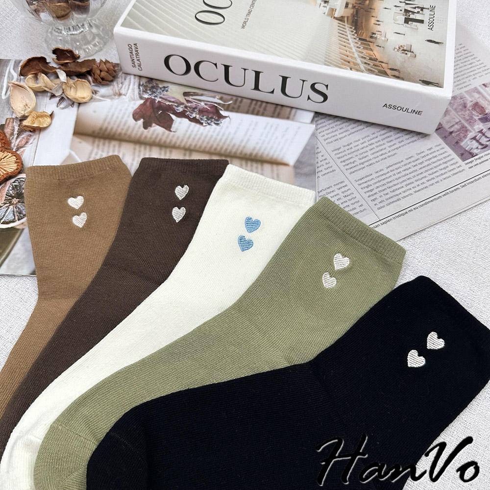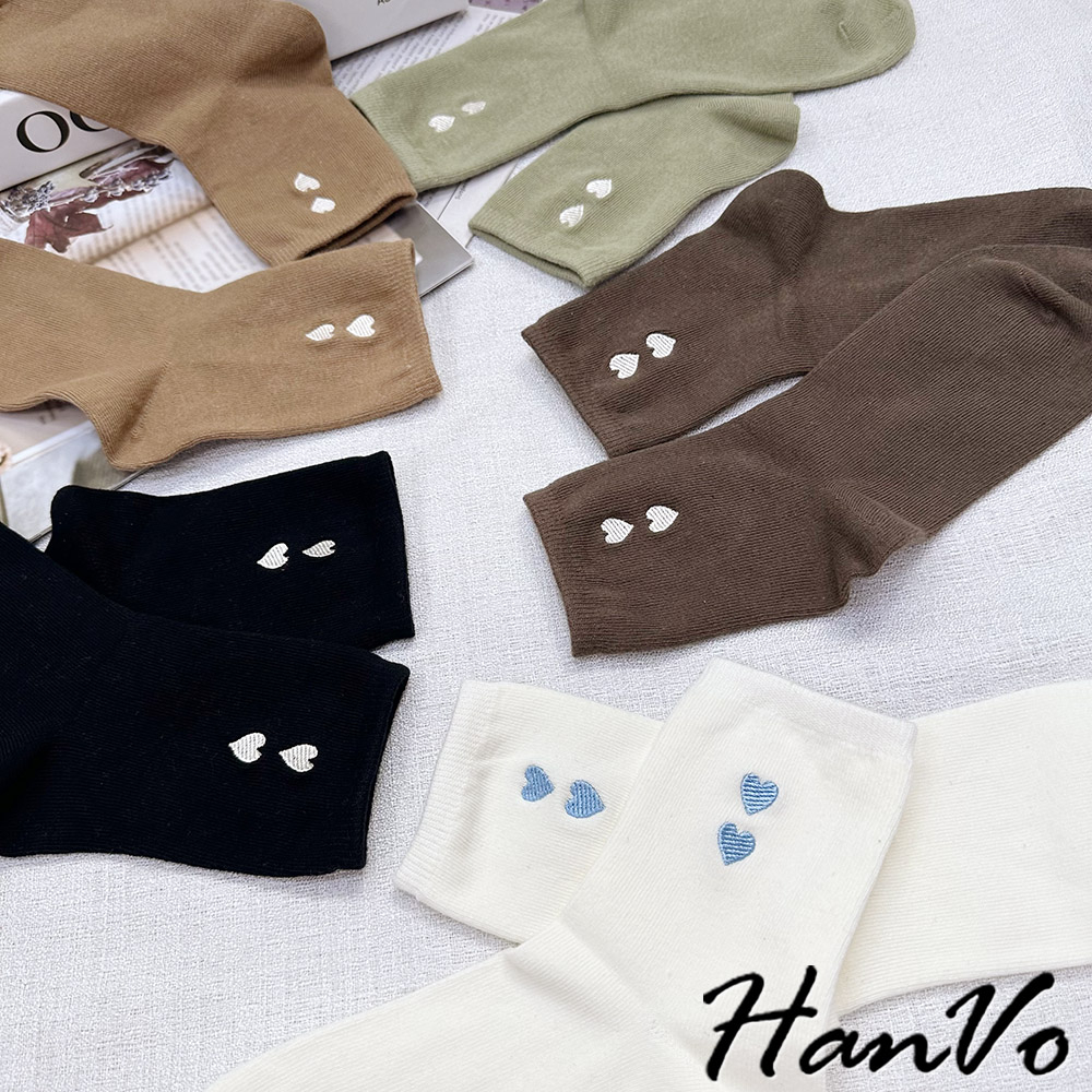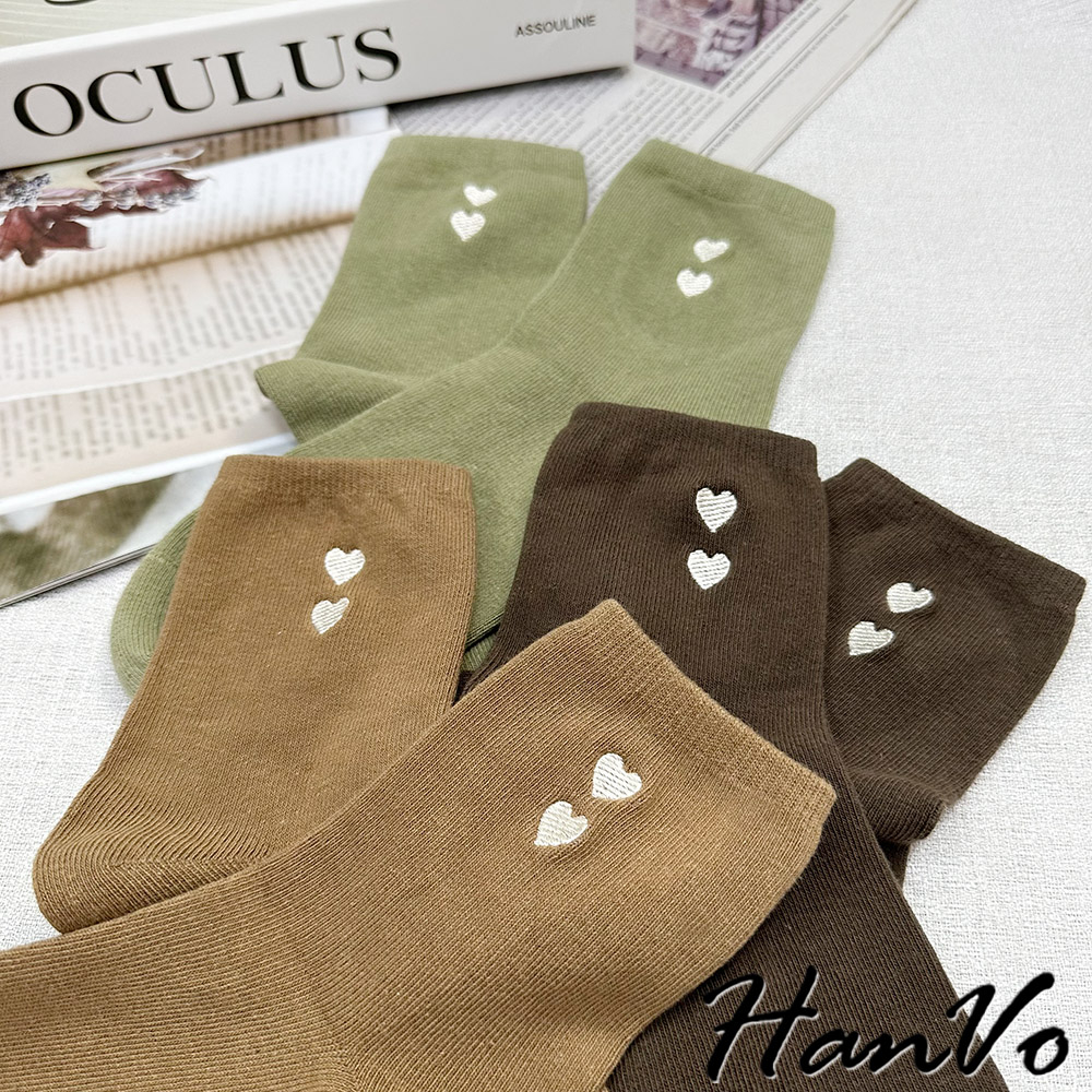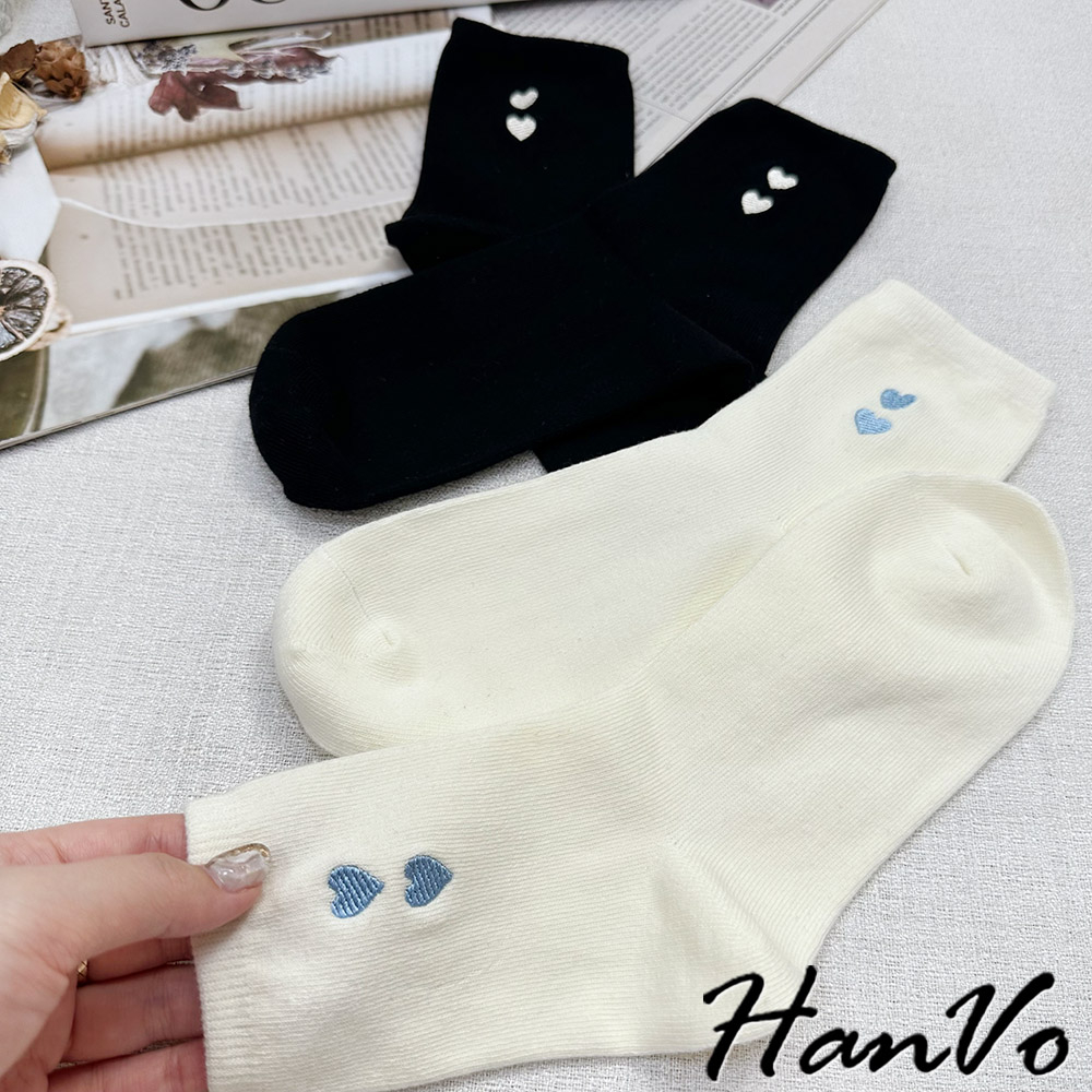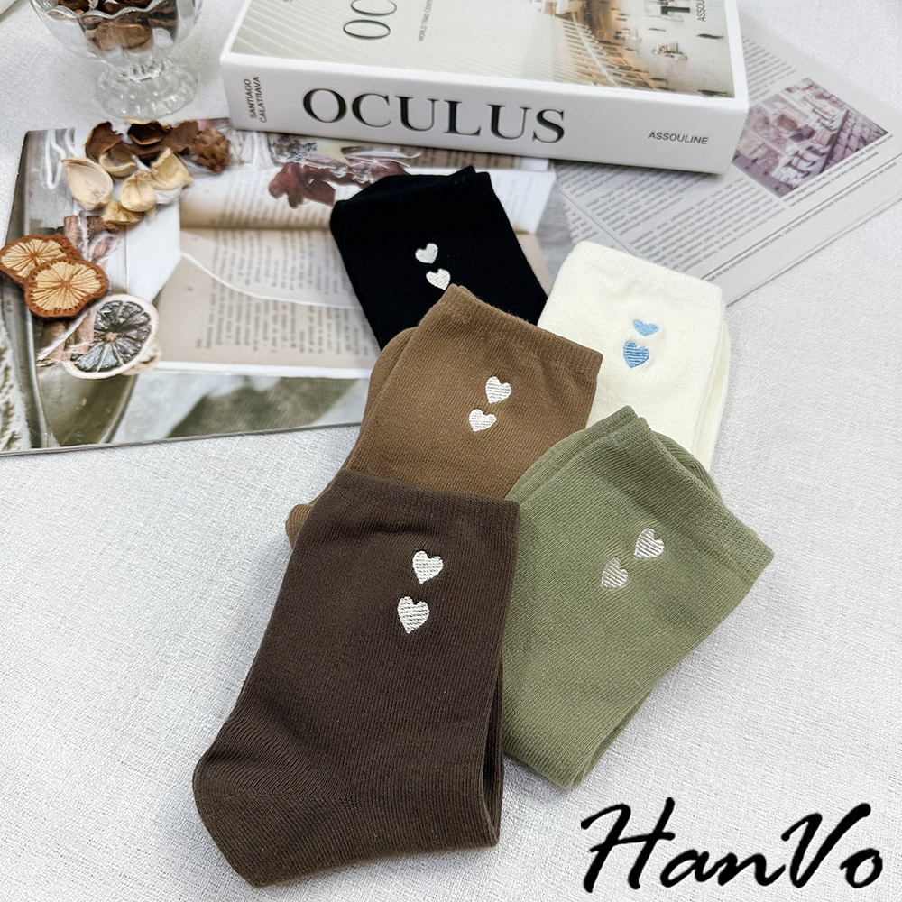 【HanVo】奶霧雙愛心刺繡中筒襪 韓系簡約百搭舒適棉質襪 韓國潮流時尚休閒襪 女生配件 A12-6269卡其|黑色|奶白|抹綠|深咖SocksHanVo Wear Collection