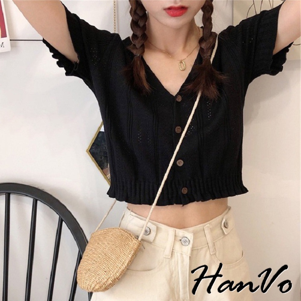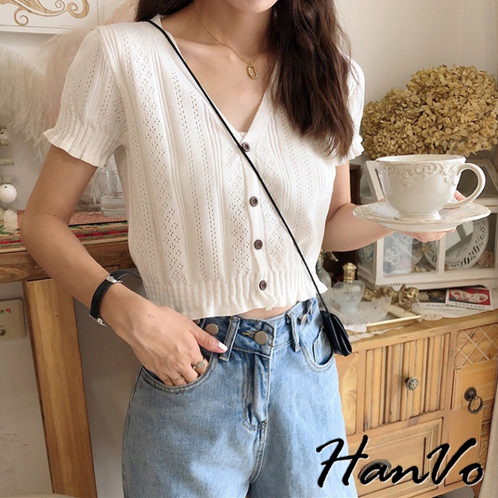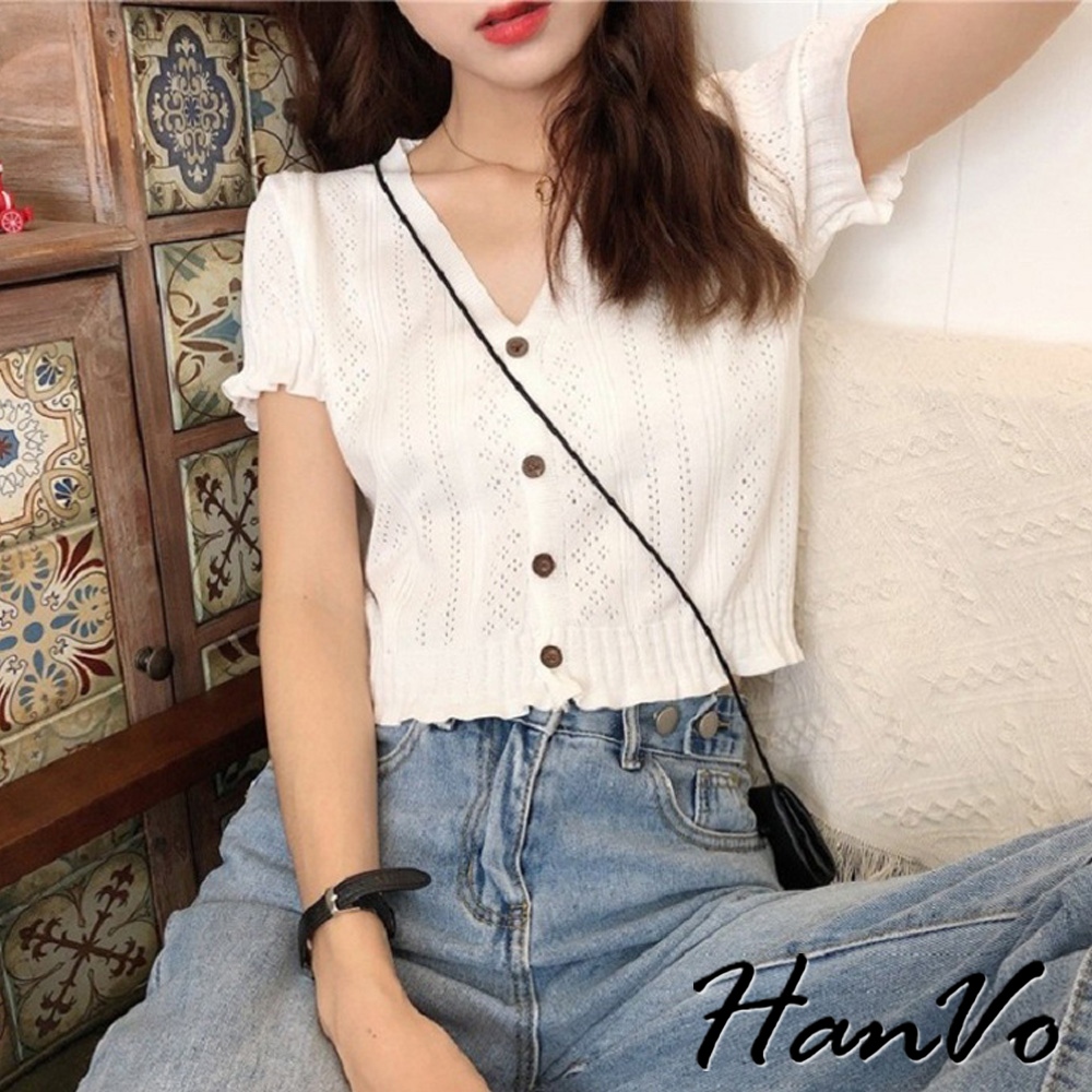 【HanVo】V領鏤空木耳邊薄款針織衣 甜美短版修身顯瘦上衣 韓系女裝 女生衣著 A01-0208黑色|白色HanVo Wear Collection