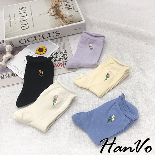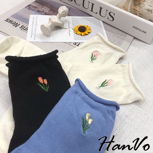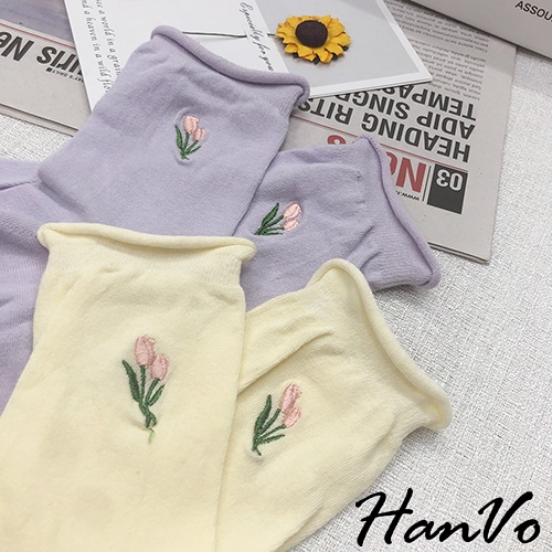 【HanVo】夏日粉嫩小花刺繡捲邊中筒襪 韓系簡約百搭舒適棉質襪 韓國潮流時尚休閒襪 女生配件 A12-6140黑色|奶白|奶油黃|嫩紫|晴藍SocksHanVo Wear Collection