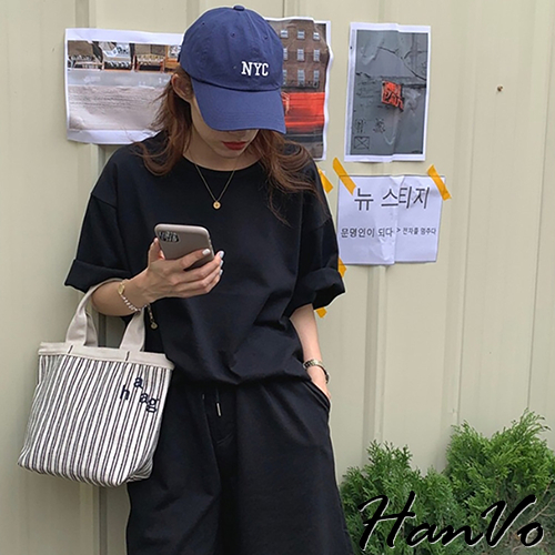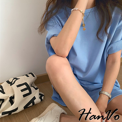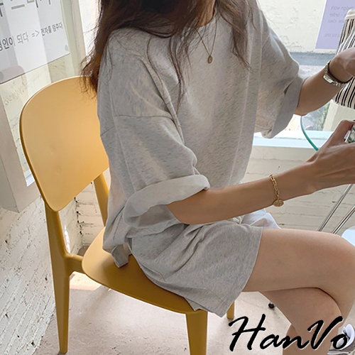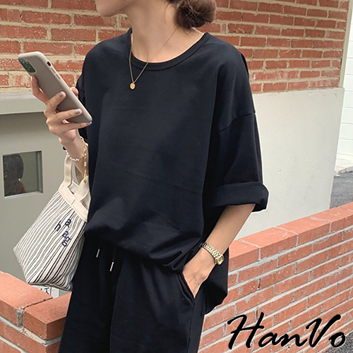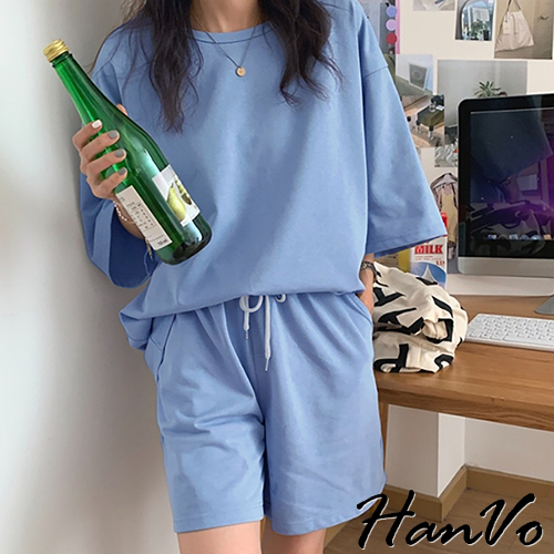 【HanVo】慵懶休閒棉質兩件套裝 韓版休閒圓領短袖上衣棉質短褲套裝 日常百搭 韓系女裝 女生衣著 A08-5920灰色|黑色Individual SetsHanVo Wear Collection