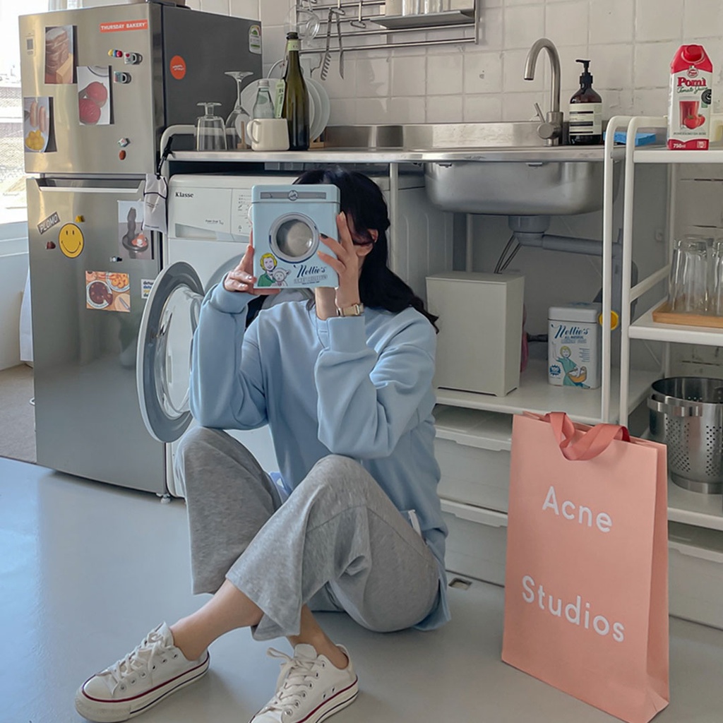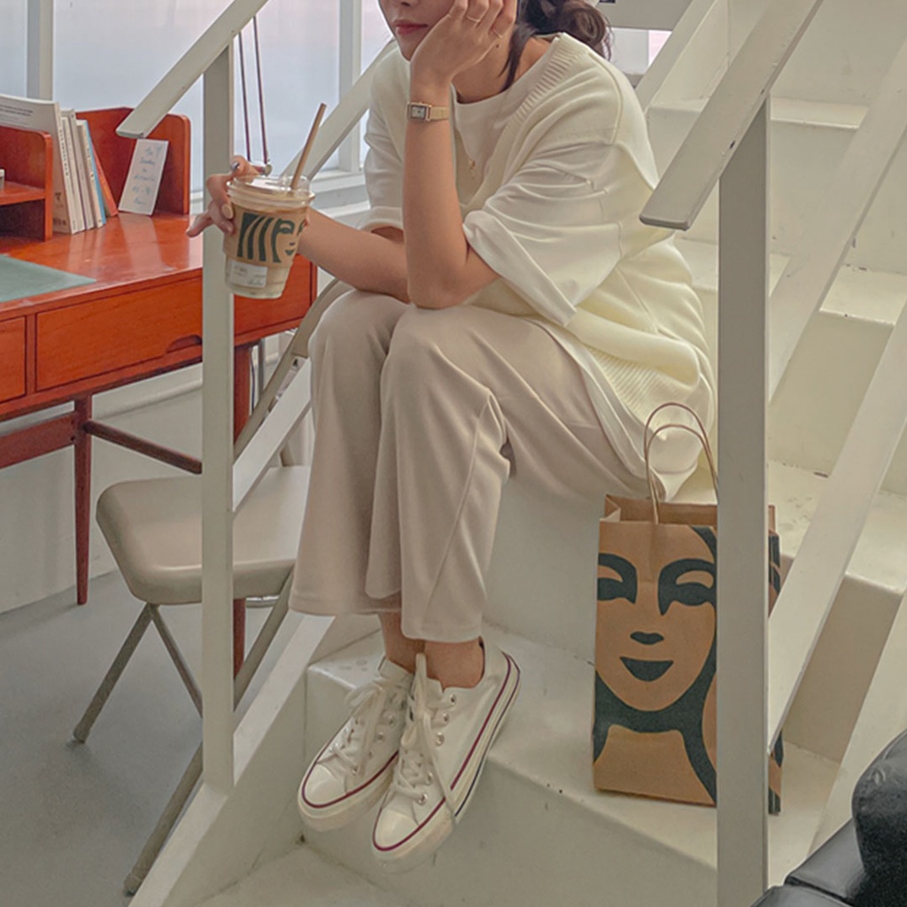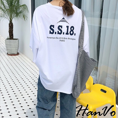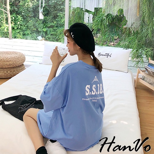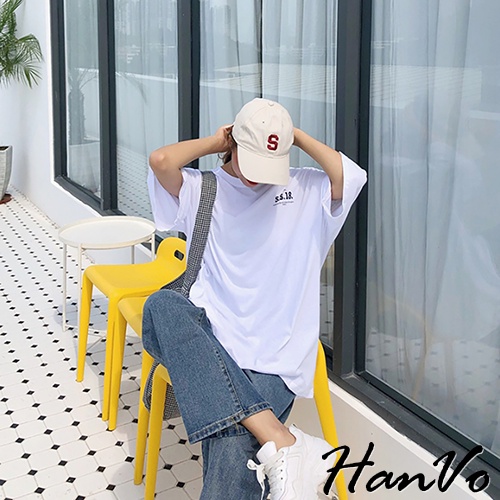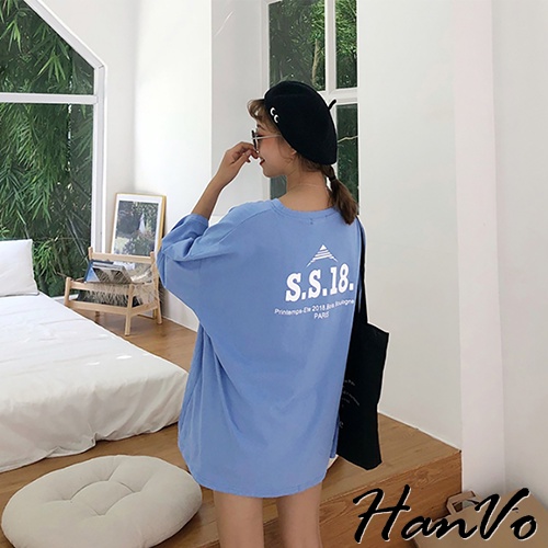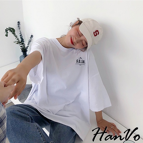 【HanVo】簡約男友風前後字母寬鬆T 韓版休閒百搭顯瘦圓領短袖上衣 韓系女裝 女生衣著 A01-1300白色|藍色T-shirtsHanVo Wear Collection