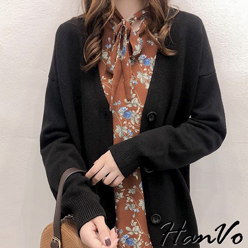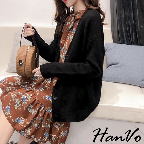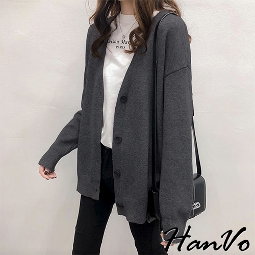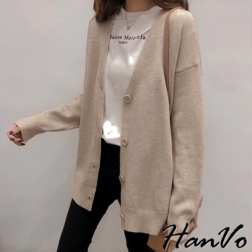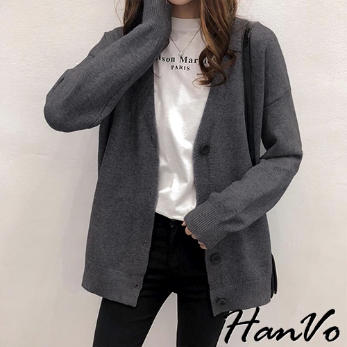 【HanVo】保暖系列 落肩V領寬鬆不挑身形針織外套 韓系休閒百搭針織寬版外套上衣 女生衣著 A07-1759深咖|黑色|灰色|米杏HanVo Wear Collection