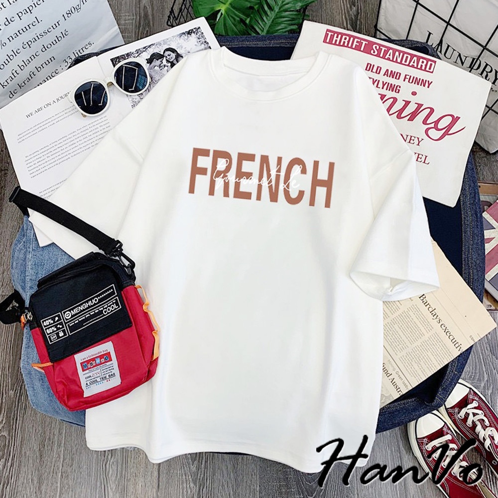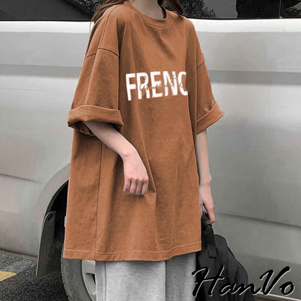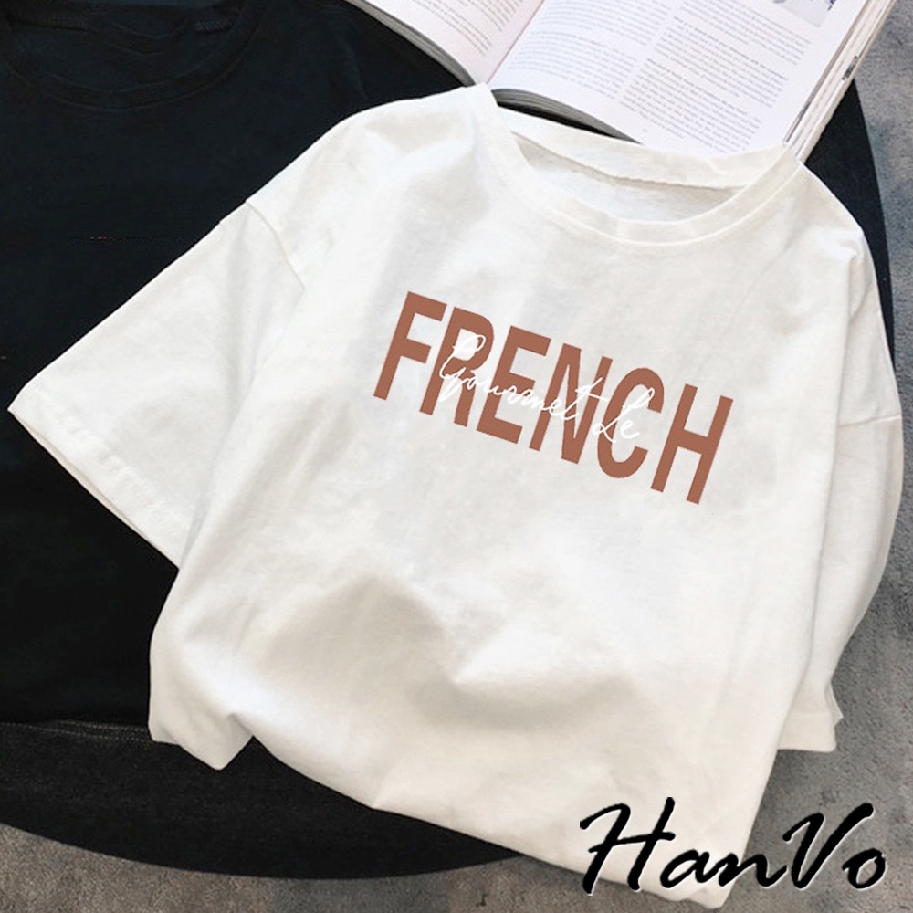 【HanVo】FRENCH字母寬鬆T恤 棉質吸濕透氣排汗 舒適百搭上衣 韓系女裝 女生衣著 A01-0118咖色|白色T-shirtsHanVo Wear Collection