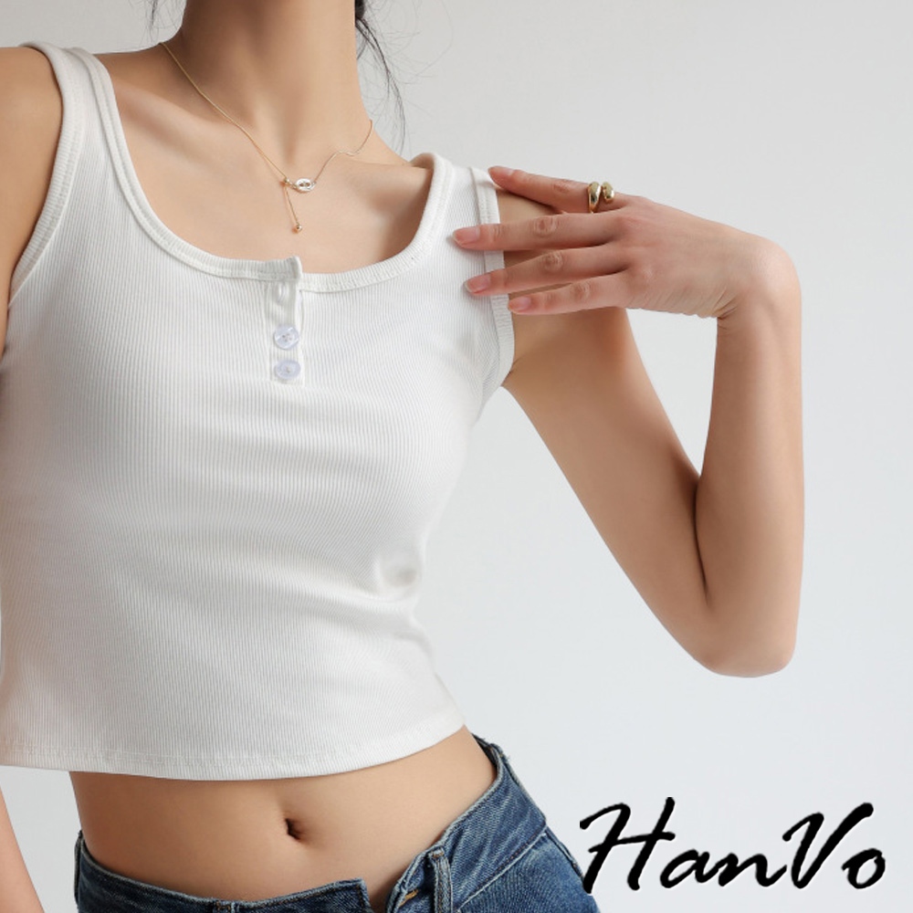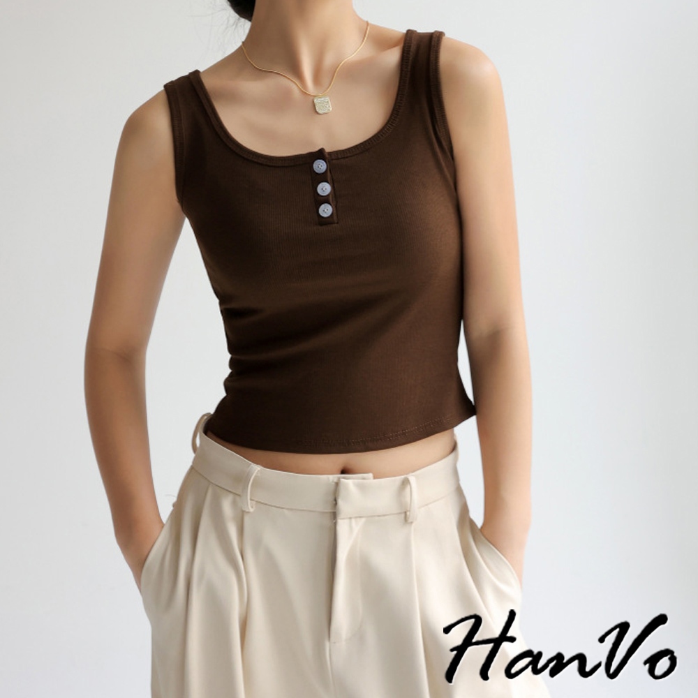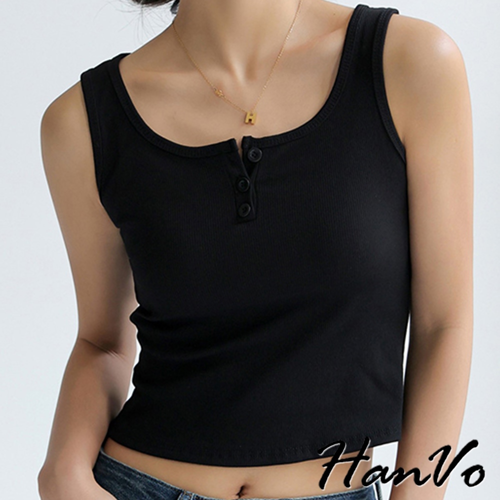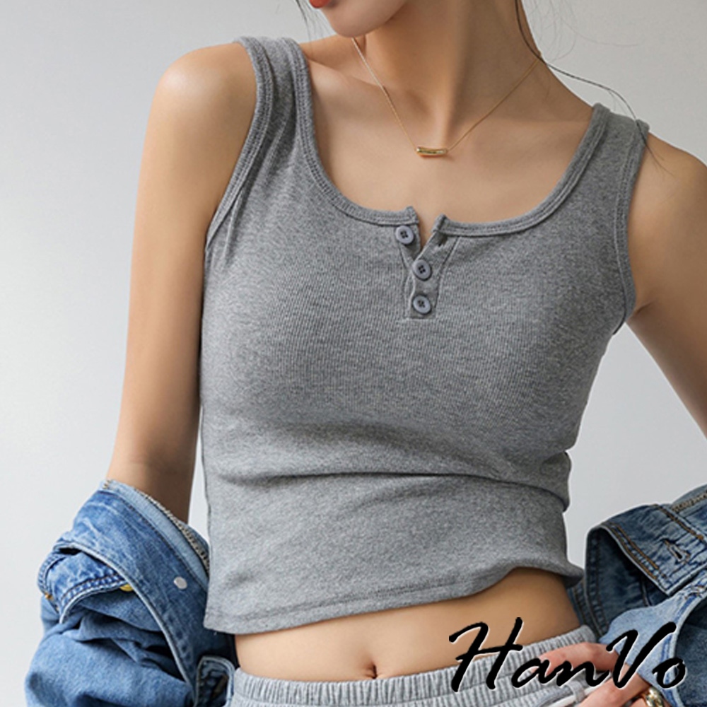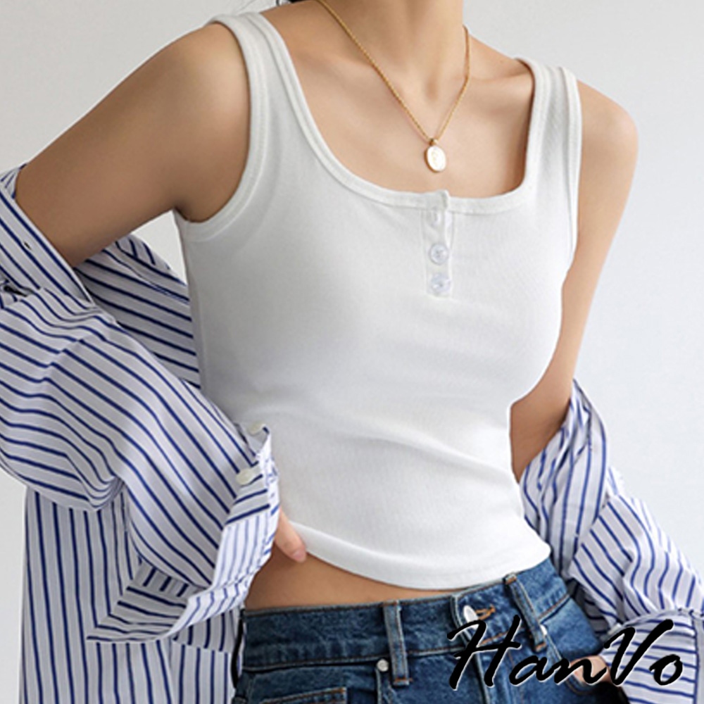 【HanVo】質感三排扣直紋短版背心 棉質吸濕排汗透氣內搭背心 休閒韓系女裝 女生衣著 A01-0177雲霧灰|茶園綠|夜幕黑|胡桃咖|純淨白Tanks & CamisolesHanVo Wear Collection
