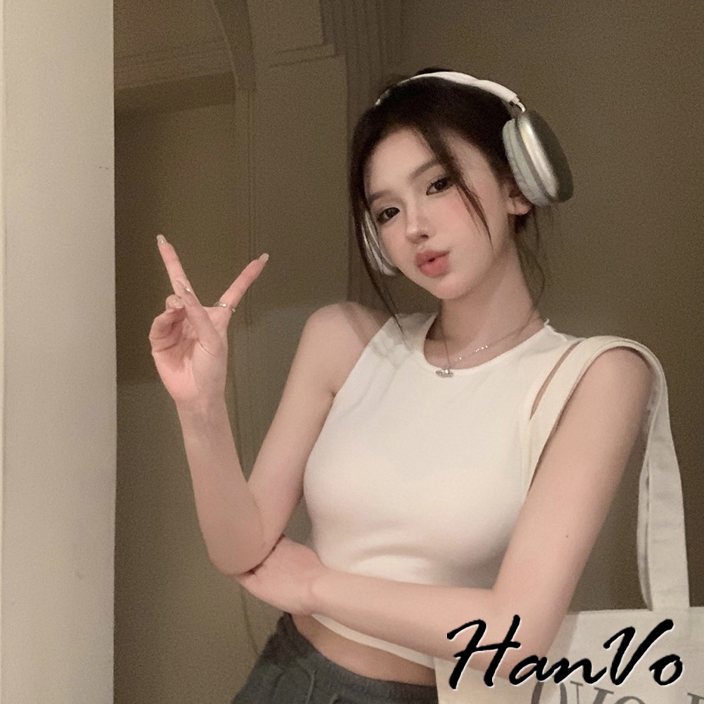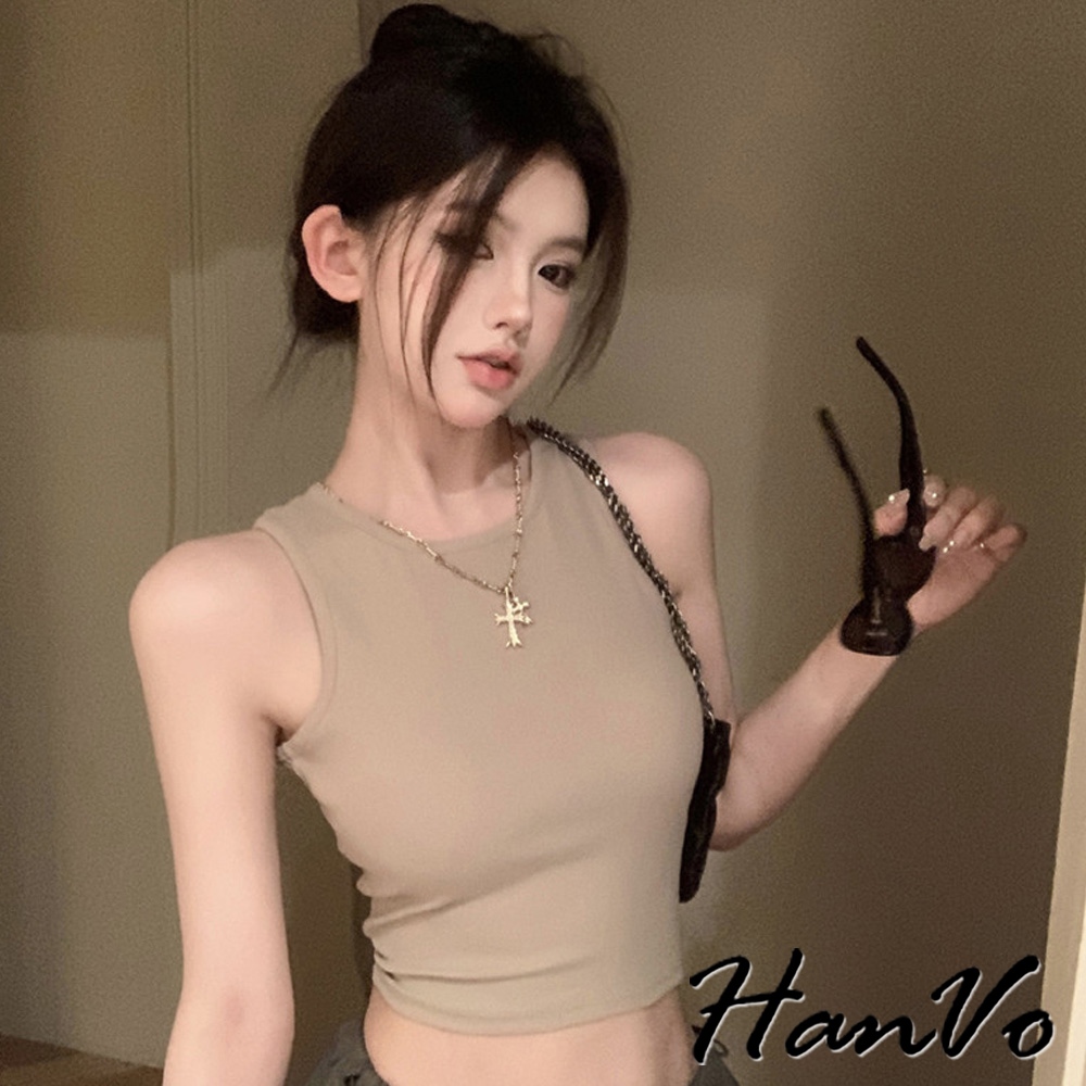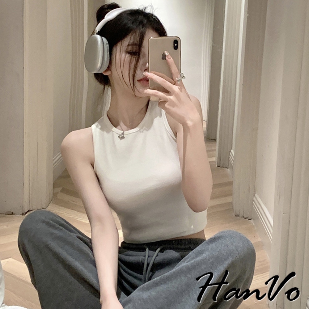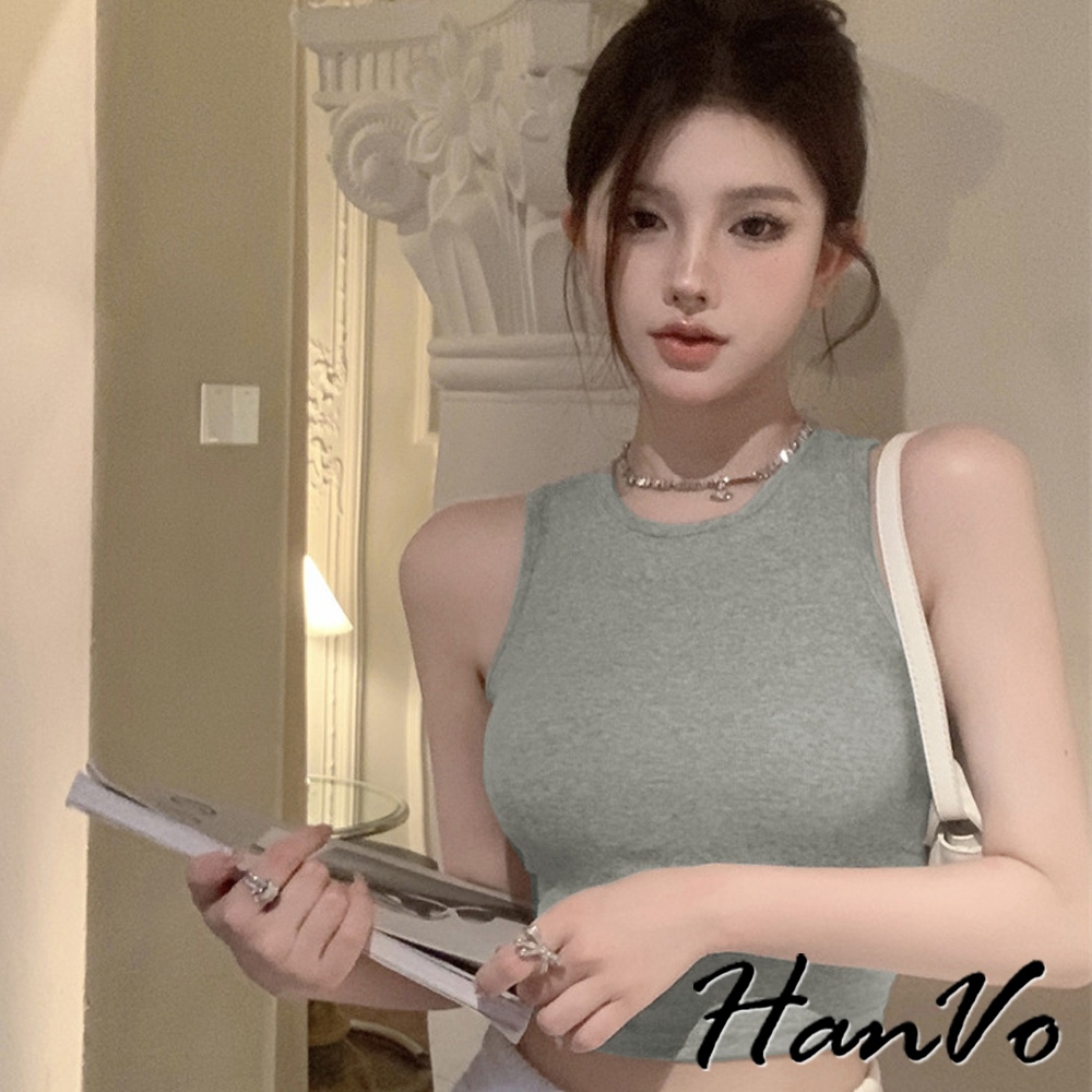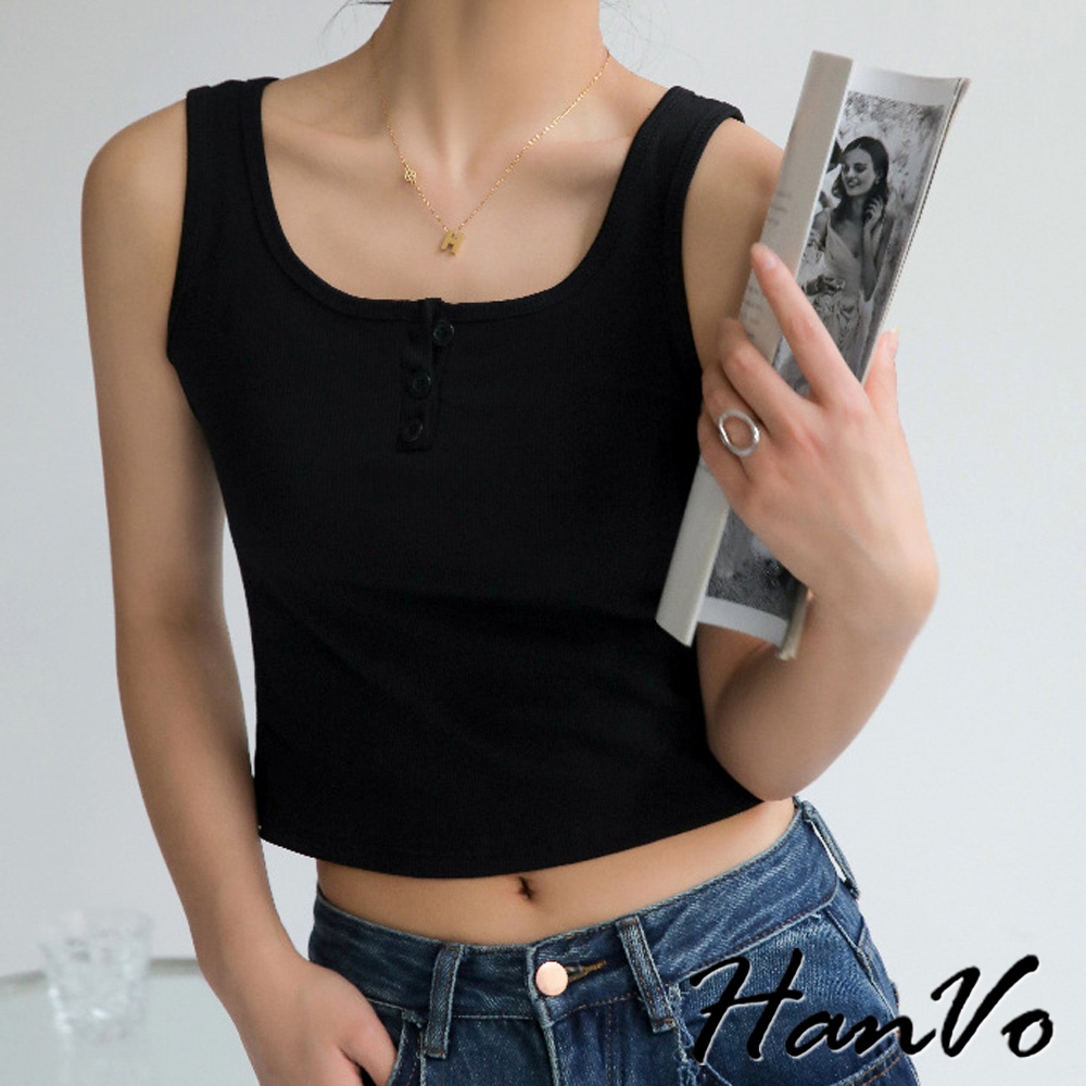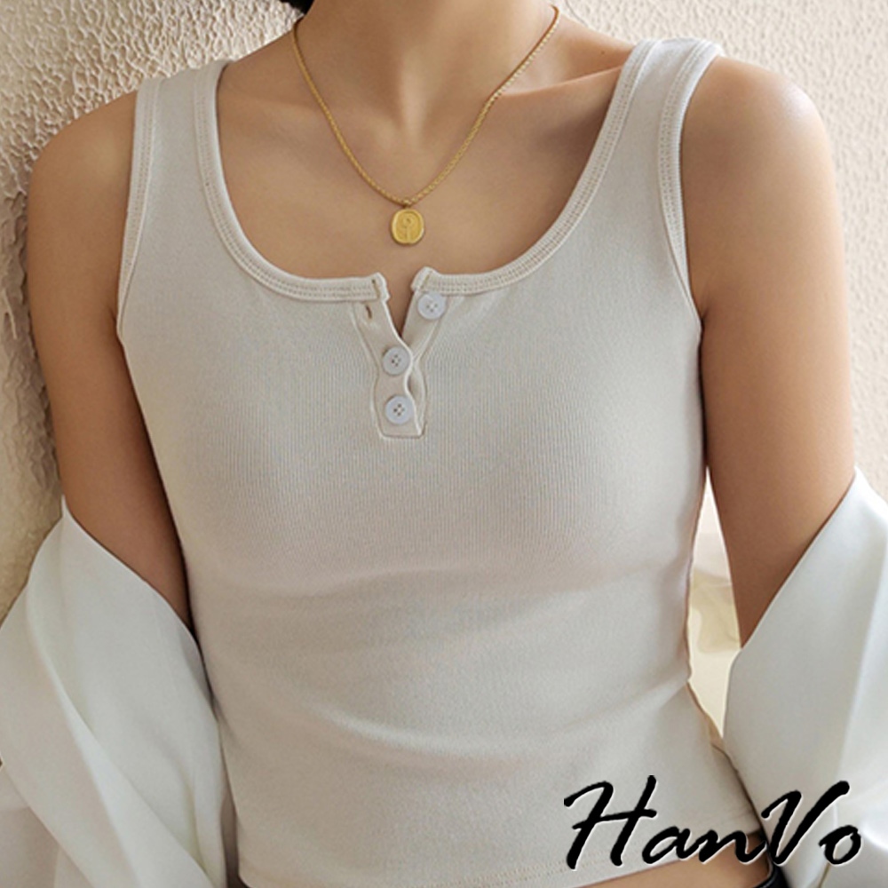 【HanVo】質感三排扣直紋短版背心 棉質吸濕排汗透氣內搭背心 休閒韓系女裝 女生衣著 A01-0177雲霧灰|茶園綠|夜幕黑|胡桃咖|純淨白Tanks & CamisolesHanVo Wear Collection
