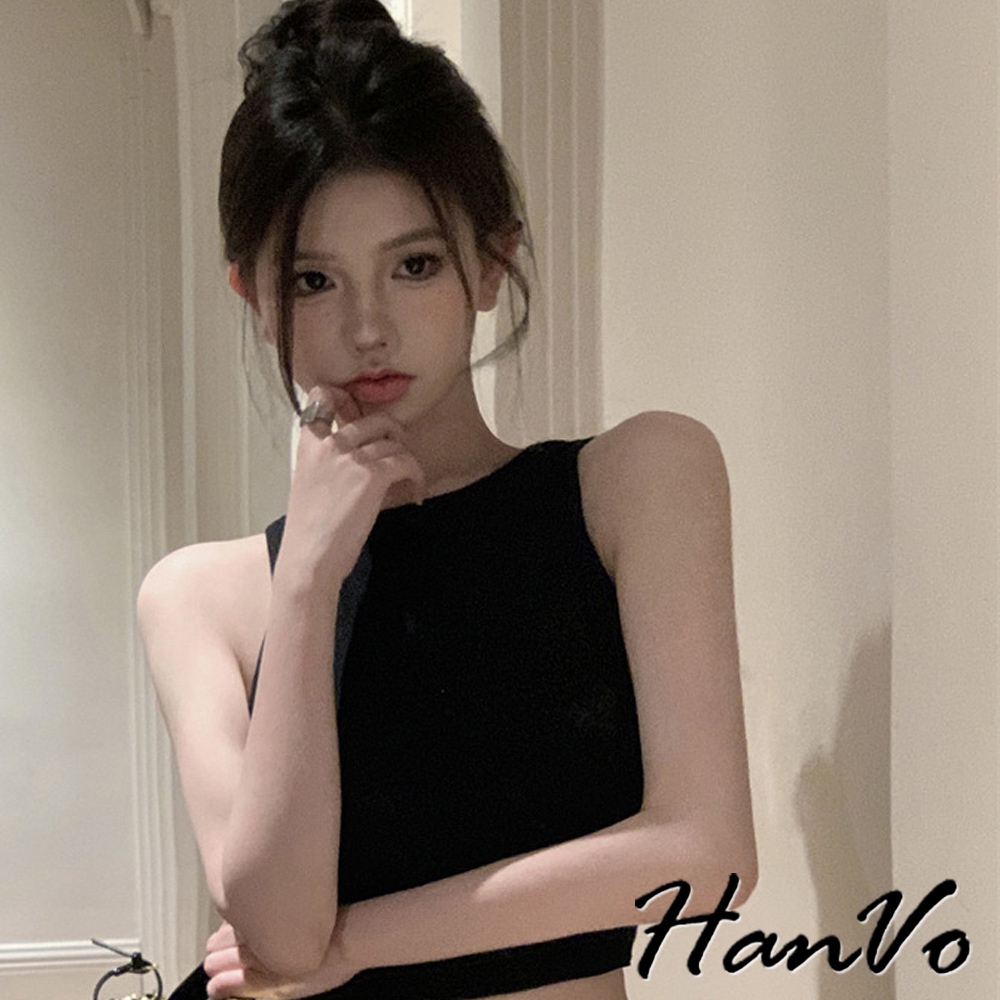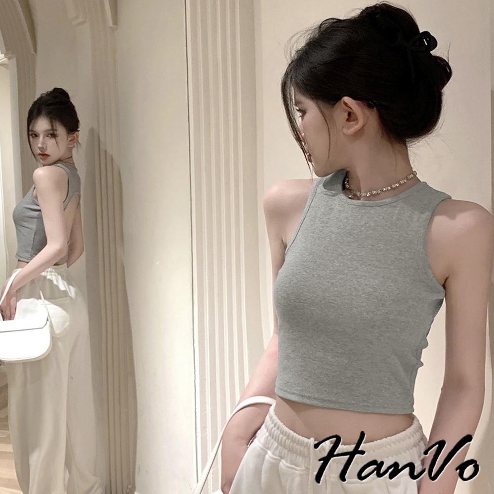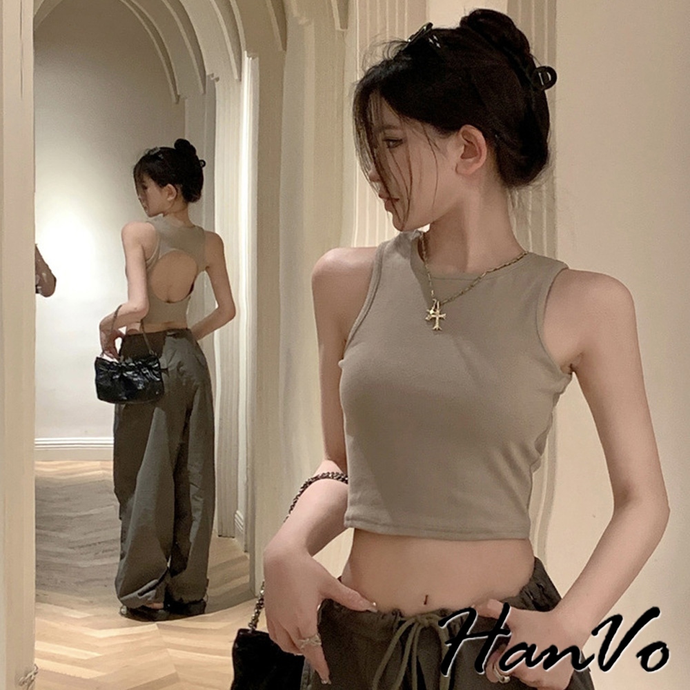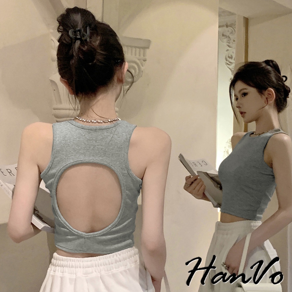 【HanVo】鏤空挖背短版工字背心 直坑紋時尚打底小可愛 附不可拆胸墊 居家內搭 女生衣著 A09-5077黑色|白色|灰色|卡其OthersHanVo Wear Collection