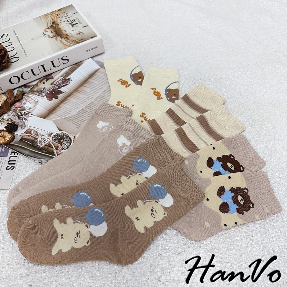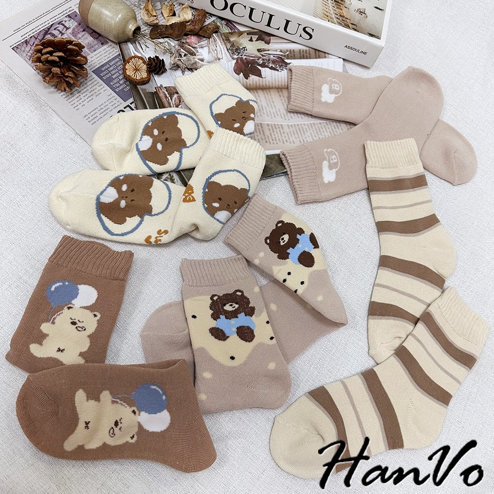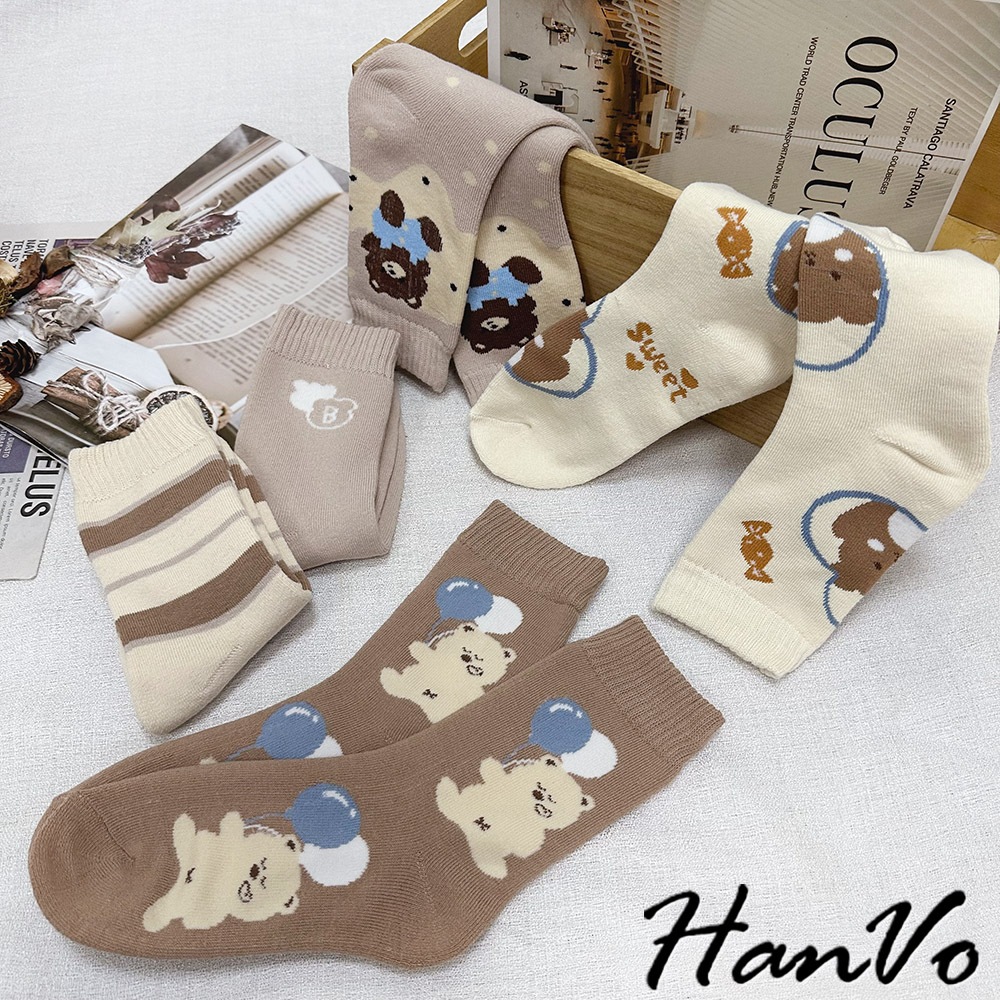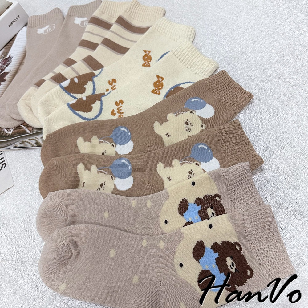 【HanVo】卡奇氣球小熊襪子中筒襪 秋冬保暖加絨加厚 韓系可愛休閒襪 女生配件 A12-6289氣球小熊|咖色條紋|SWEET熊|字母B|白點熊SocksHanVo Wear Collection