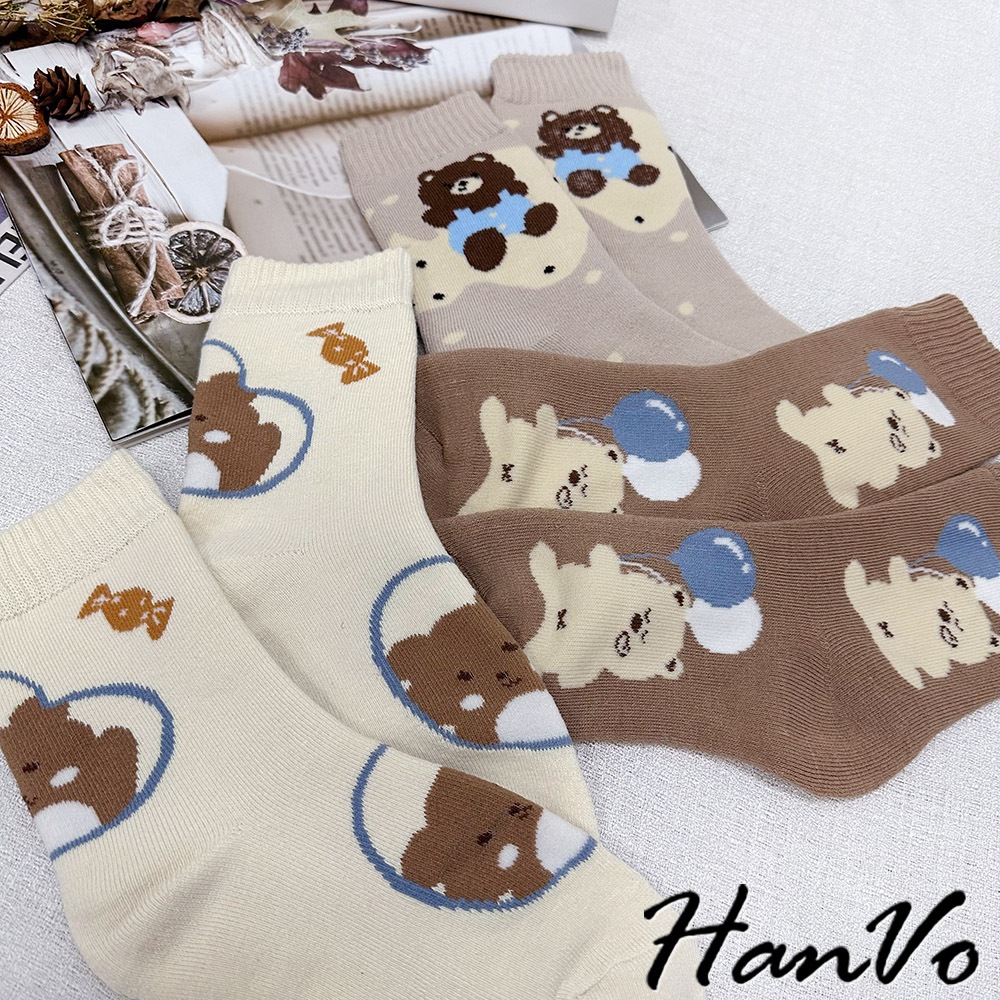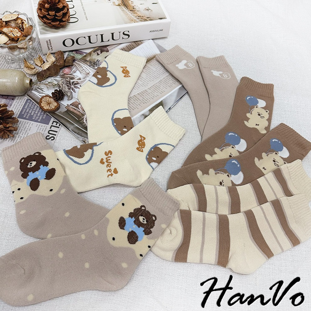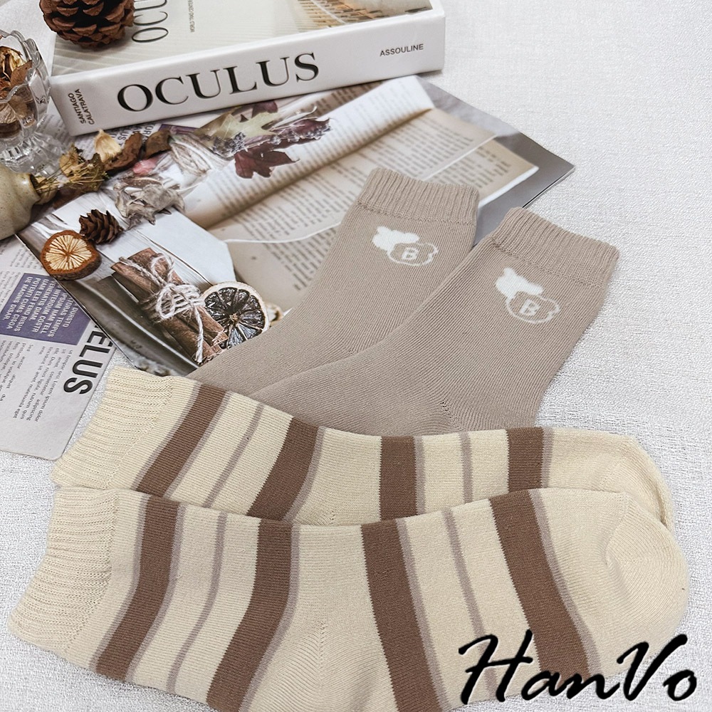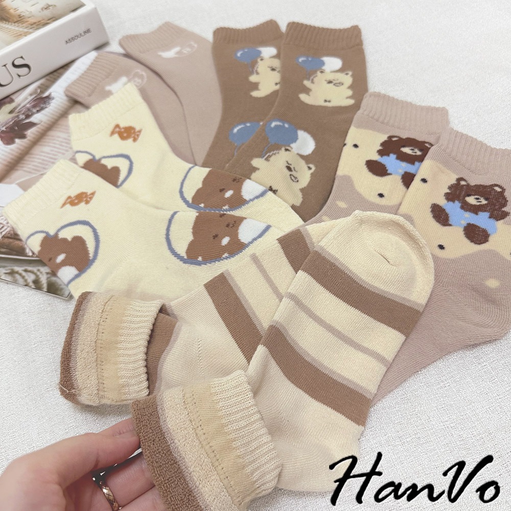 【HanVo】卡奇氣球小熊襪子中筒襪 秋冬保暖加絨加厚 韓系可愛休閒襪 女生配件 A12-6289氣球小熊|咖色條紋|SWEET熊|字母B|白點熊SocksHanVo Wear Collection