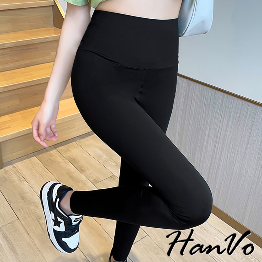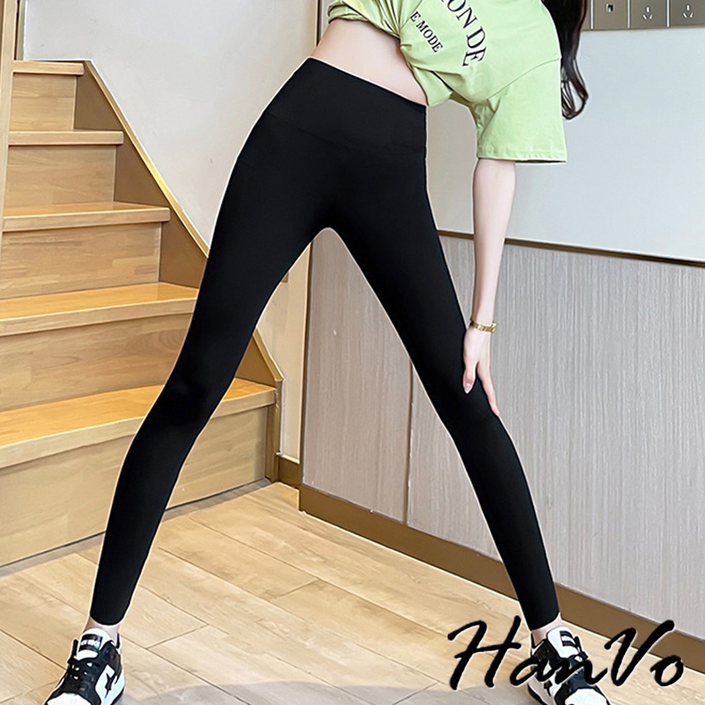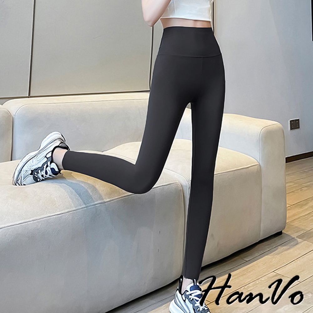 【HanVo】緊身薄款9分鯊魚褲 高腰 瑜珈褲 收腹提臀 韓版百搭下著 女生衣著 A04-2915黑色|深灰PantsHanVo Wear Collection