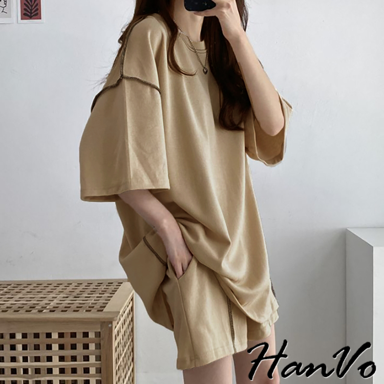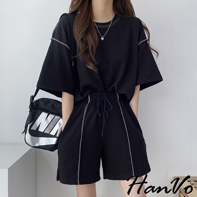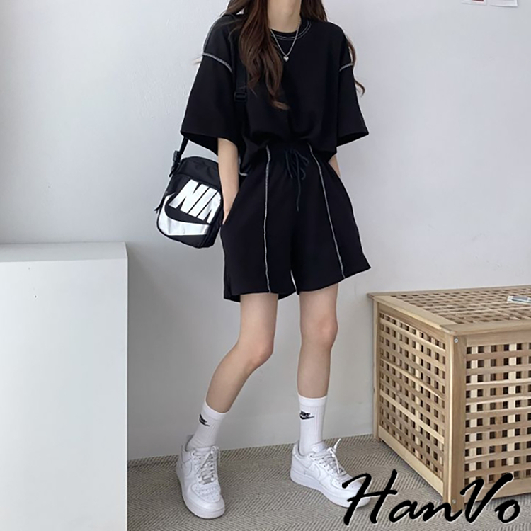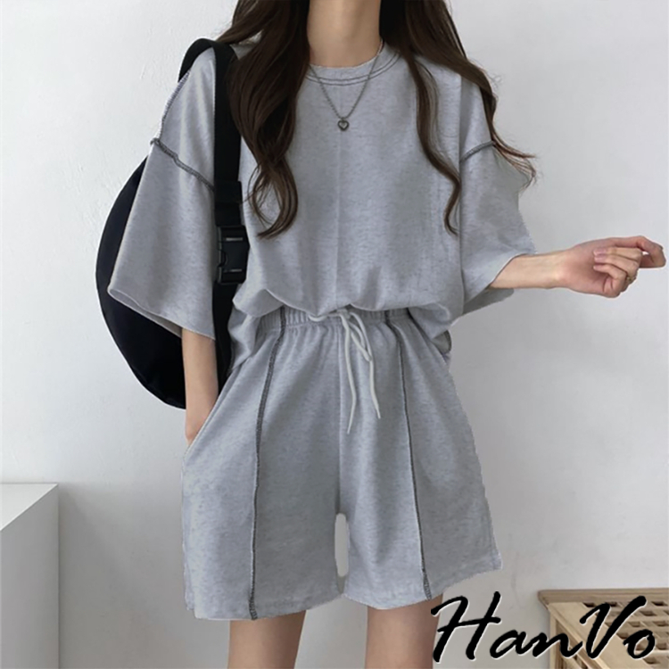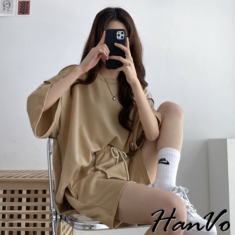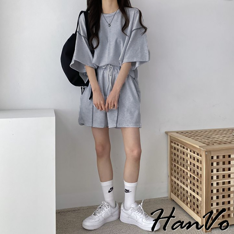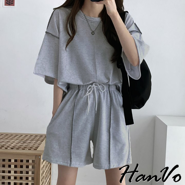 【HanVo】車線造型兩件休閒套裝 休閒圓領舒適短袖短褲套裝 棉質 女生上衣 韓系女裝 女生衣著 A08-5948淺灰色|黑色|卡其PajamasHanVo Wear Collection