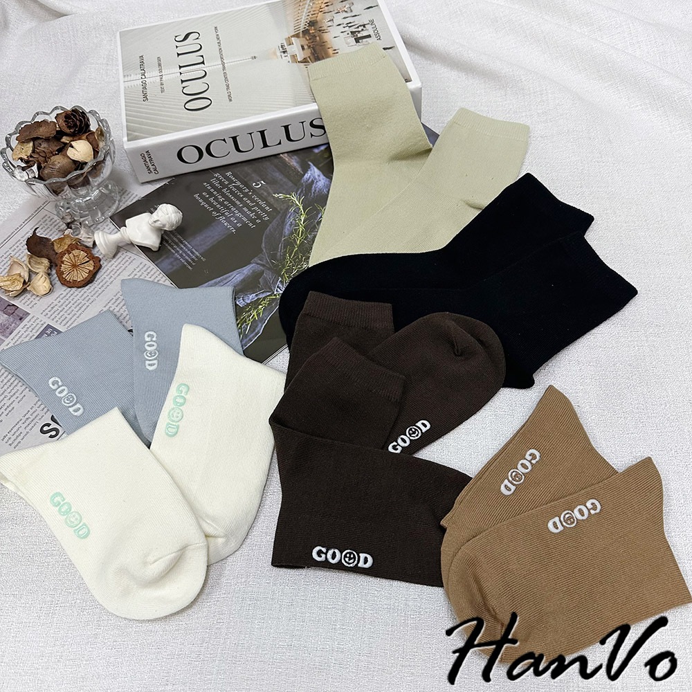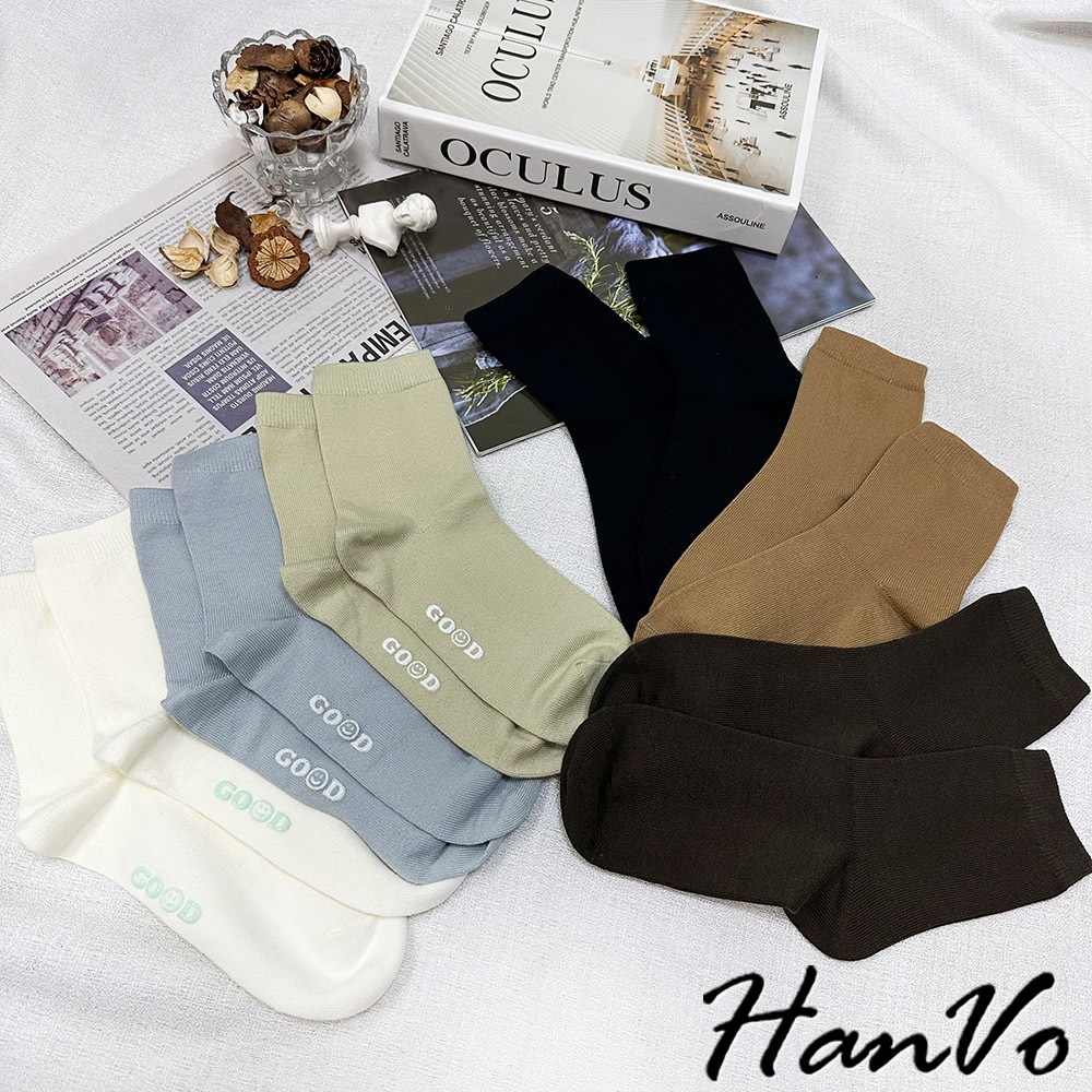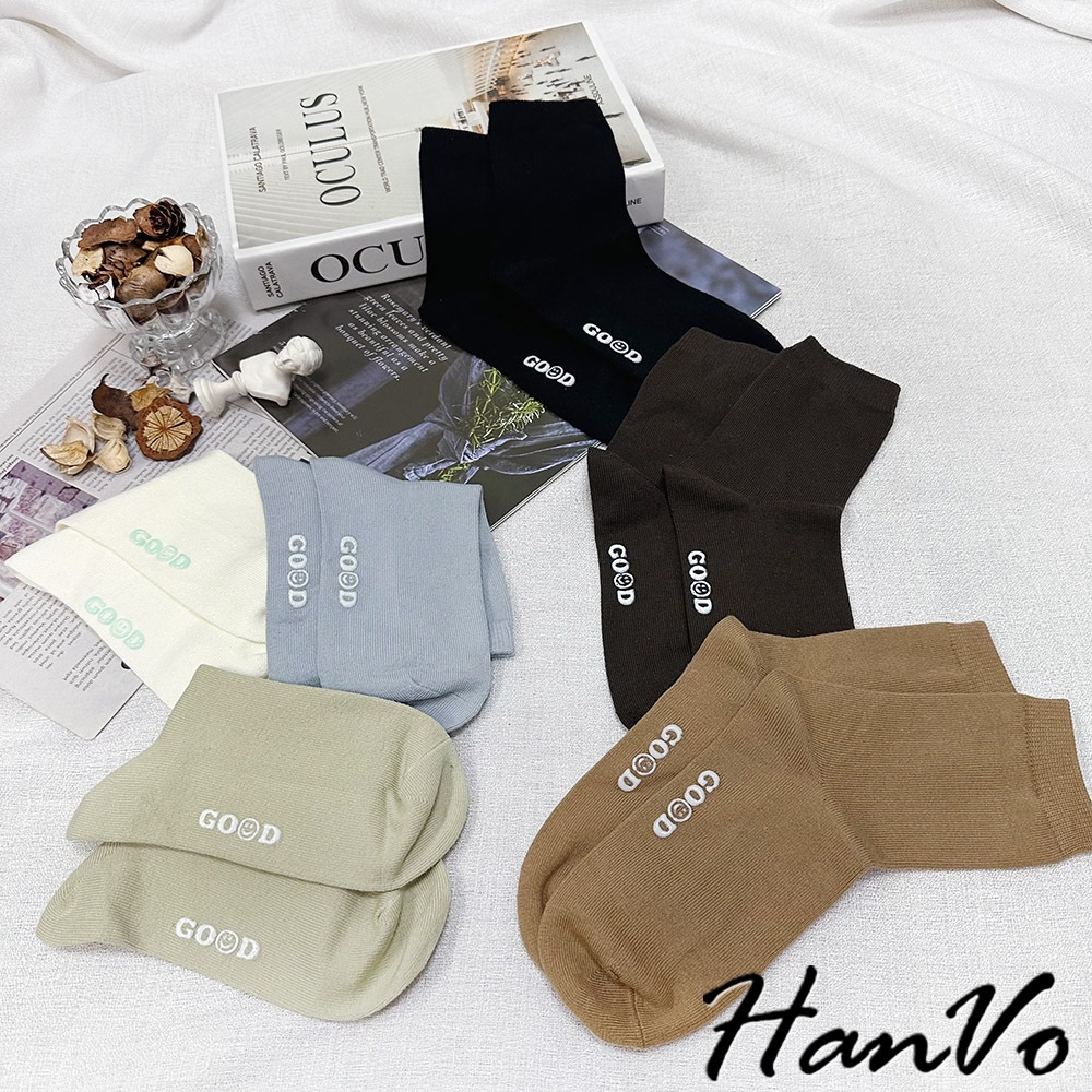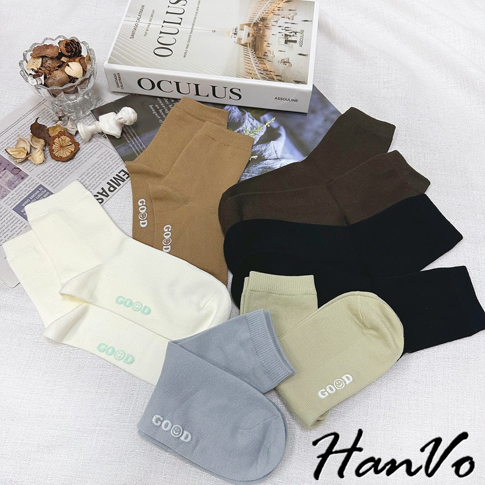 【HanVo】腳底GOOD字母笑臉中筒襪 純色簡約吸濕排汗透氣 韓系時尚休閒襪 女生配件 A12-6286柔霧藍|蜜瓜綠|深木咖|奶油白|夜空黑|栗香棕SocksHanVo Wear Collection
