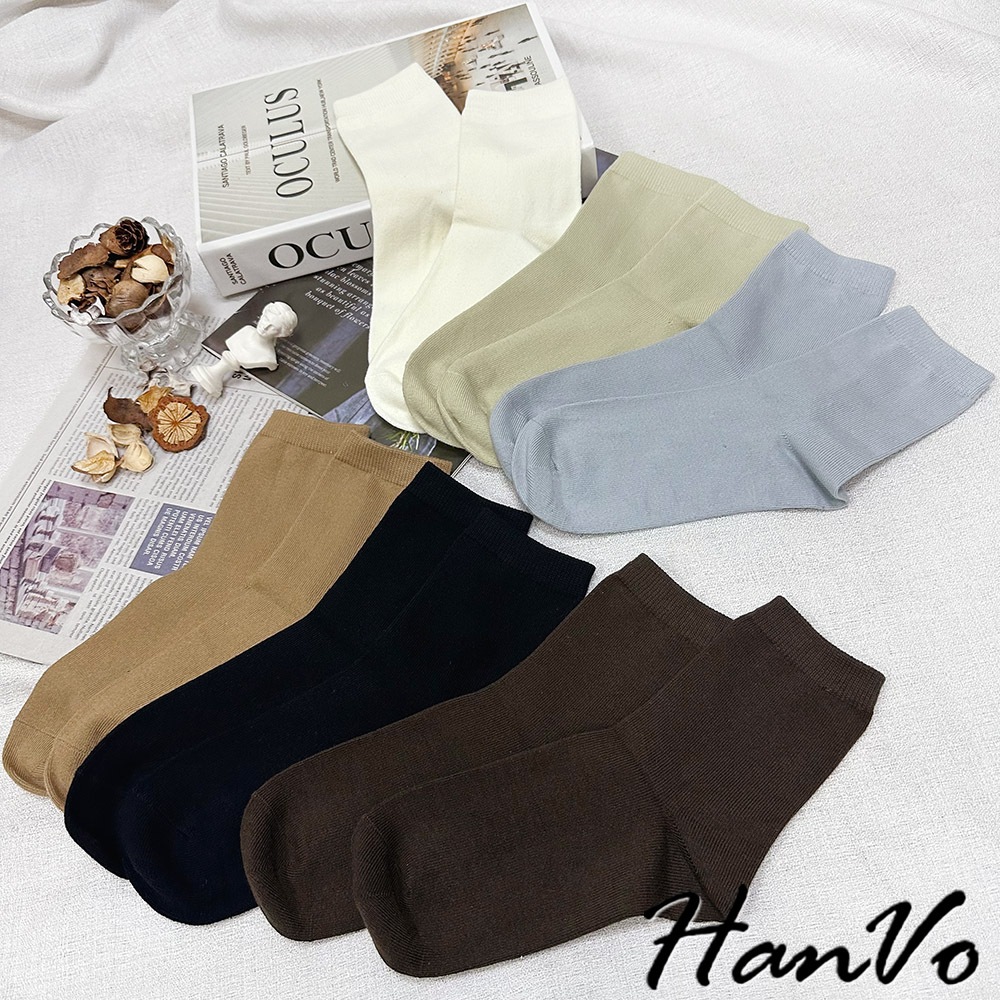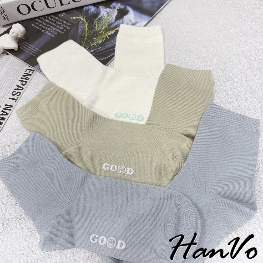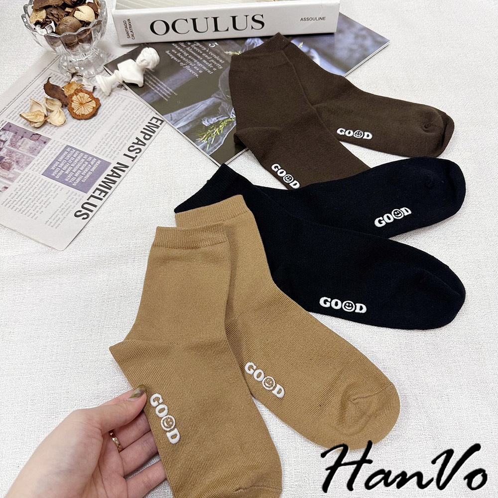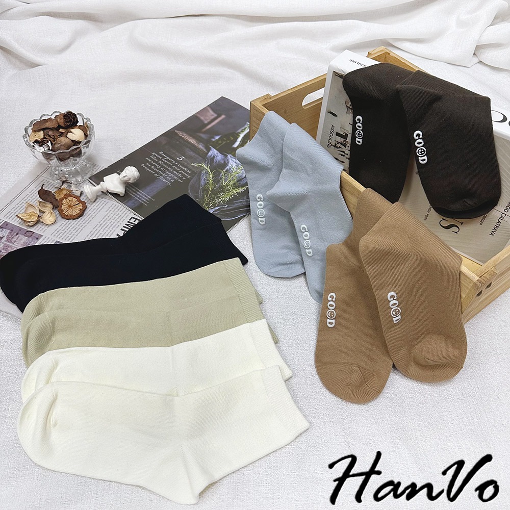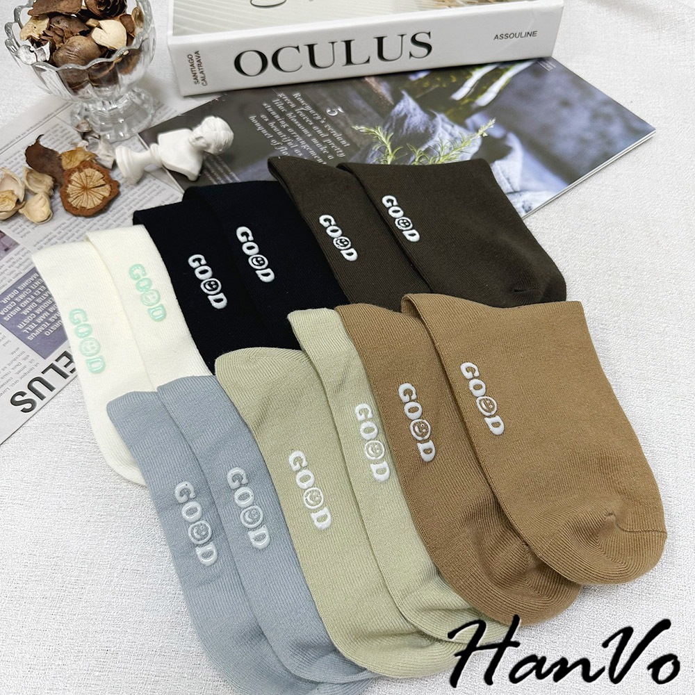【HanVo】腳底GOOD字母笑臉中筒襪 純色簡約吸濕排汗透氣 韓系時尚休閒襪 女生配件 A12-6286柔霧藍|蜜瓜綠|深木咖|奶油白|夜空黑|栗香棕SocksHanVo Wear Collection