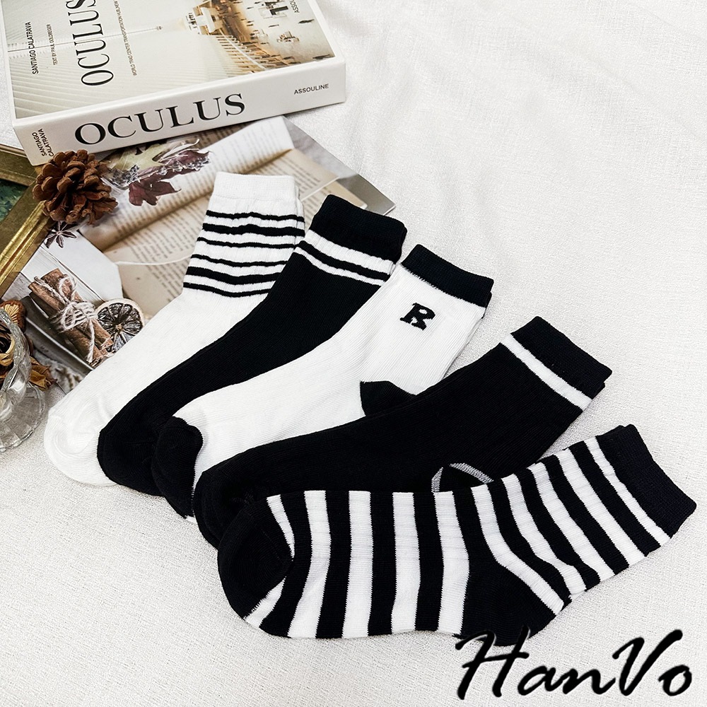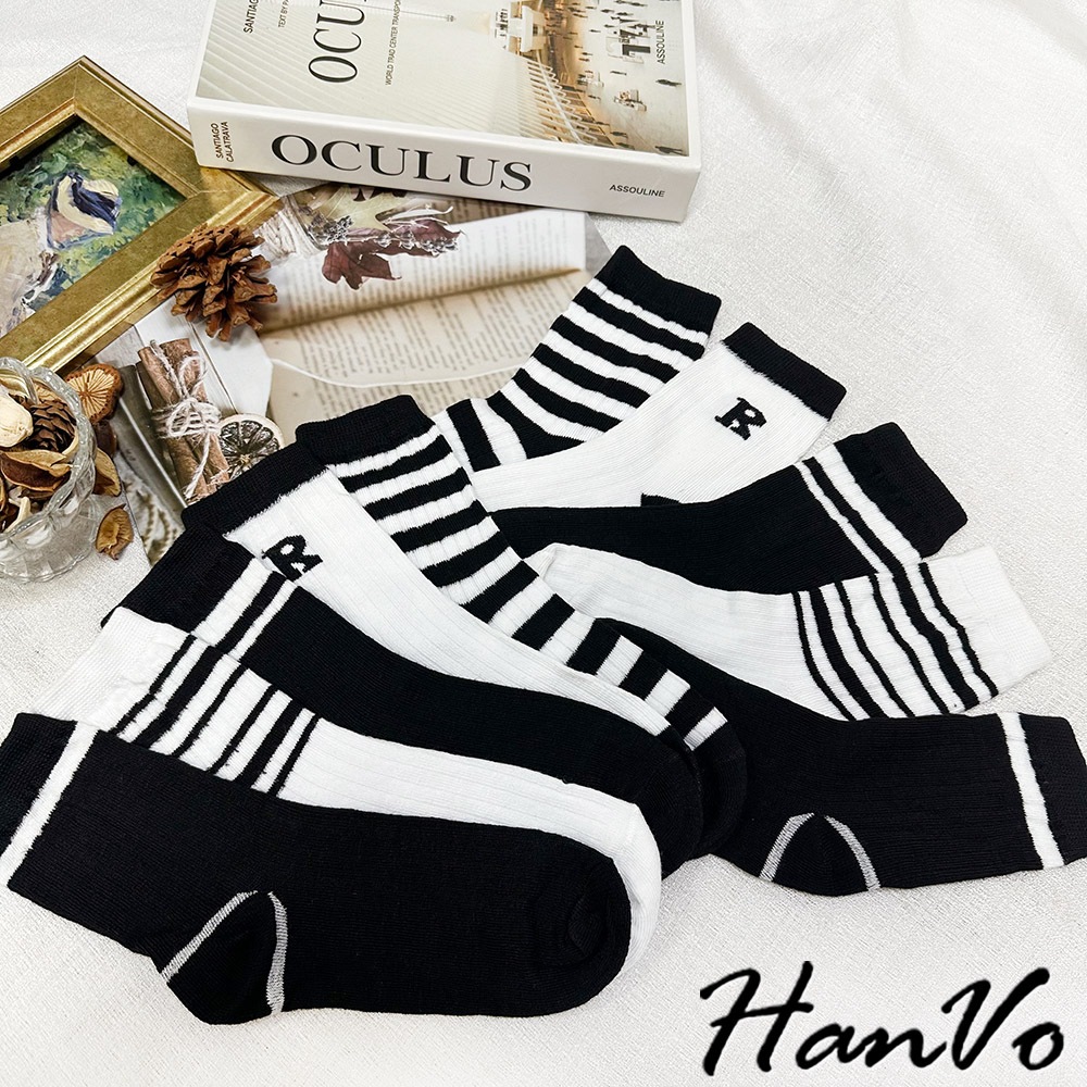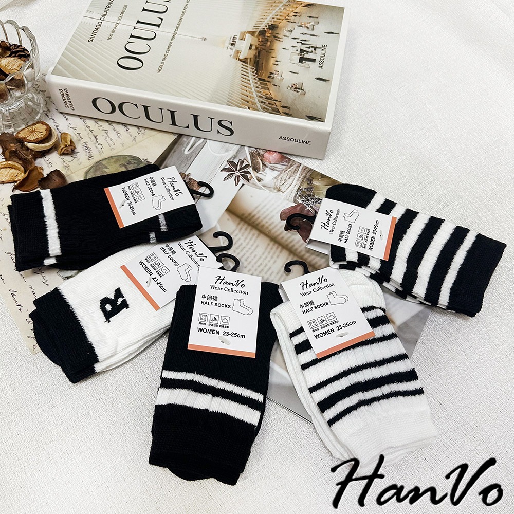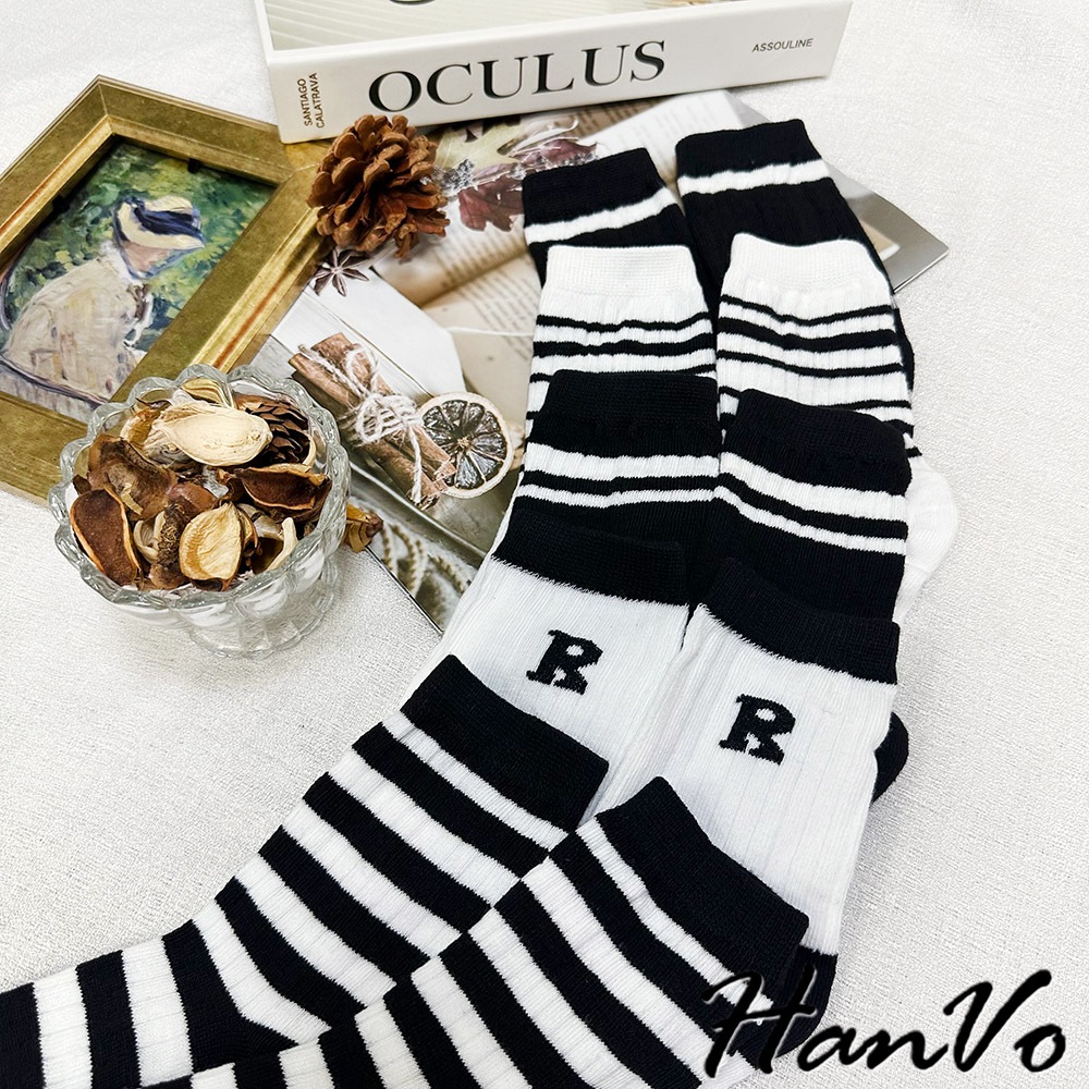 【HanVo】黑白條紋百搭休閒女襪 透氣舒適棉質中筒襪 襪子 韓系潮流休閒襪 女生配件 A12-6353黑底白條紋|白底黑條紋|黑白寬條紋|黑白細條紋|白底字母RSocksHanVo Wear Collection