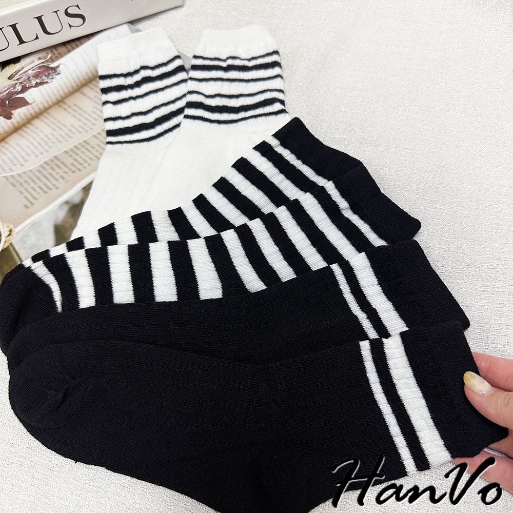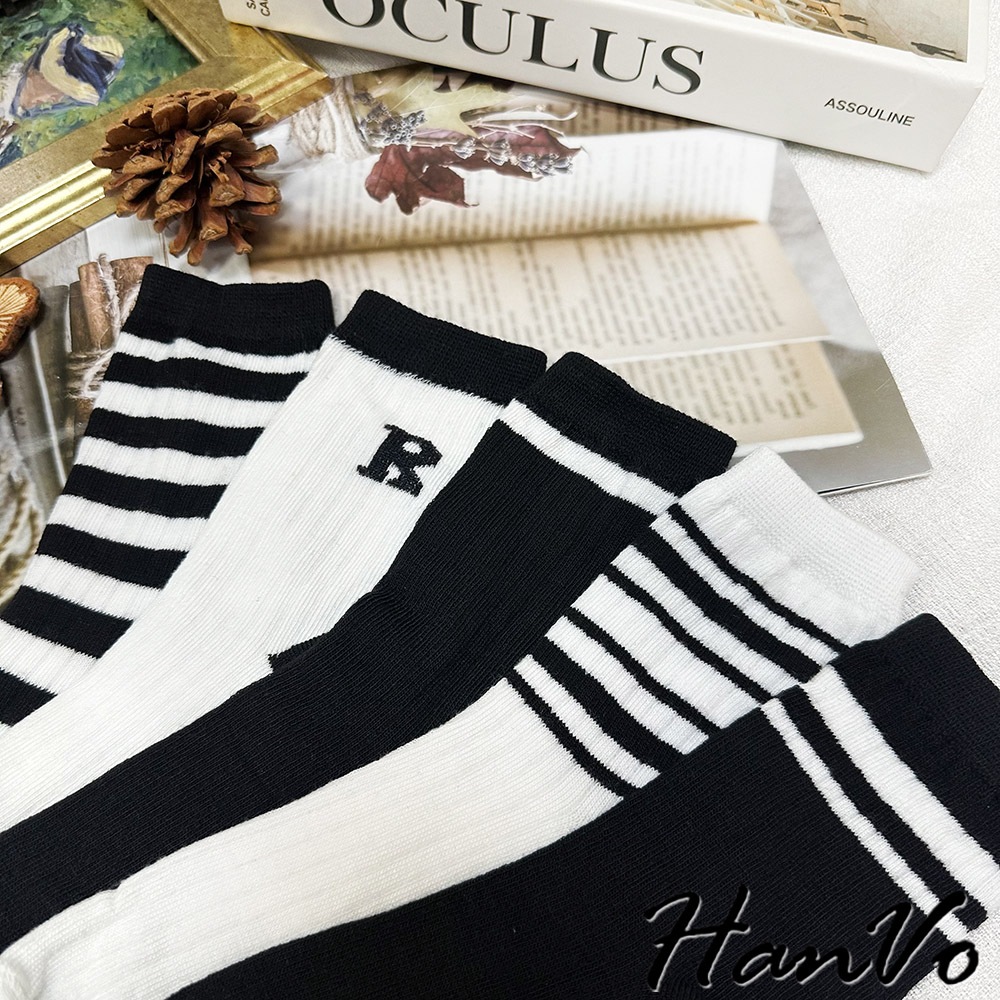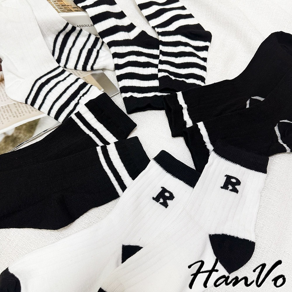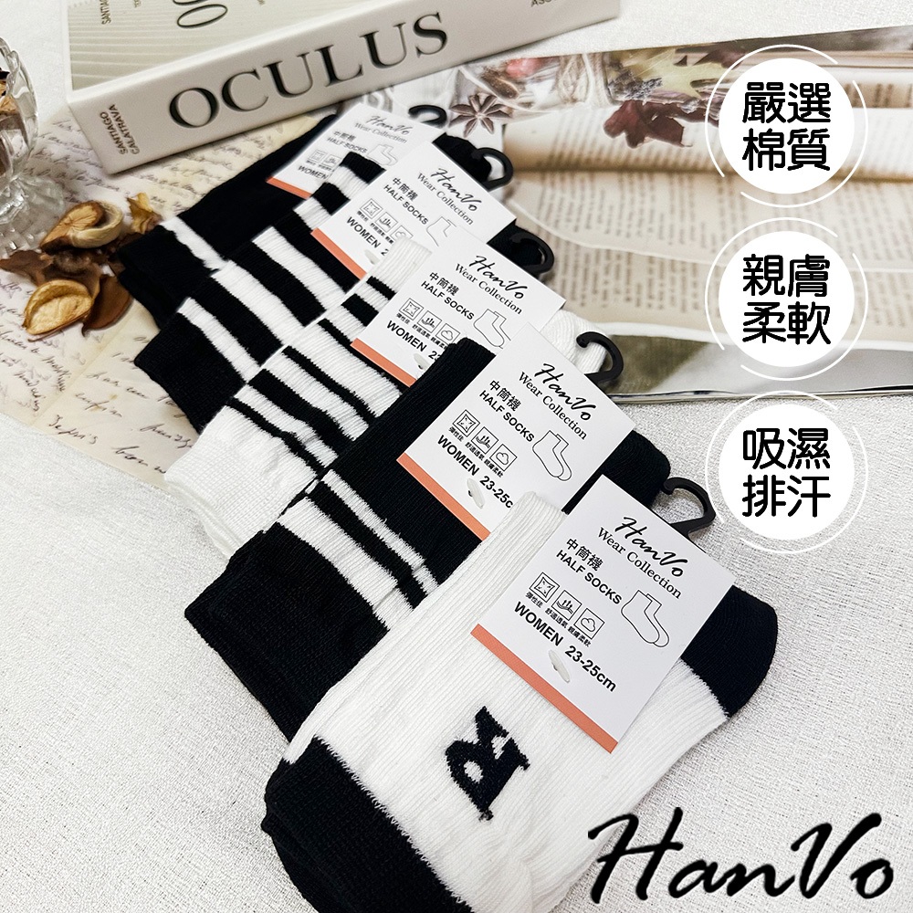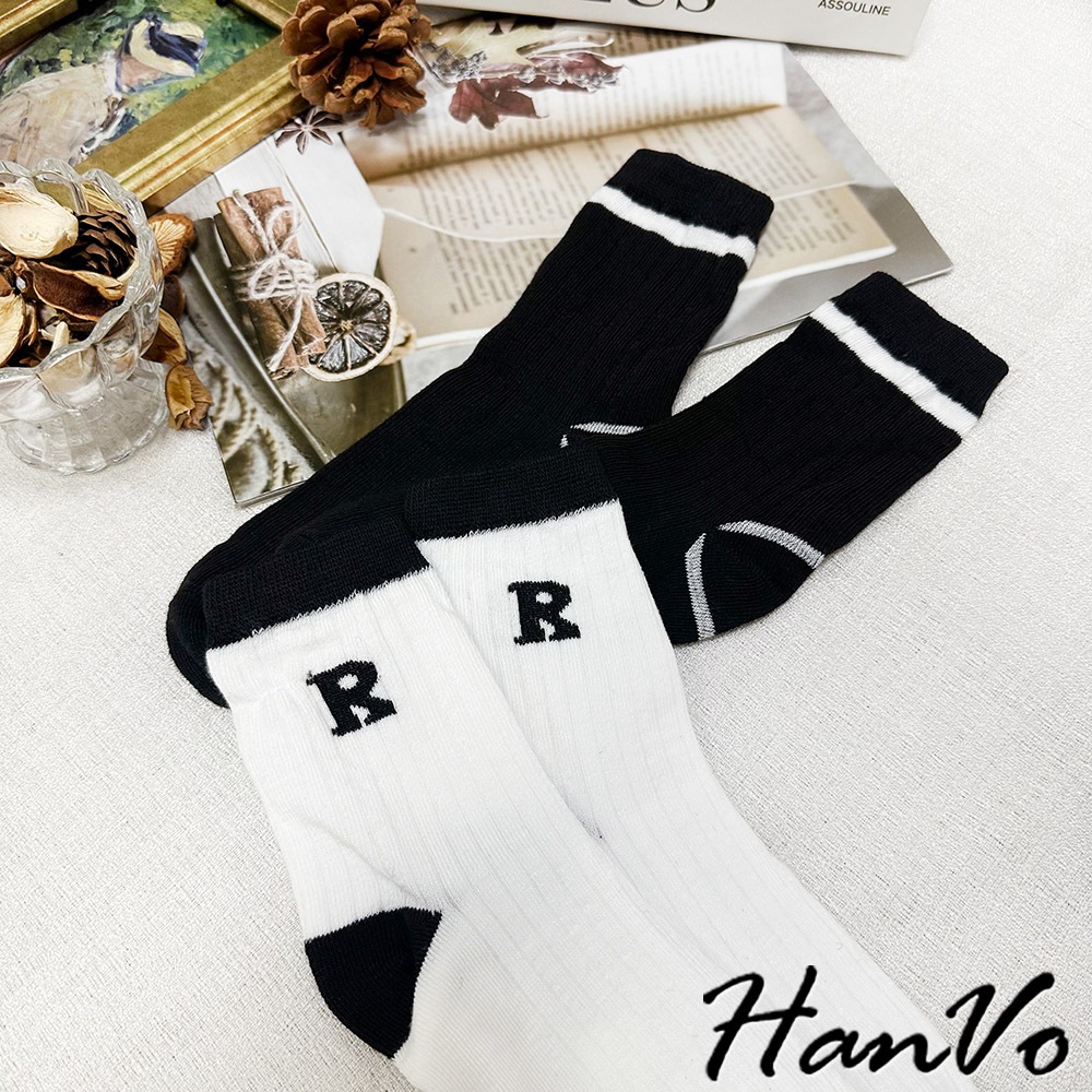 【HanVo】黑白條紋百搭休閒女襪 透氣舒適棉質中筒襪 襪子 韓系潮流休閒襪 女生配件 A12-6353黑底白條紋|白底黑條紋|黑白寬條紋|黑白細條紋|白底字母RSocksHanVo Wear Collection