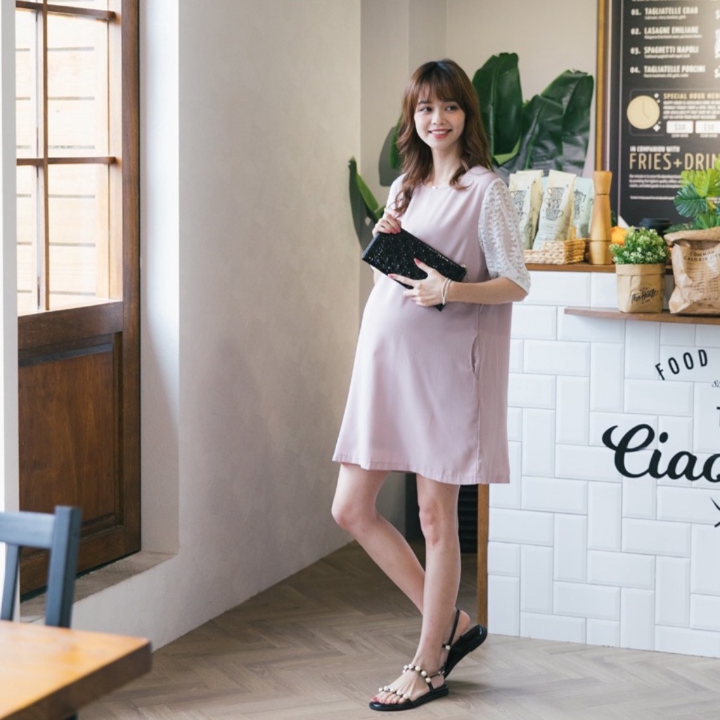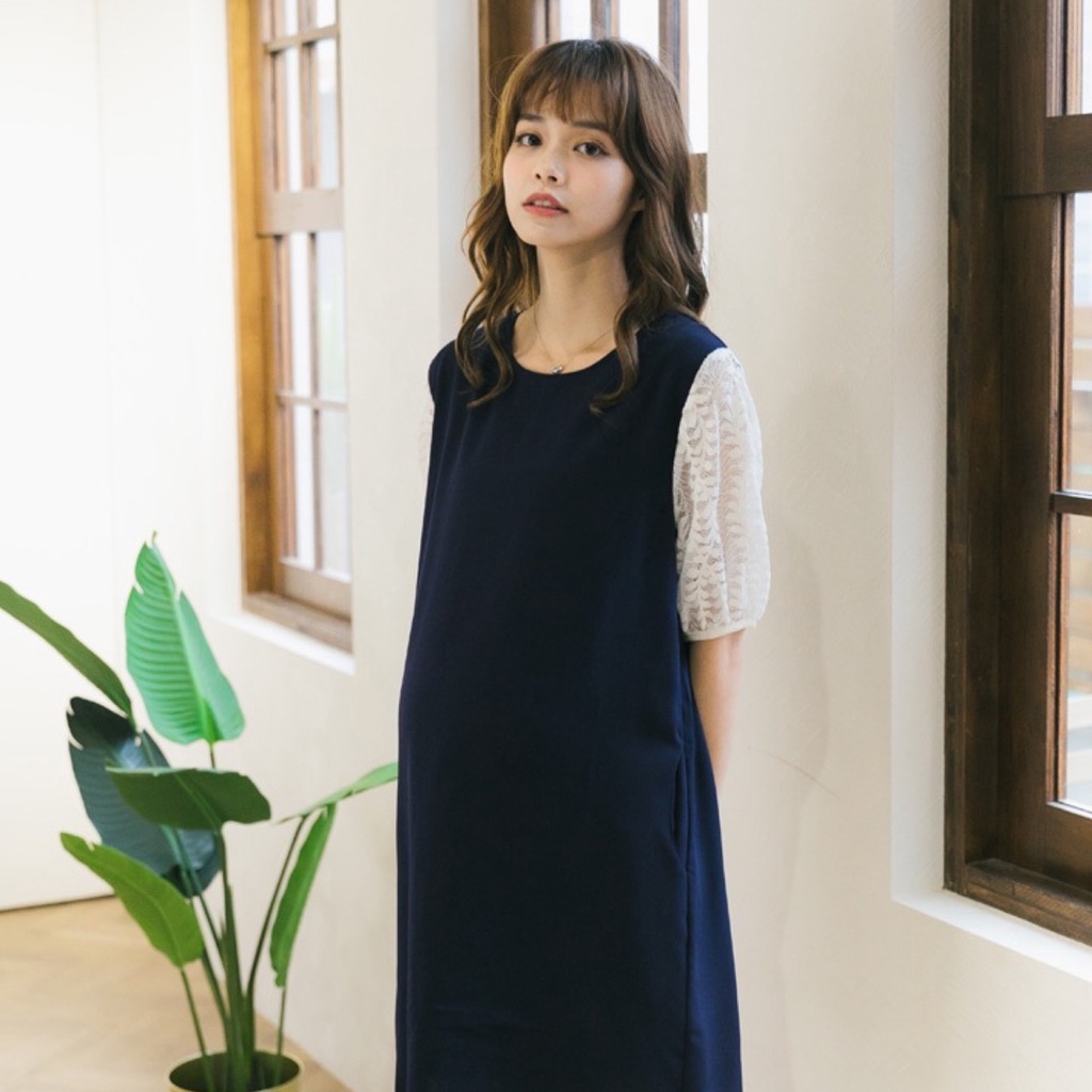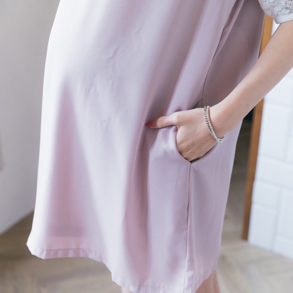 Mamamia孕婦裝 素面五分袖蕾絲雪紡孕婦裝 洋裝 短袖 孕婦裙 孕婦連身裙 連身洋裝 孕婦洋裝 [D7041]粉,M|粉,L|藍,M|藍,LMaternity DressesMamamia孕婦裝