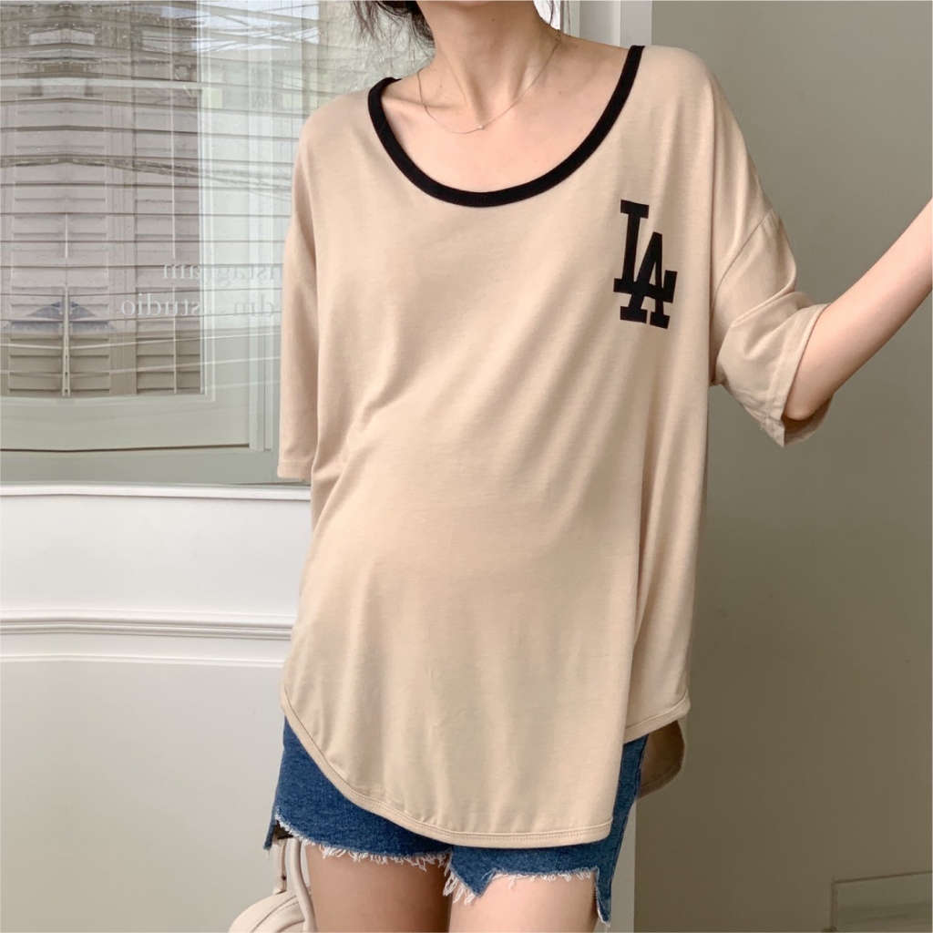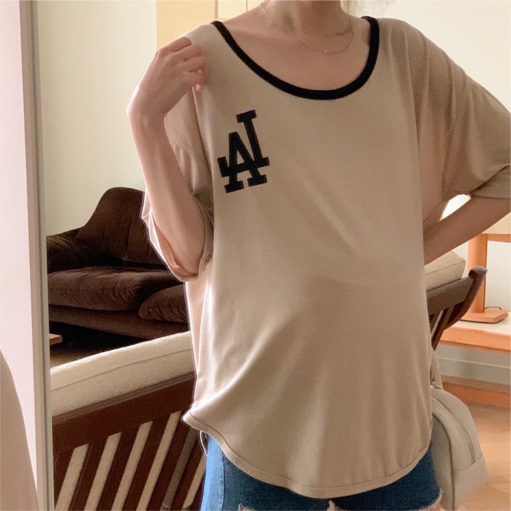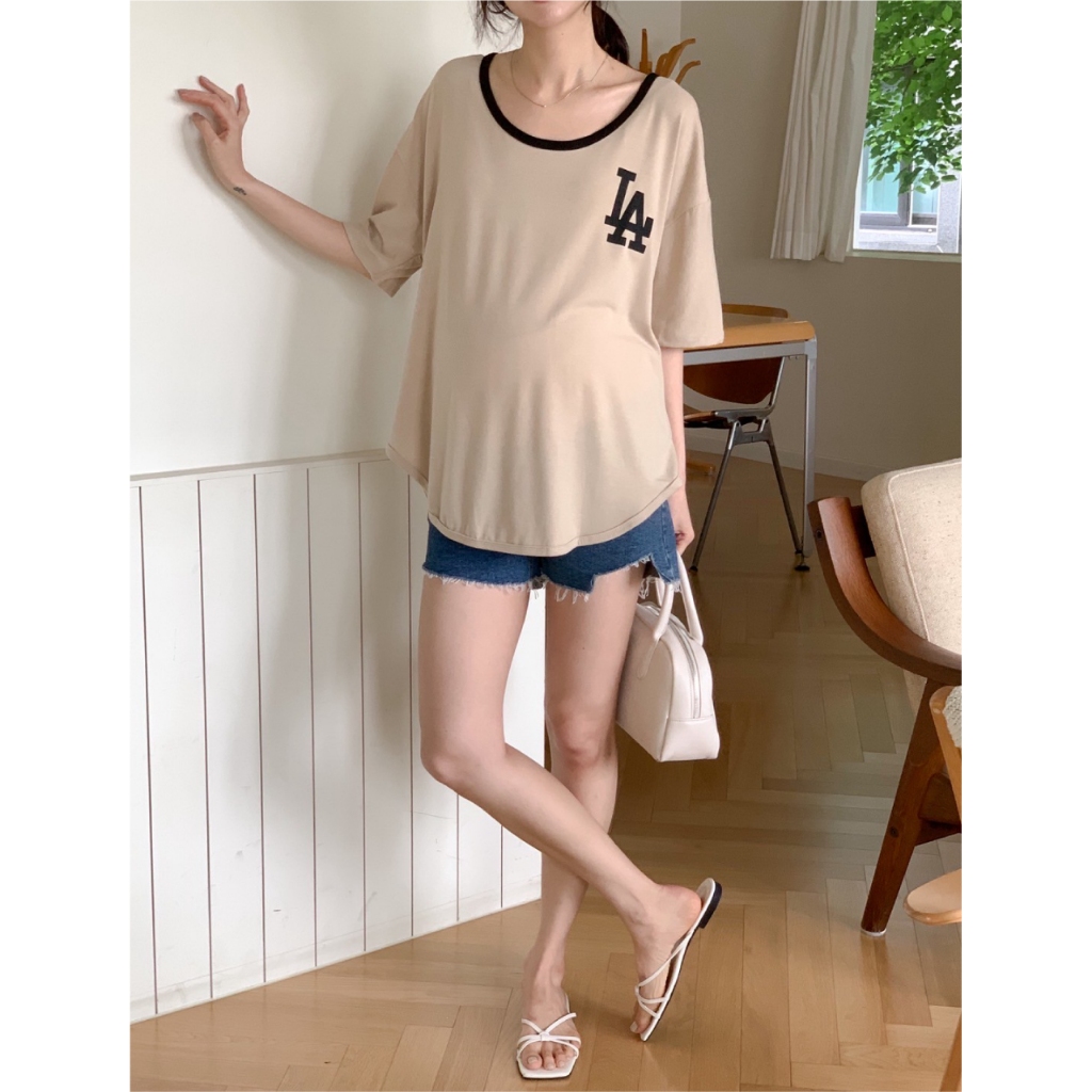 Mamamia孕婦裝 撞色俐落感LA印花上衣 正韓製 孕婦裝 短袖 寬T T恤 [C3345]奶茶|黑Maternity TopsMamamia孕婦裝