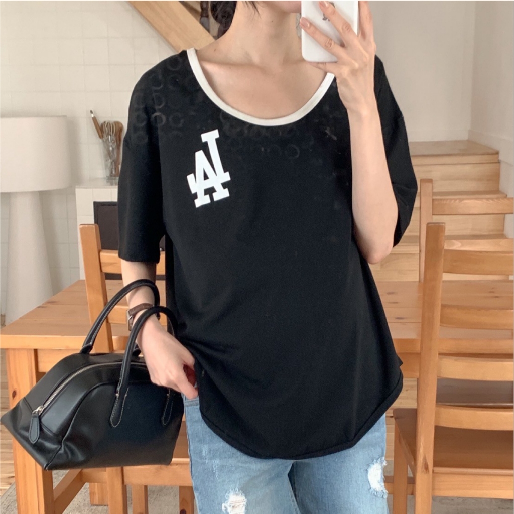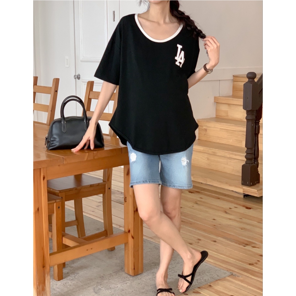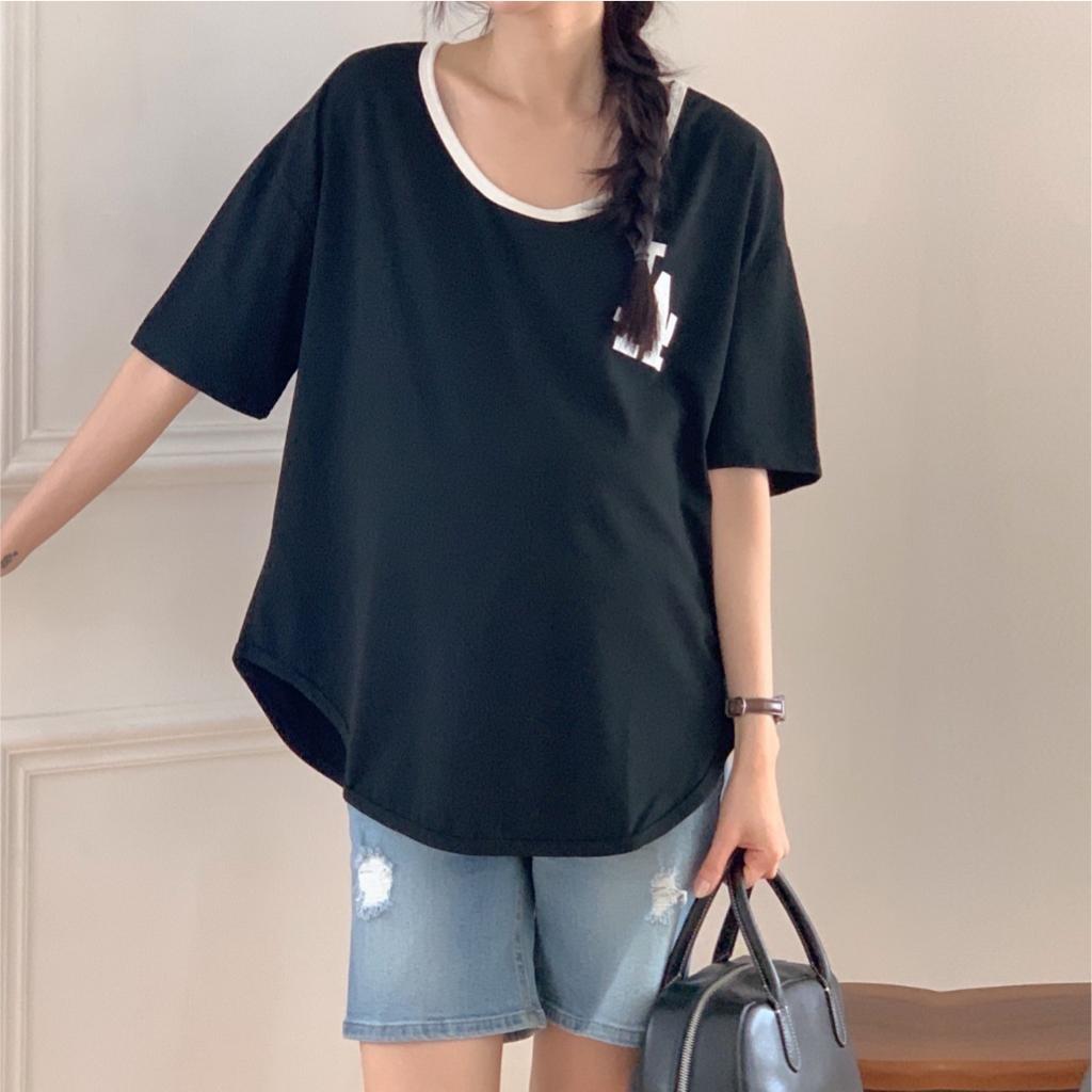 Mamamia孕婦裝 撞色俐落感LA印花上衣 正韓製 孕婦裝 短袖 寬T T恤 [C3345]奶茶|黑Maternity TopsMamamia孕婦裝