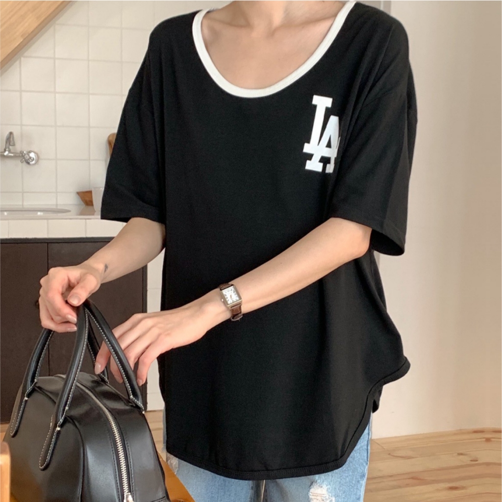 Mamamia孕婦裝 撞色俐落感LA印花上衣 正韓製 孕婦裝 短袖 寬T T恤 [C3345]