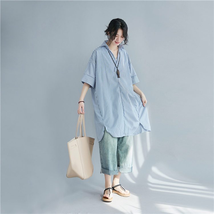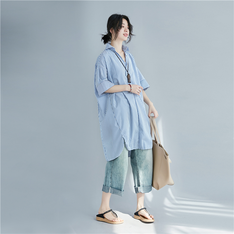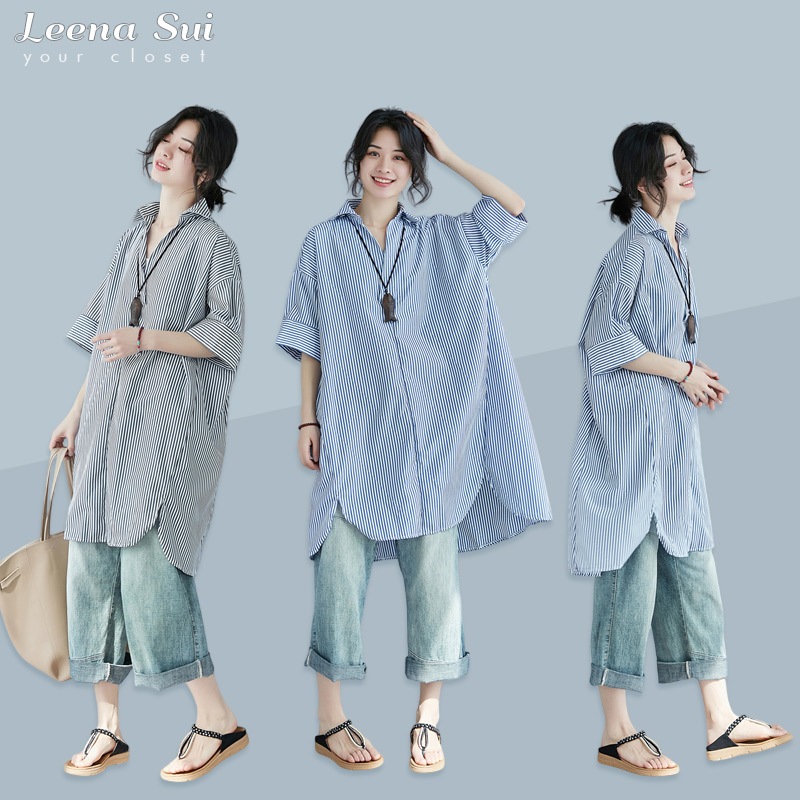 寬鬆條紋大尺碼中長襯衫 028085深藍|淺藍|黑Shirts & BlousesLeenaSui ~台灣賣家 隔日到貨