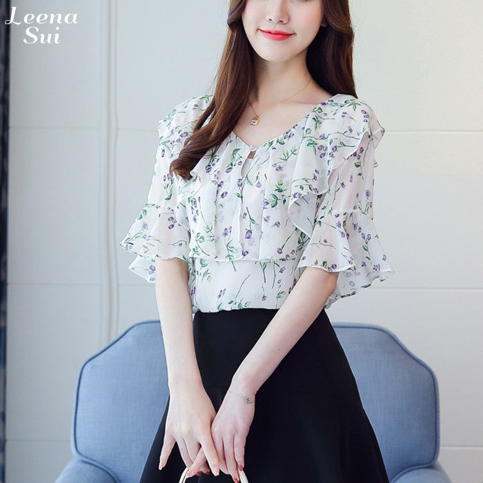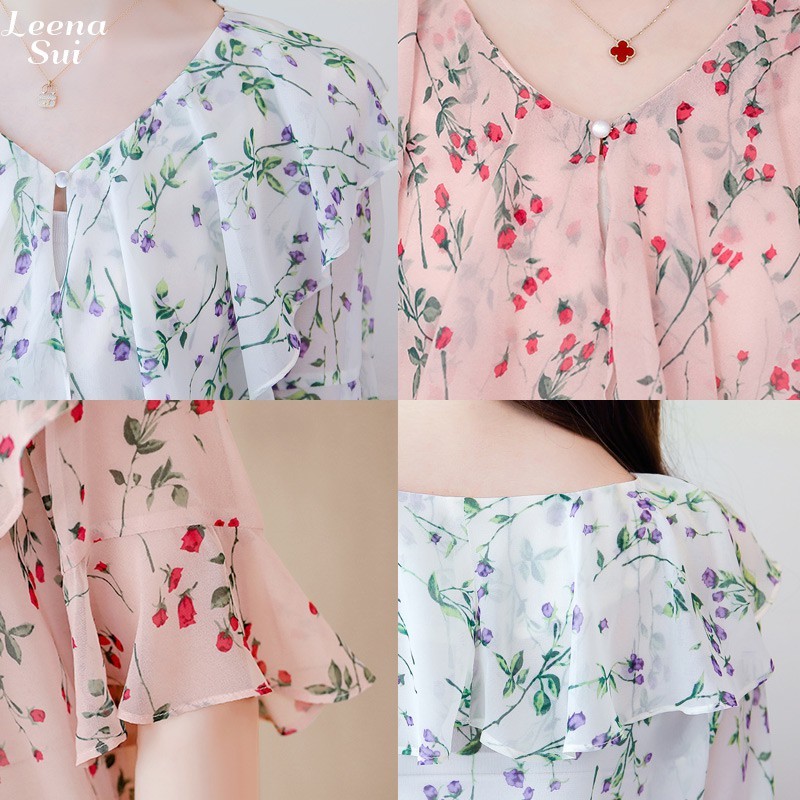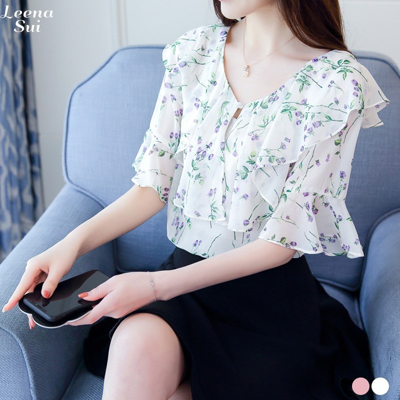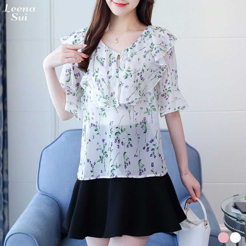 襯衫 雪紡上衣 荷葉袖上衣 飄逸碎花荷葉袖遮肚上衣 028226白|粉Shirts & BlousesLeenaSui ~台灣賣家 隔日到貨