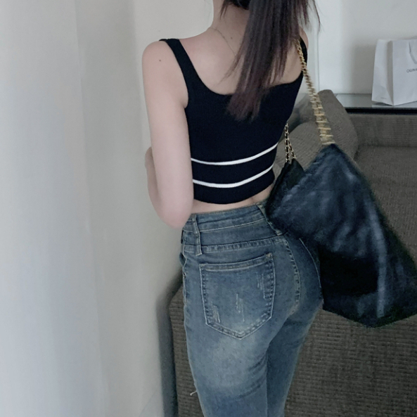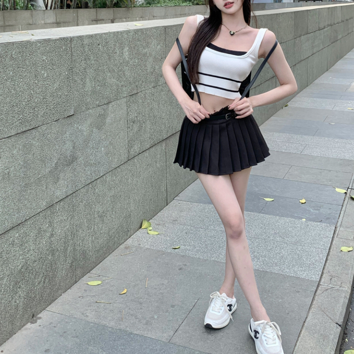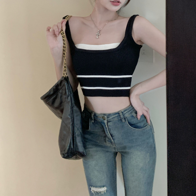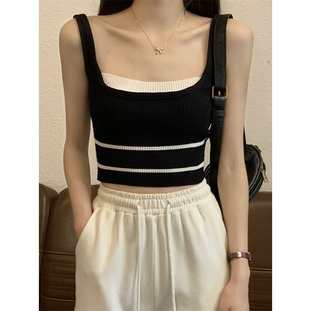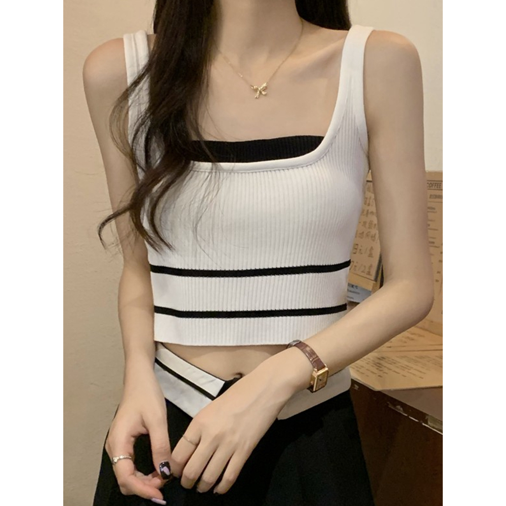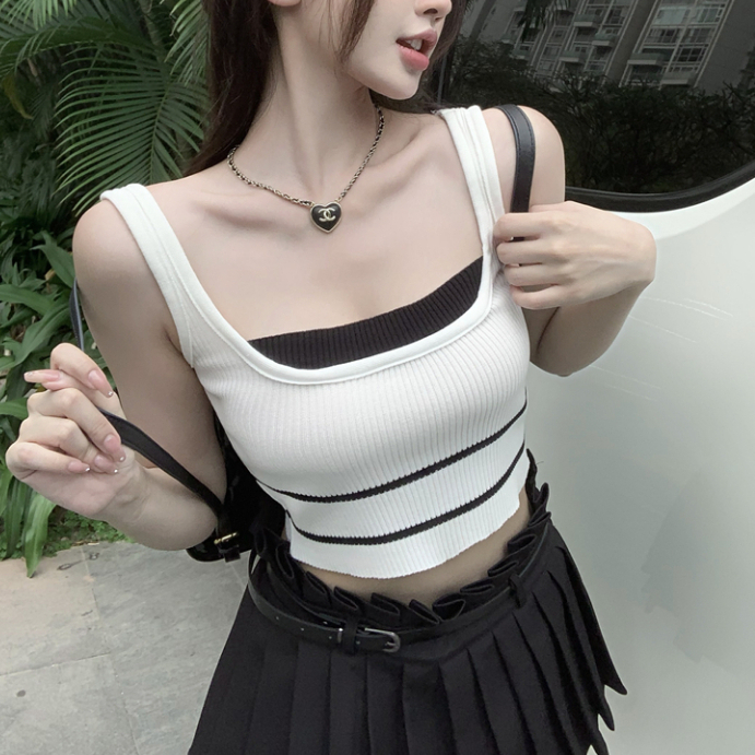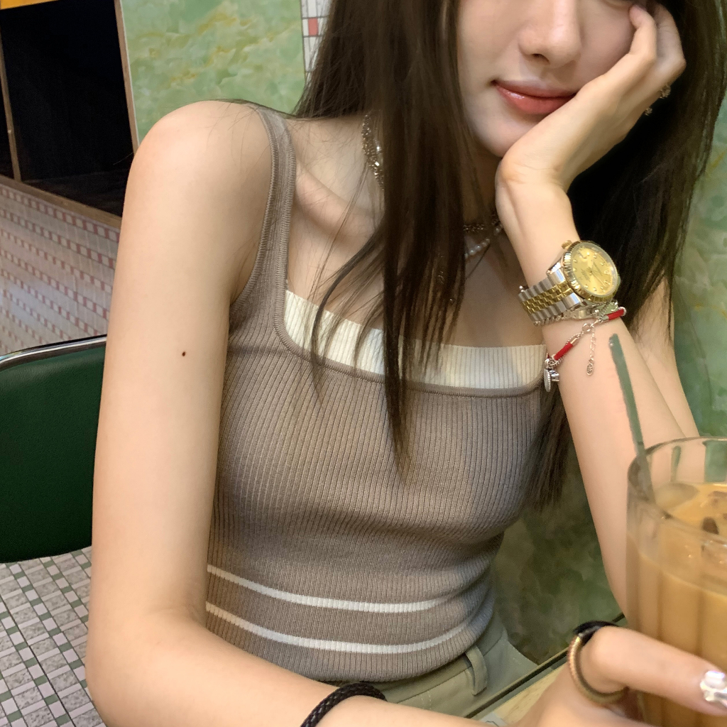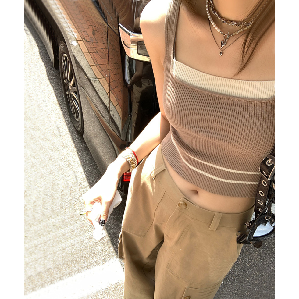 短版背心 短版上衣 女生大U領上衣 假兩件撞色針織吊帶小背心 短款無袖上衣 024217駝|黑|白Tanks & CamisolesLeenaSui ~台灣賣家 隔日到貨