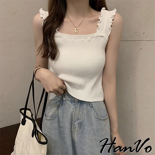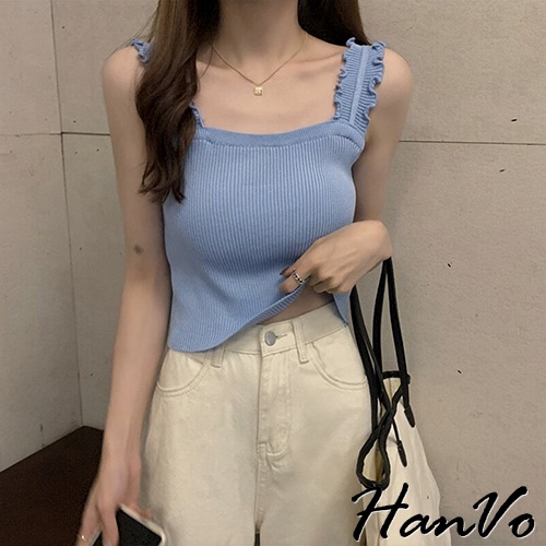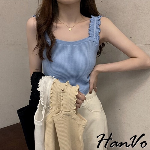 【HanVo】木耳肩帶短版針織背心 韓系休閒百搭圓領合身針織背心上衣 韓系女裝 女生衣著 A01-1347黑色|白色|水藍|杏色Tanks & CamisolesHanVo Wear Collection