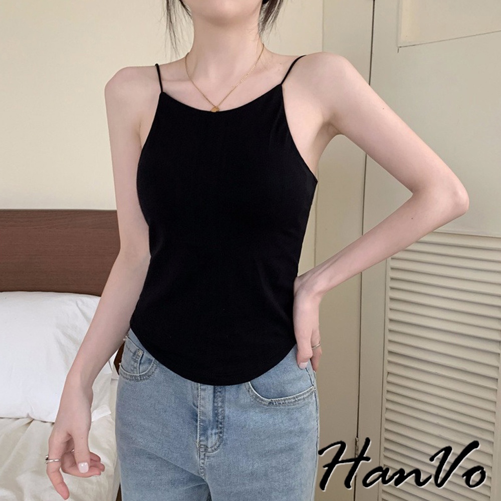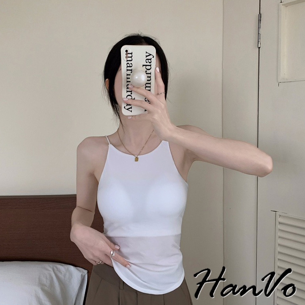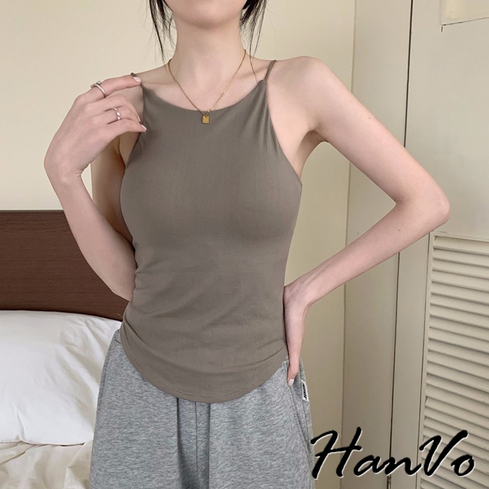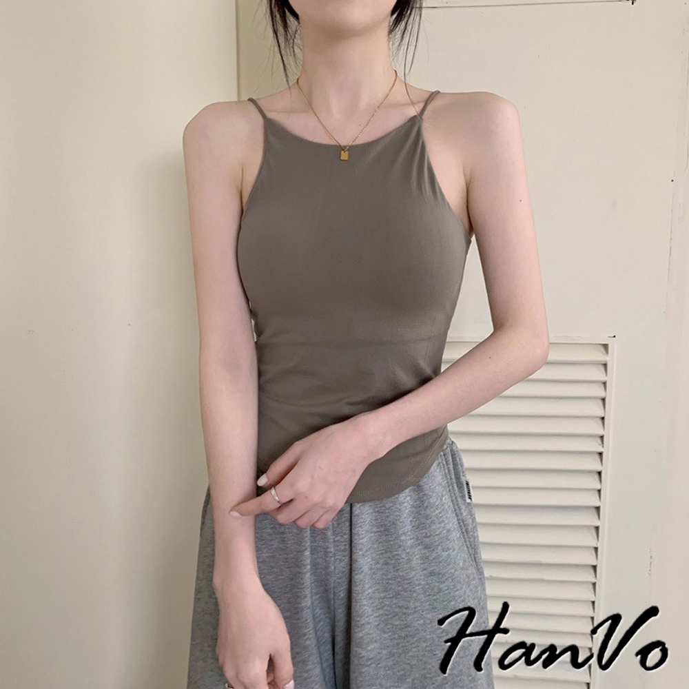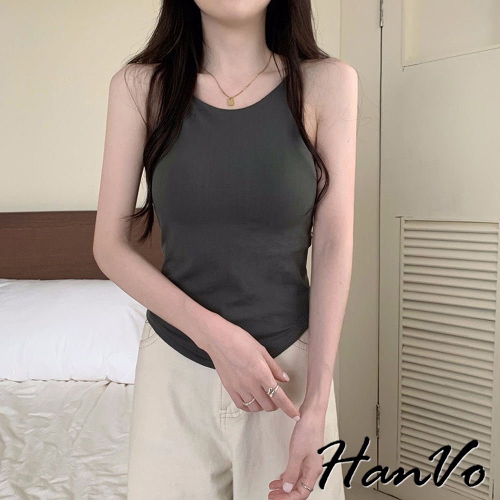 【HanVo】法式細肩挖背素色背心 別緻透氣親膚舒適小可愛 附不可拆胸墊 韓系女裝 女生衣著 A09-5073黑色|白色|深灰|咖色Tanks & CamisolesHanVo Wear Collection