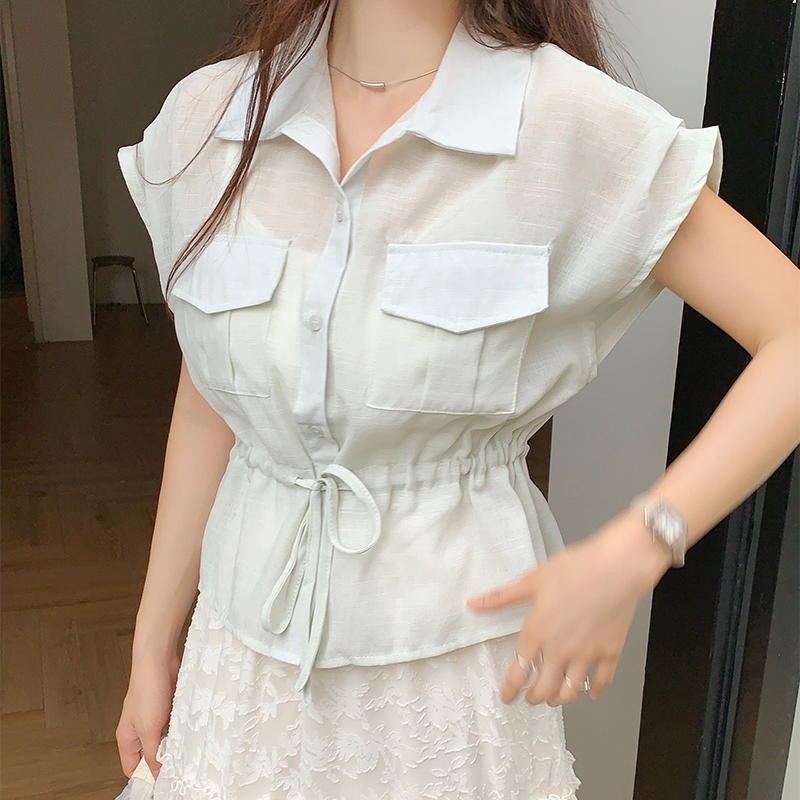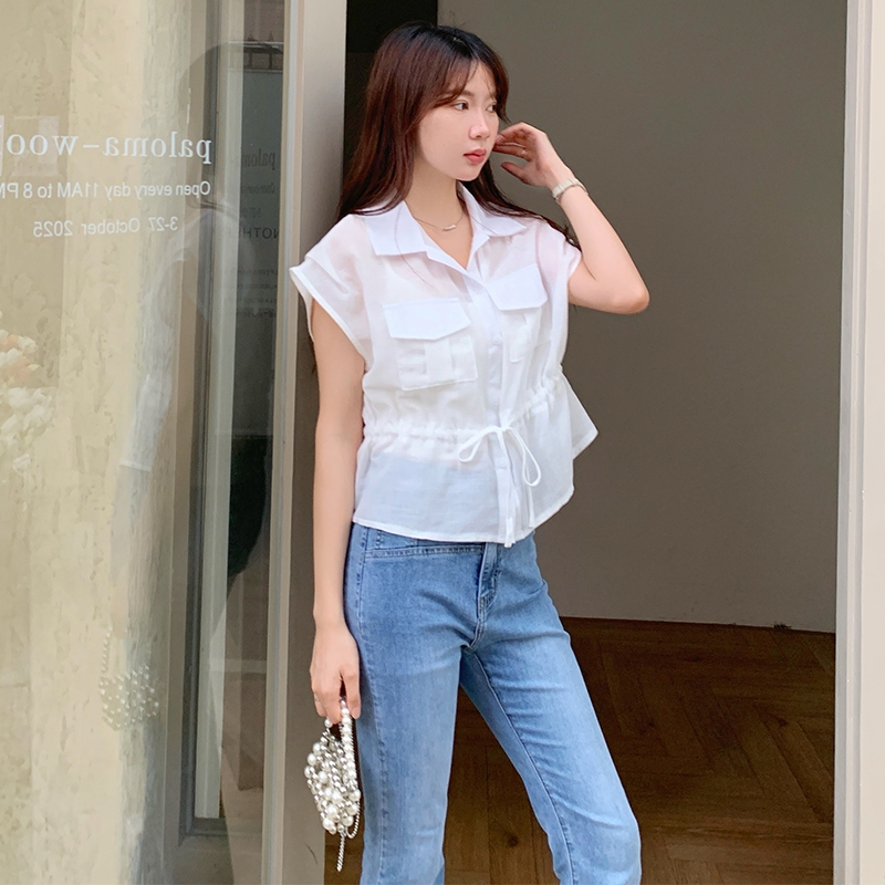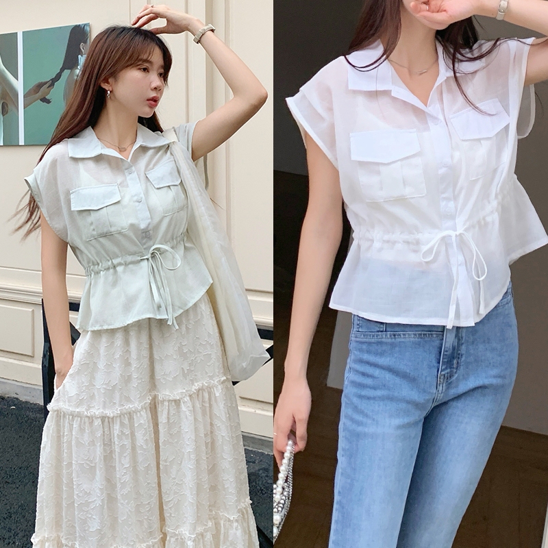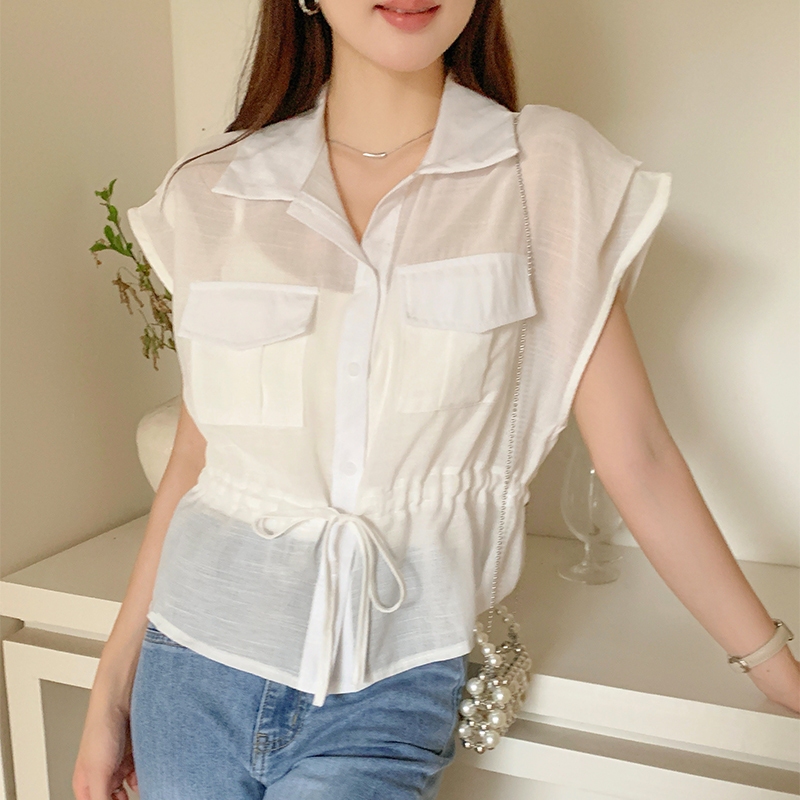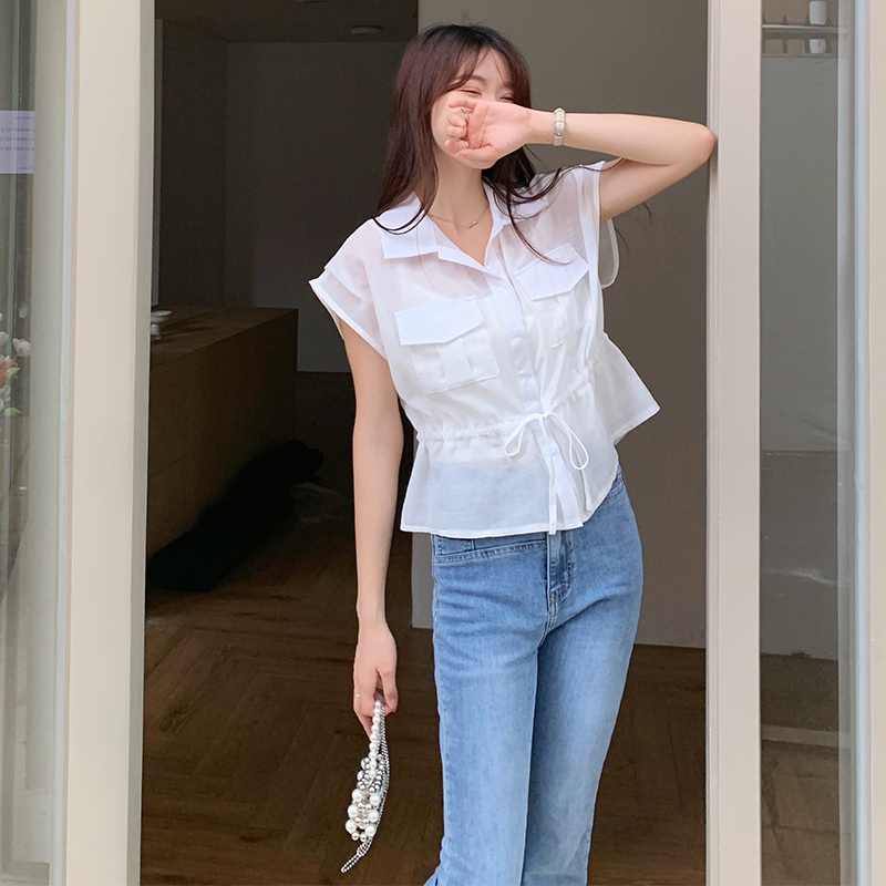 【HARPER】腰抽繩微透膚包袖襯衫 | 現貨 襯衫 包袖 短袖上衣【CLB42629J】白,F|灰綠,FShirts & BlousesHARPER