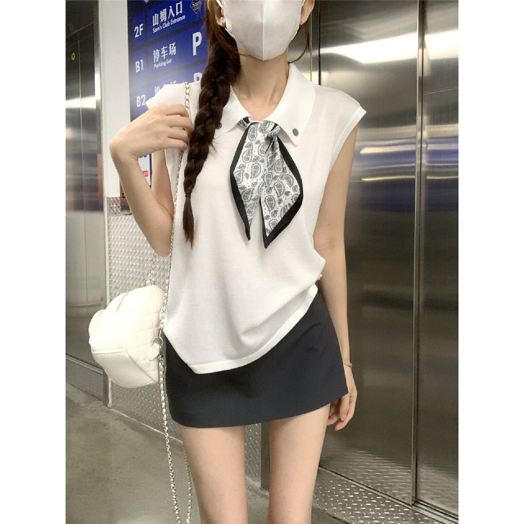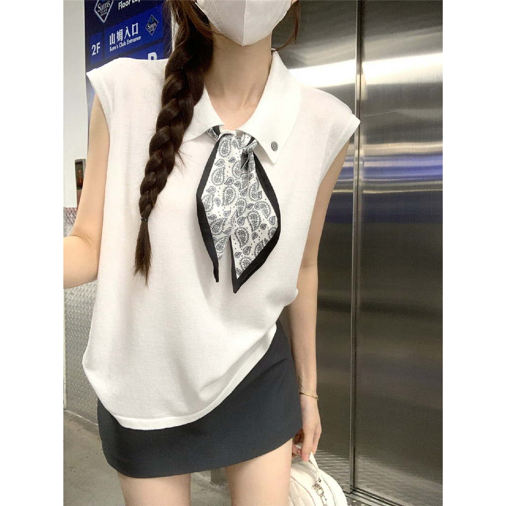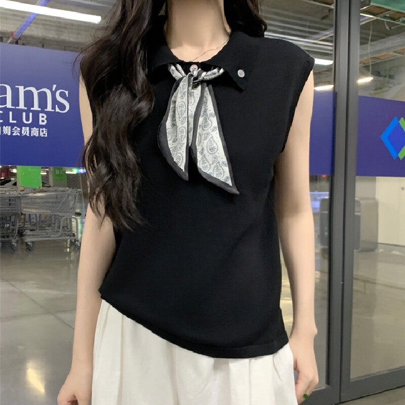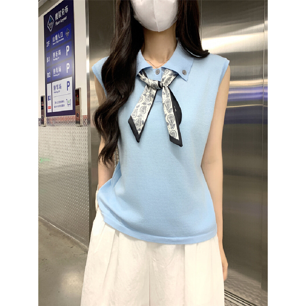 【HOT 本舖】 韓版翻領絲巾系帶無袖針織背心女夏季設計感時尚減齡