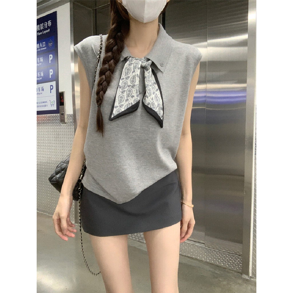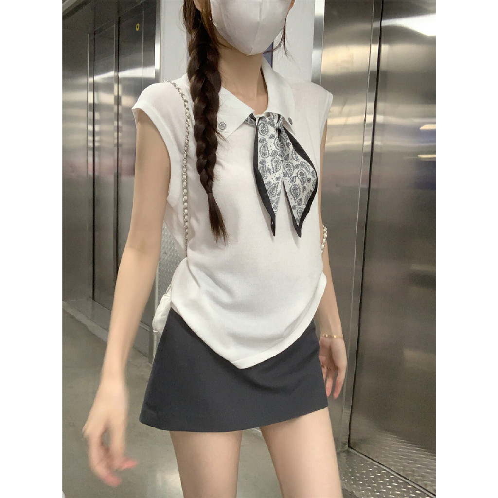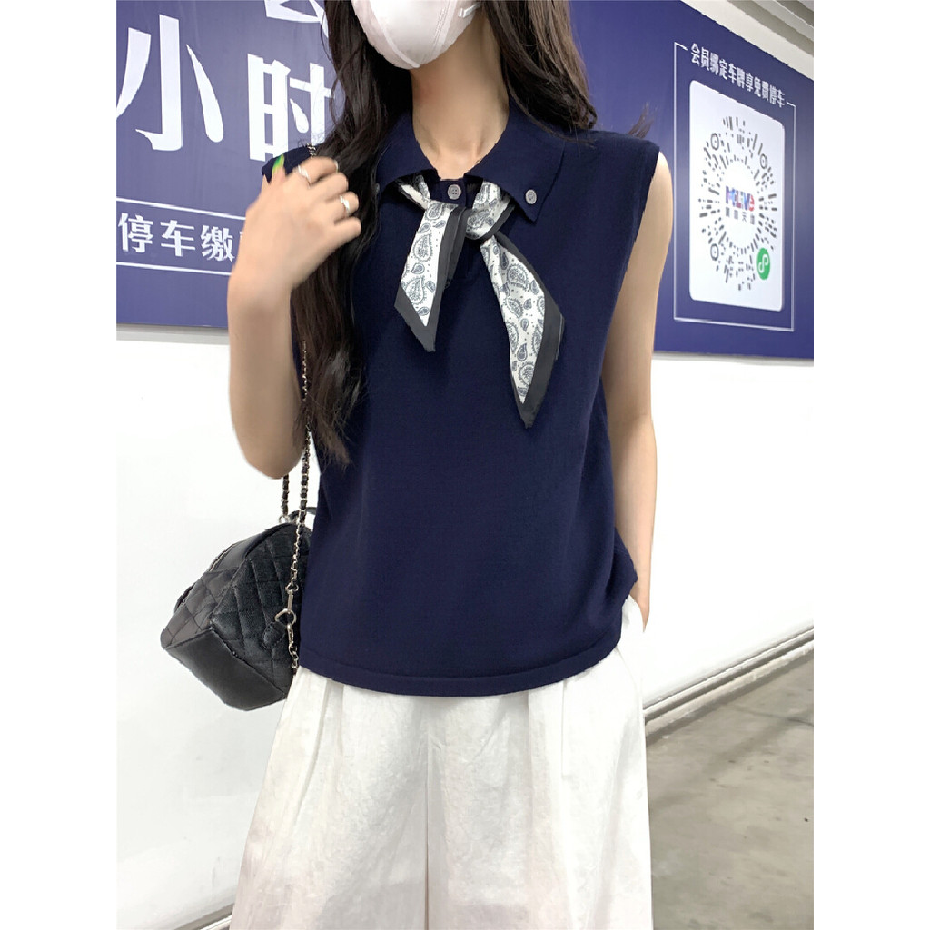 【HOT 本舖】 韓版翻領絲巾系帶無袖針織背心女夏季設計感時尚減齡
