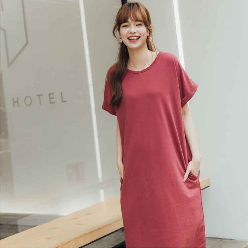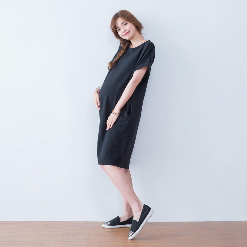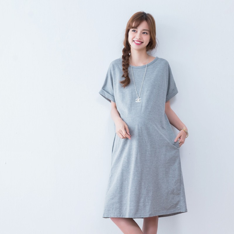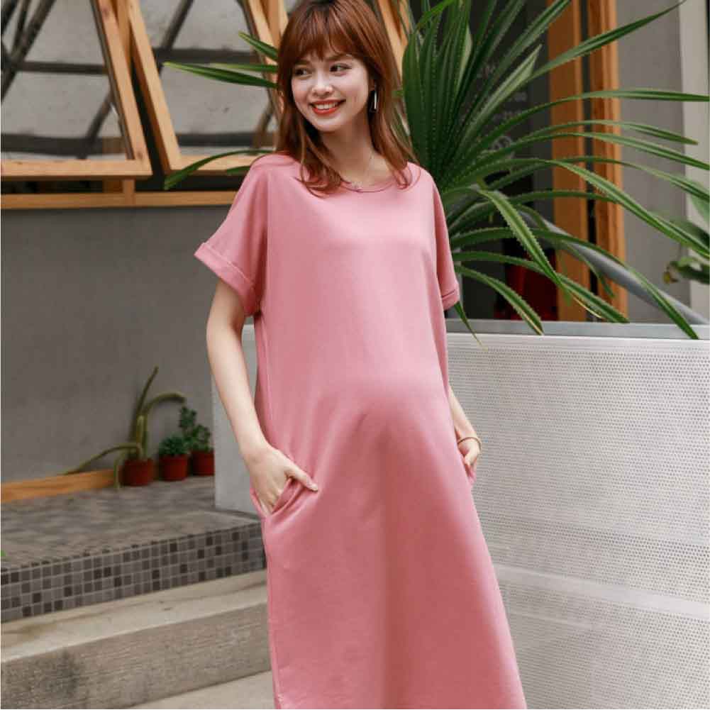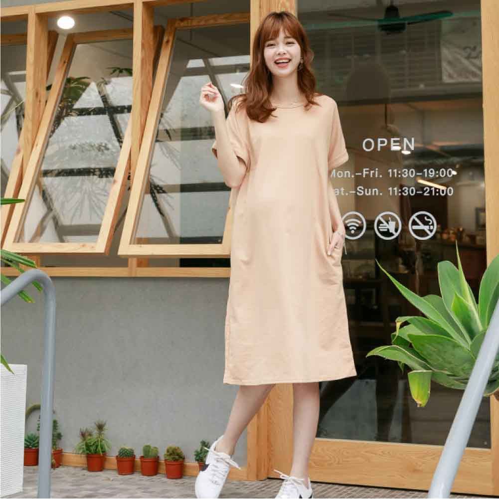 Mamamia孕婦裝 素面雙口袋反折袖孕婦洋裝 正韓製 顯瘦洋裝 連身裙 孕婦裝 連衣裙 短袖[D7040]白|灰|綠|黑|藍|紫|粉|紅|焦糖Maternity DressesMamamia孕婦裝