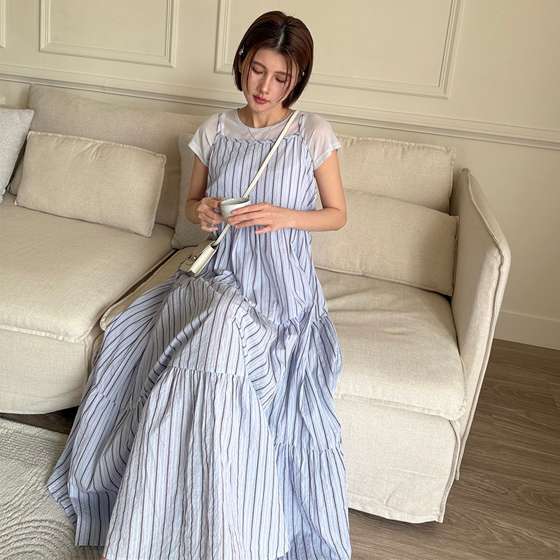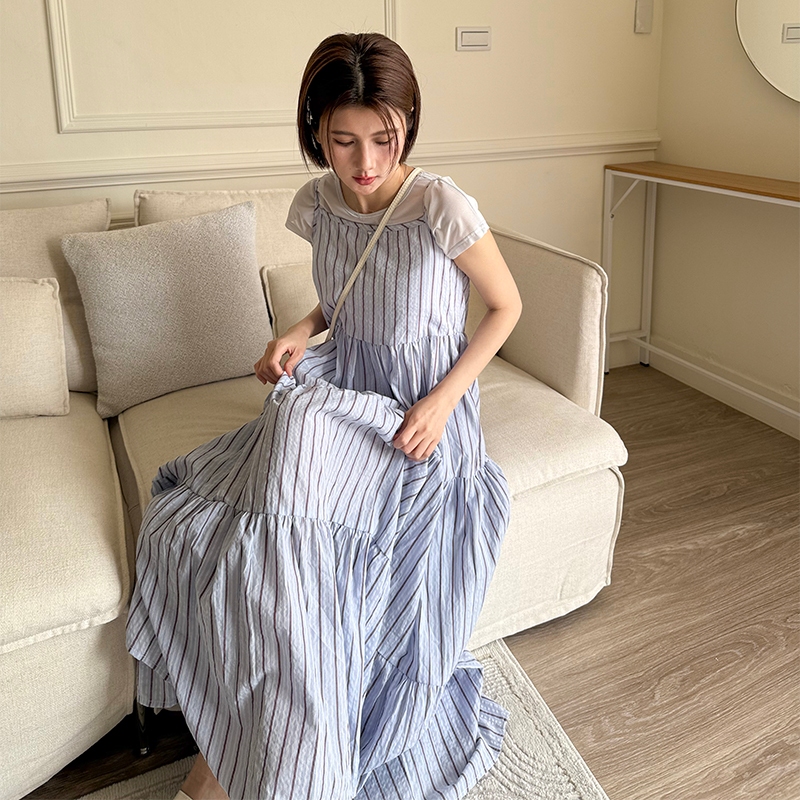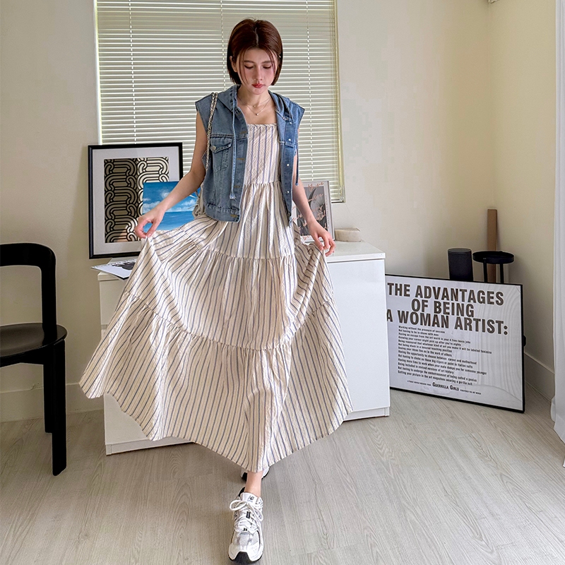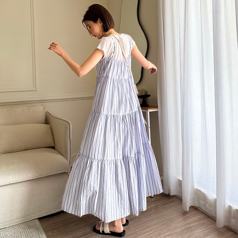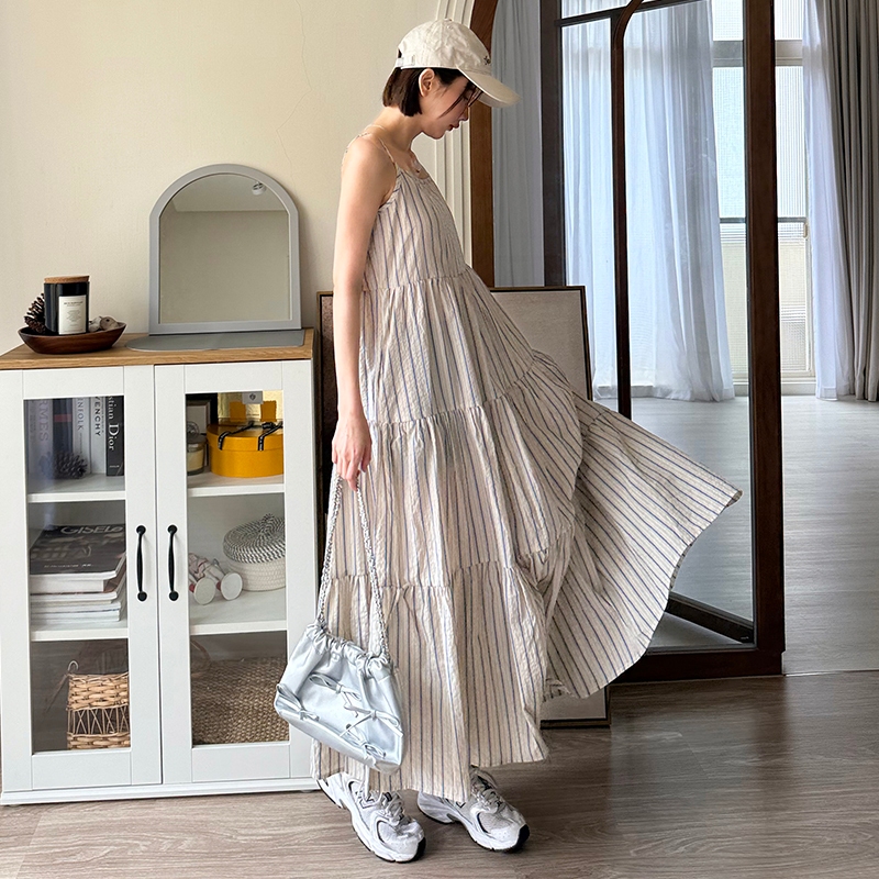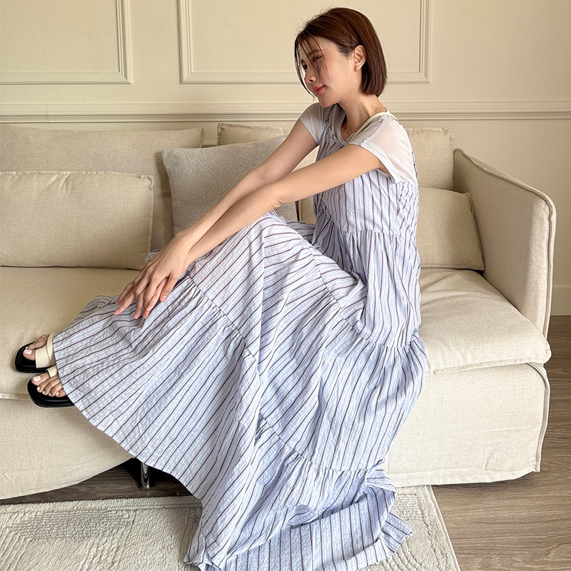 【HARPER】小清新直紋蛋糕長洋裝 | 現貨 無袖洋裝 度假 條紋 連身裙【DSC47329J】藍,F|卡其,FHARPER