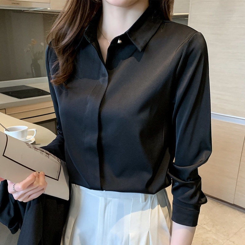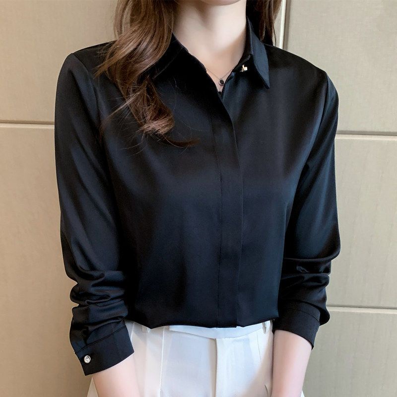 FUXI 長袖襯衫女 抗皺襯衫 免燙襯衫 職業襯衫 白襯衫女生 冰絲涼感緞面襯衣 高端時尚氣質 正裝面試工作服 黑色襯衫