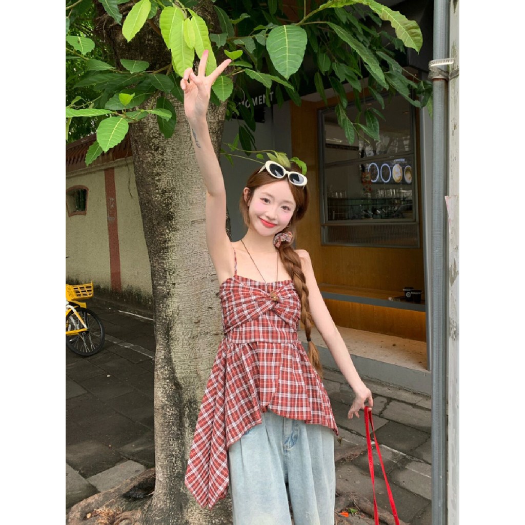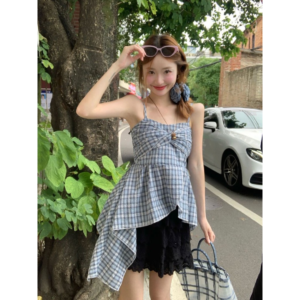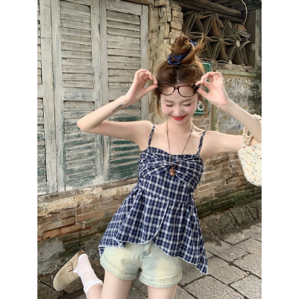 【HOT 本舖】 韓系撞色格子吊帶背心女夏荷葉邊不規則褶皺扭結上衣淺藍格,均碼|深藍格,均碼|紅格,均碼Tanks & CamisolesHOT本舖|女裝館