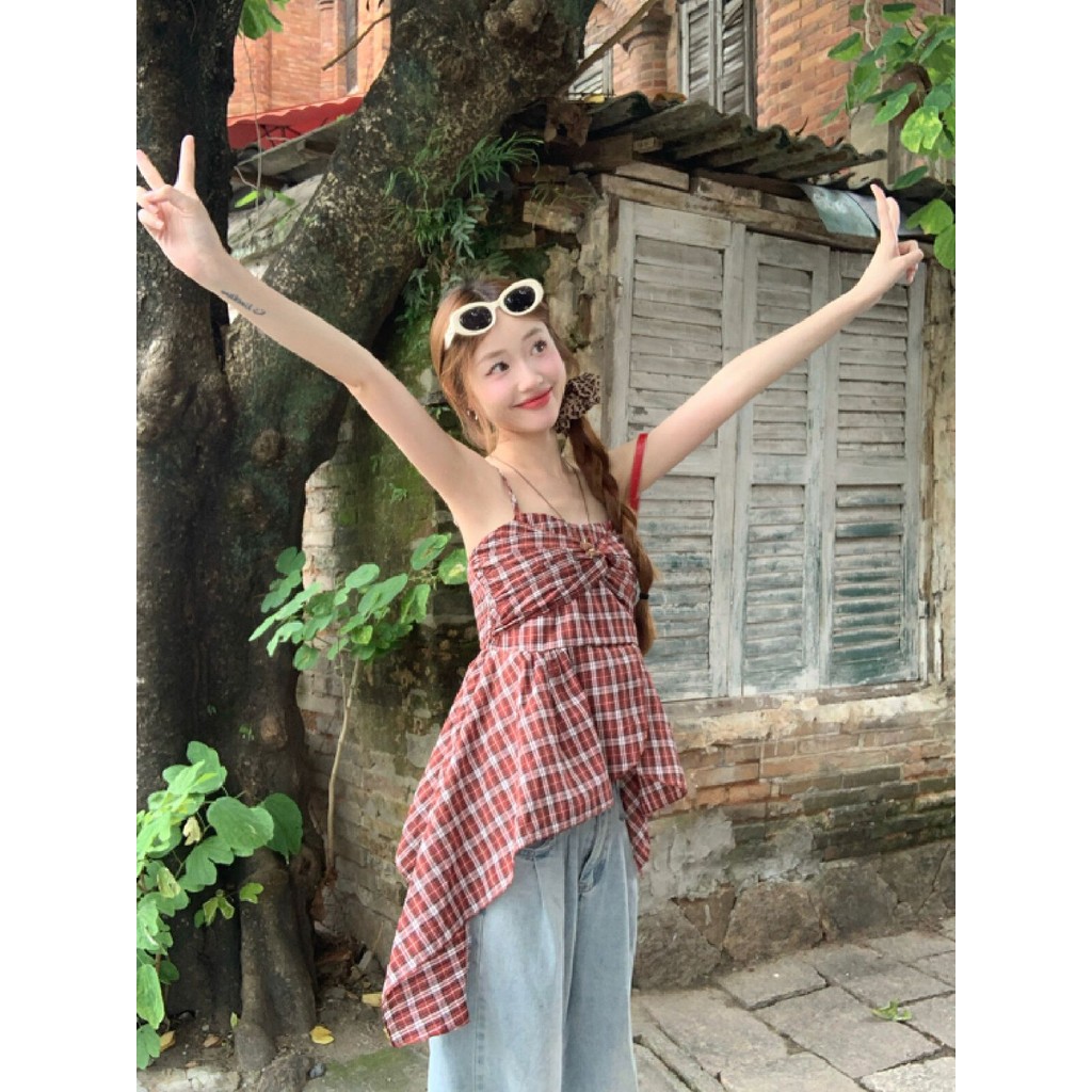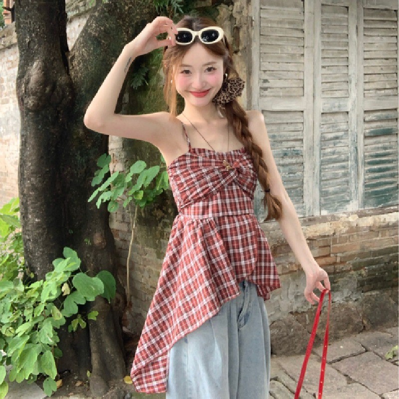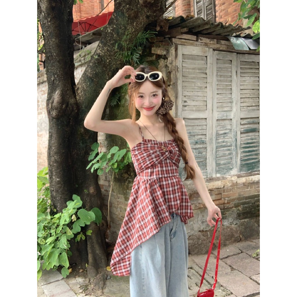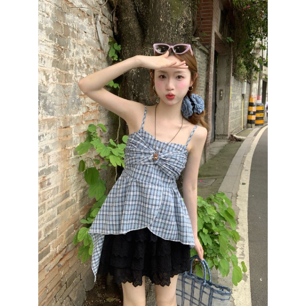 【HOT 本舖】 韓系撞色格子吊帶背心女夏荷葉邊不規則褶皺扭結上衣淺藍格,均碼|深藍格,均碼|紅格,均碼Tanks & CamisolesHOT本舖|女裝館