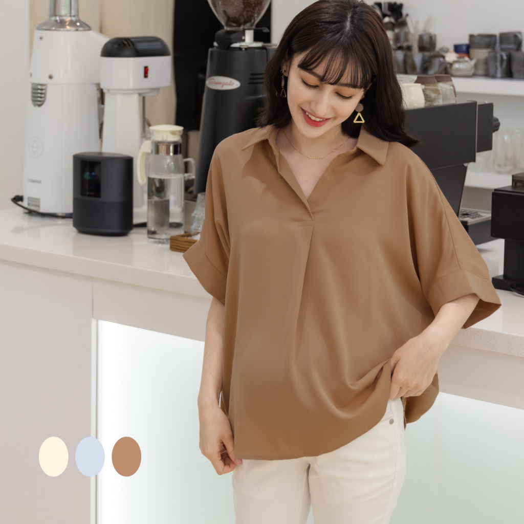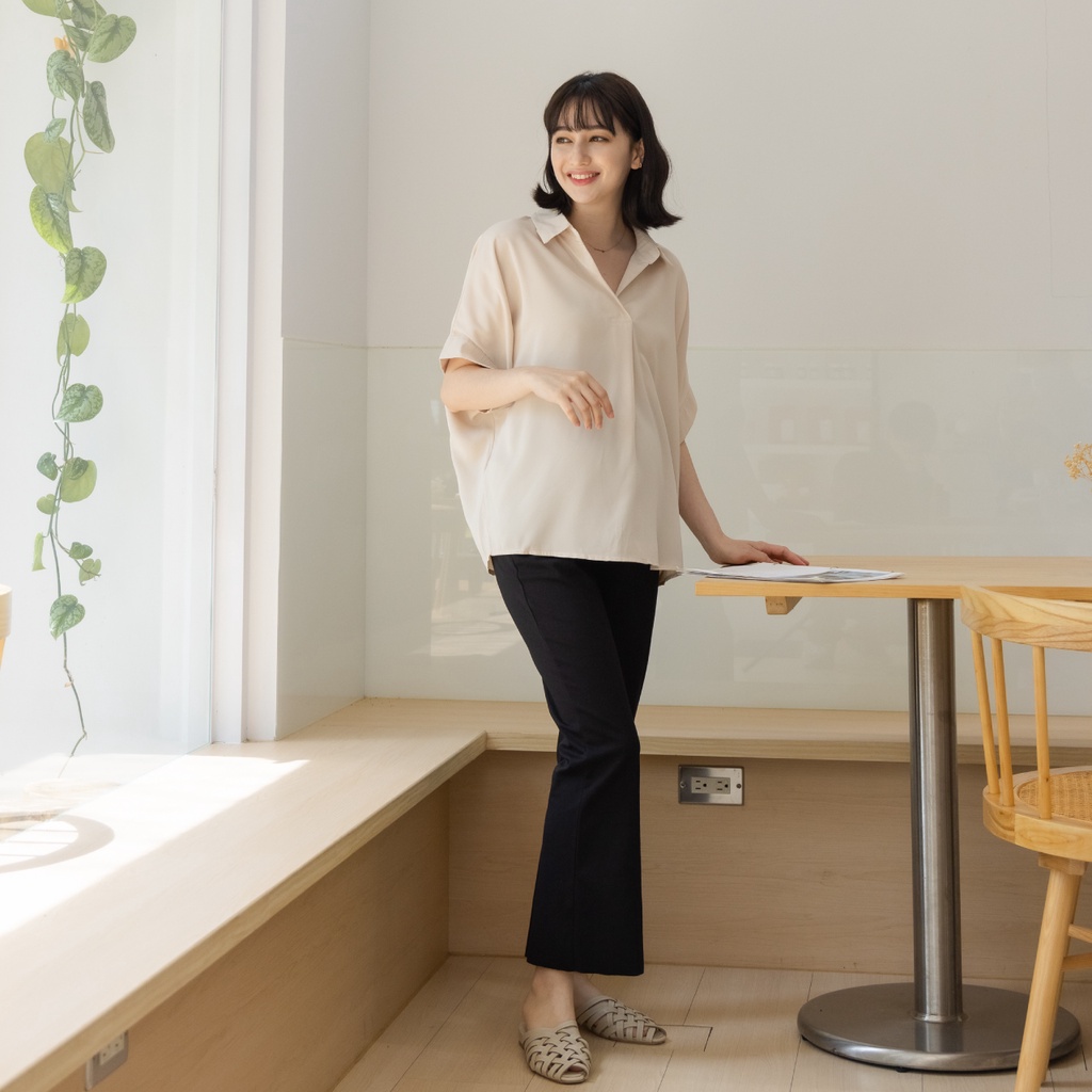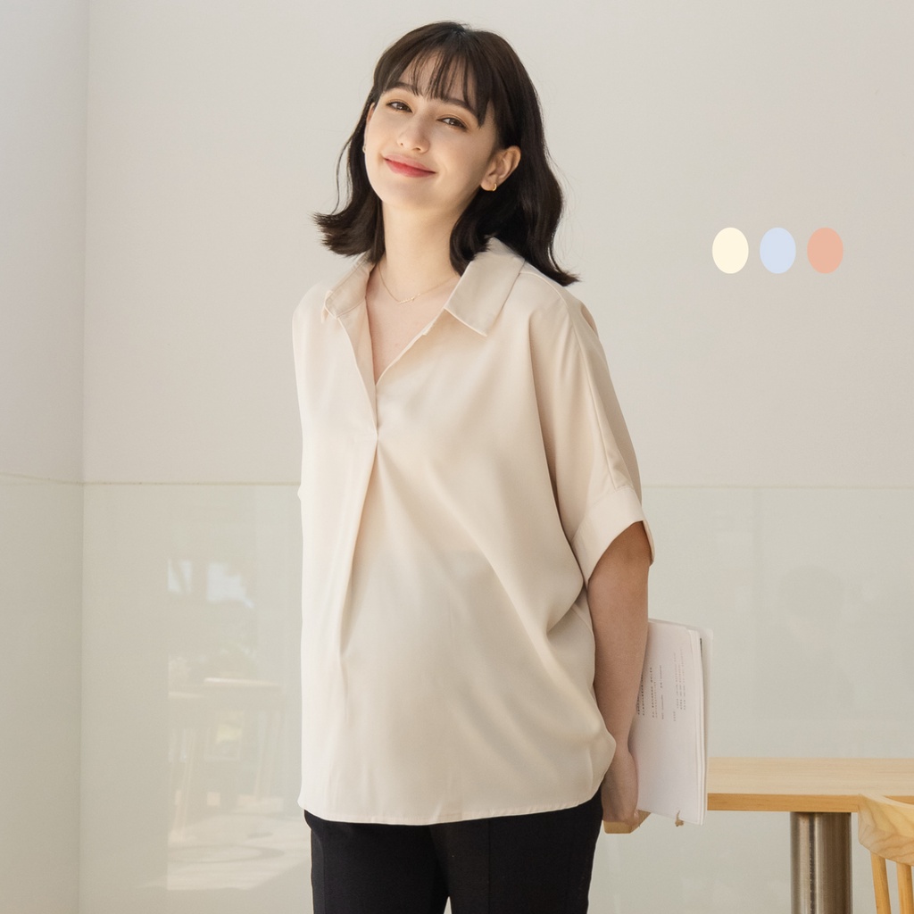 Mamamia孕婦裝 韓系絲滑素面襯衫 正韓製 短袖 孕婦上衣 孕婦裝 上班服 雪紡 [D7264]咖啡|藍|杏Maternity TopsMamamia孕婦裝