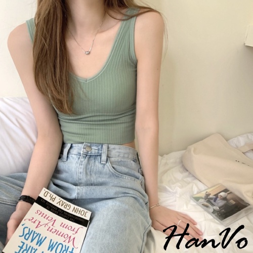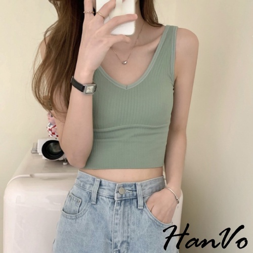 【HanVo】低胸V領美背短版針織背心 附可拆式胸墊 集中包覆螺紋無袖上衣 韓系女裝 女生衣著 A09-5040卡其|淺綠|NG福利品(不挑款 不挑色)OthersHanVo Wear Collection