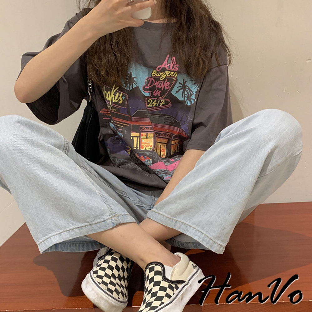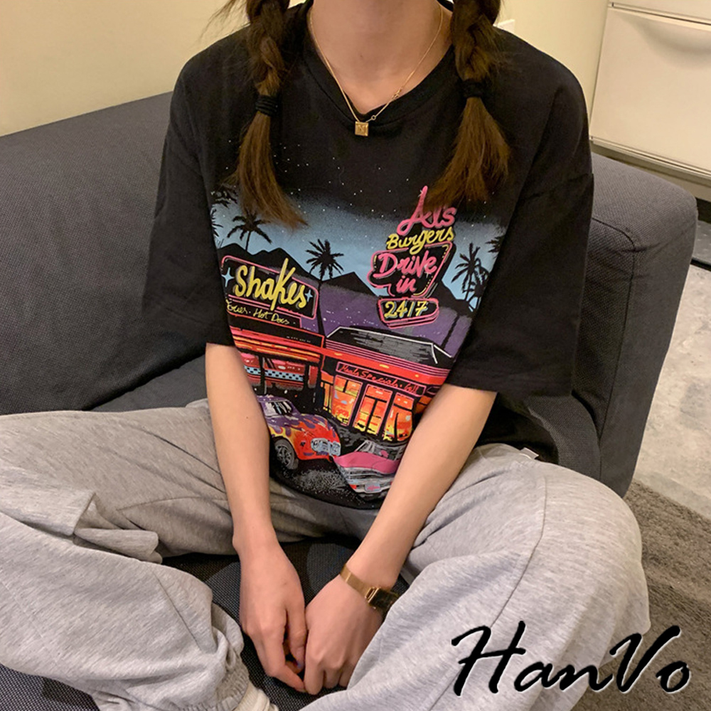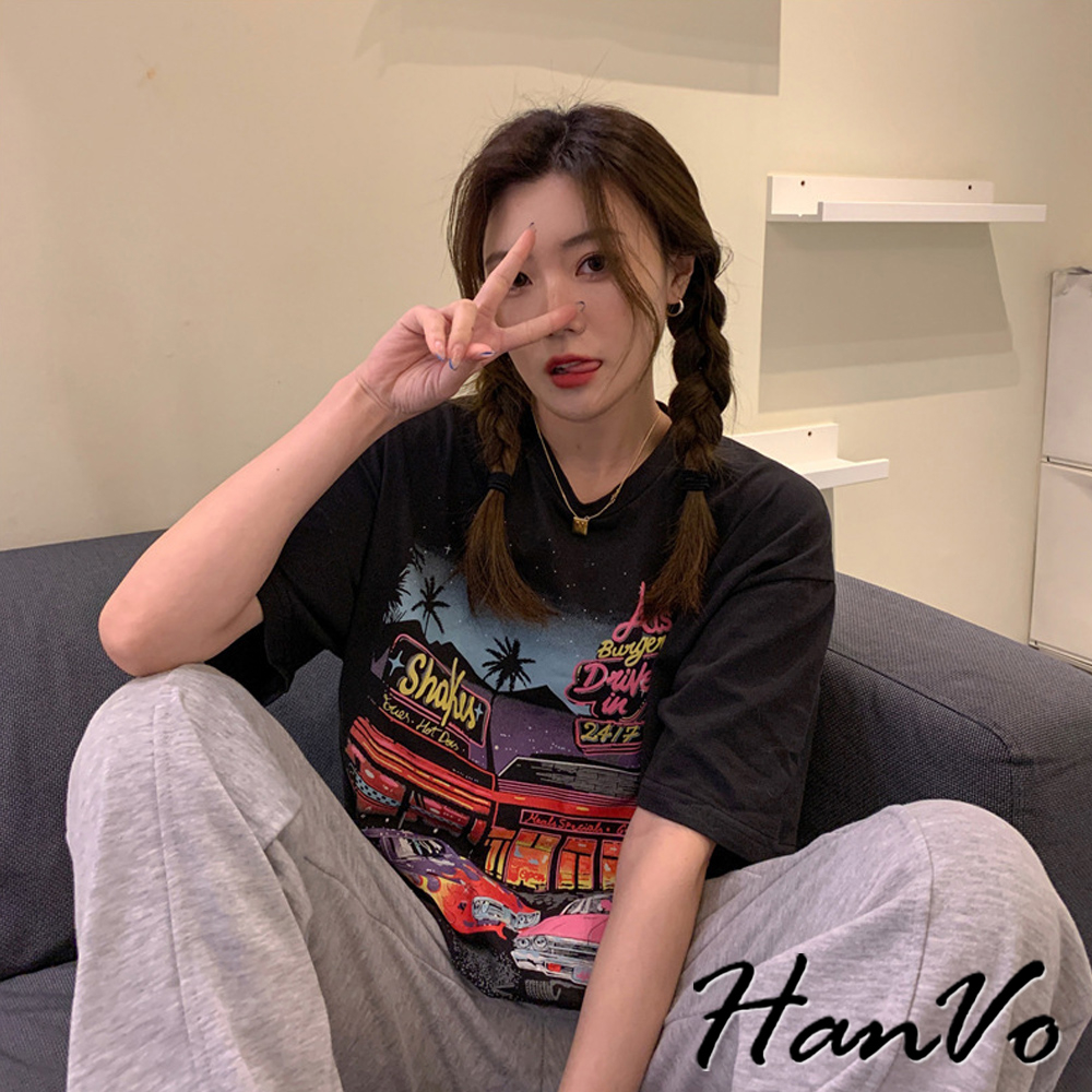 【HanVo】美式霓虹餐廳印花短袖落肩T 舒適棉質透氣上衣 韓版寬鬆T 韓國韓系女裝 女生衣著 A01-0061黑色|灰色T-shirtsHanVo Wear Collection