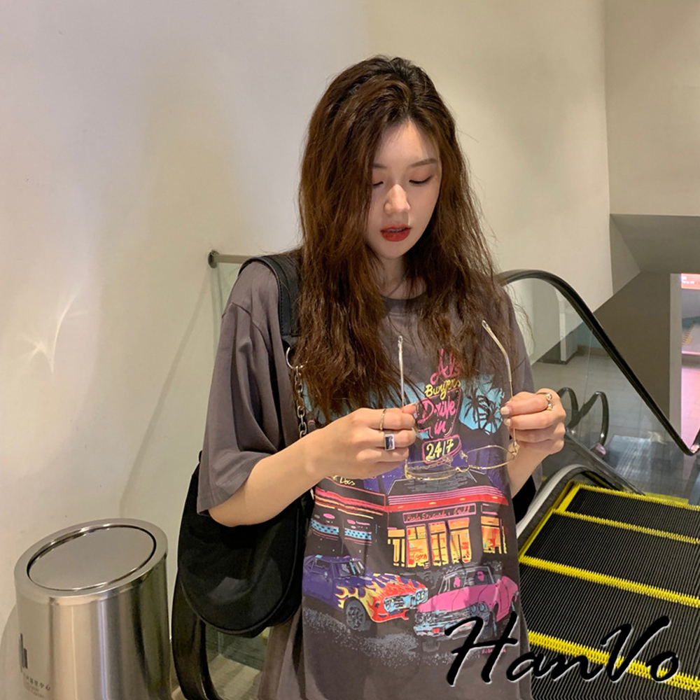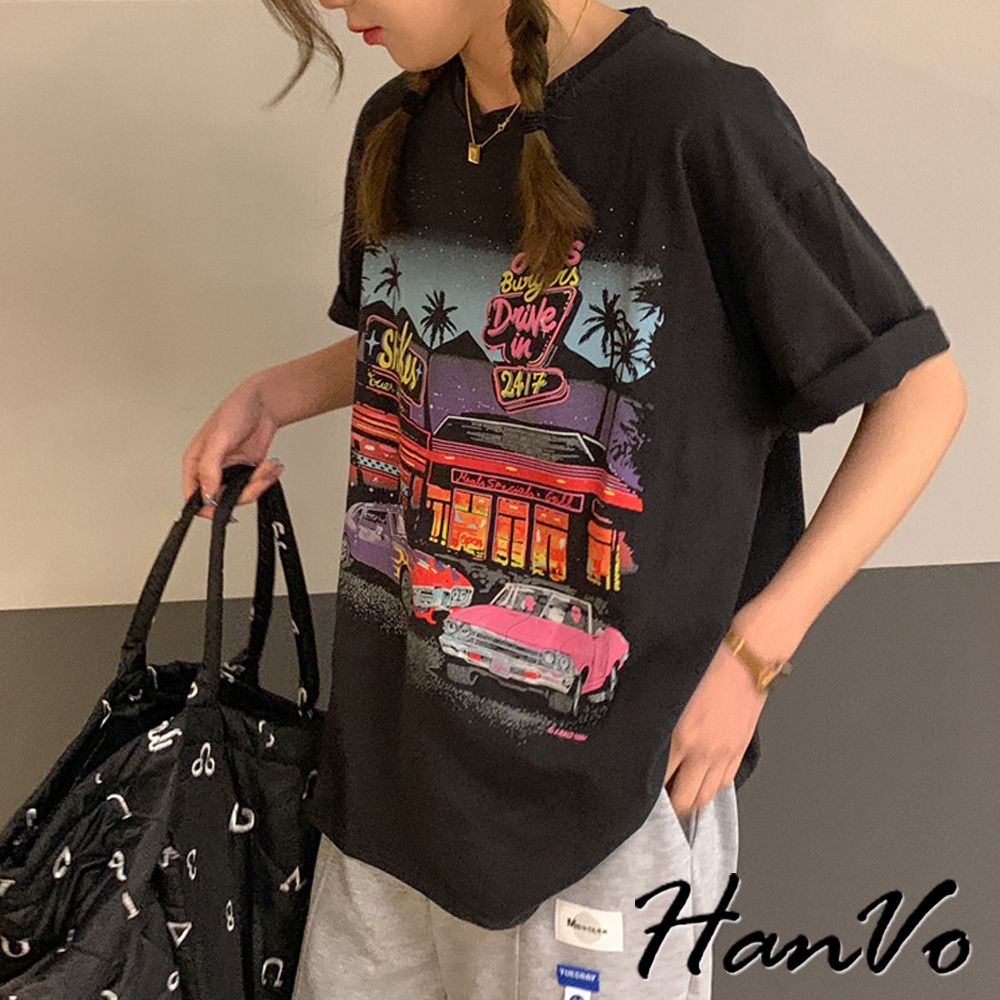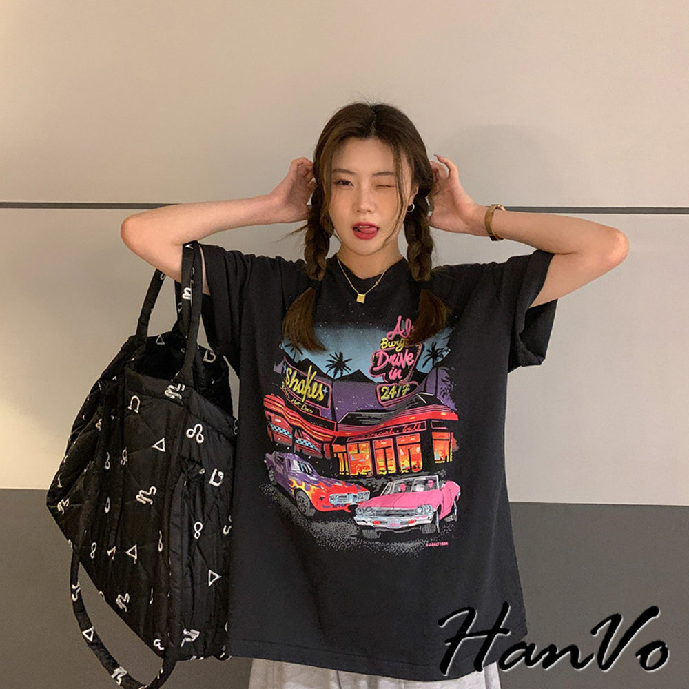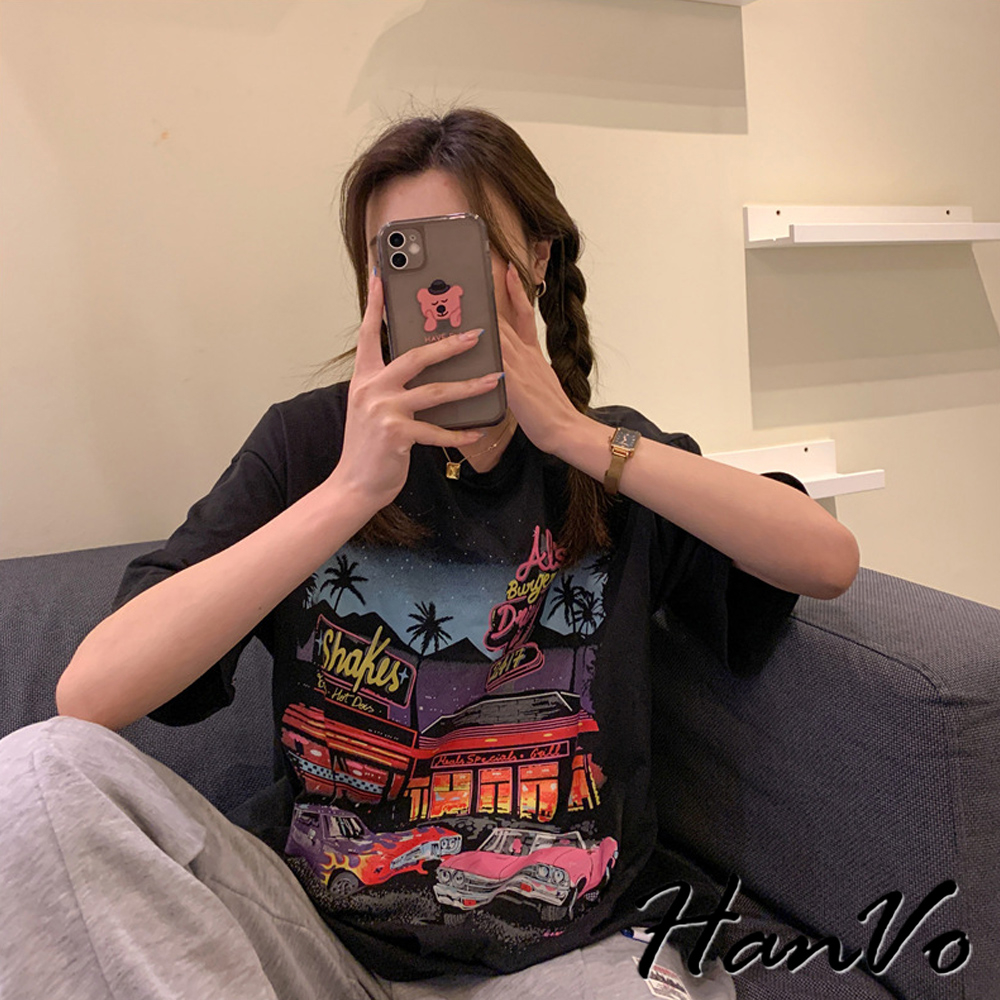 【HanVo】美式霓虹餐廳印花短袖落肩T 舒適棉質透氣上衣 韓版寬鬆T 韓國韓系女裝 女生衣著 A01-0061黑色|灰色T-shirtsHanVo Wear Collection