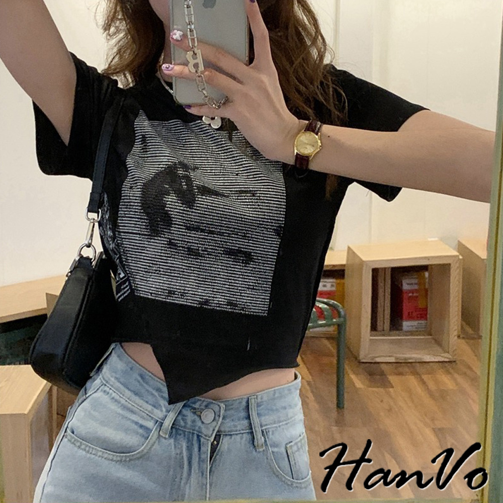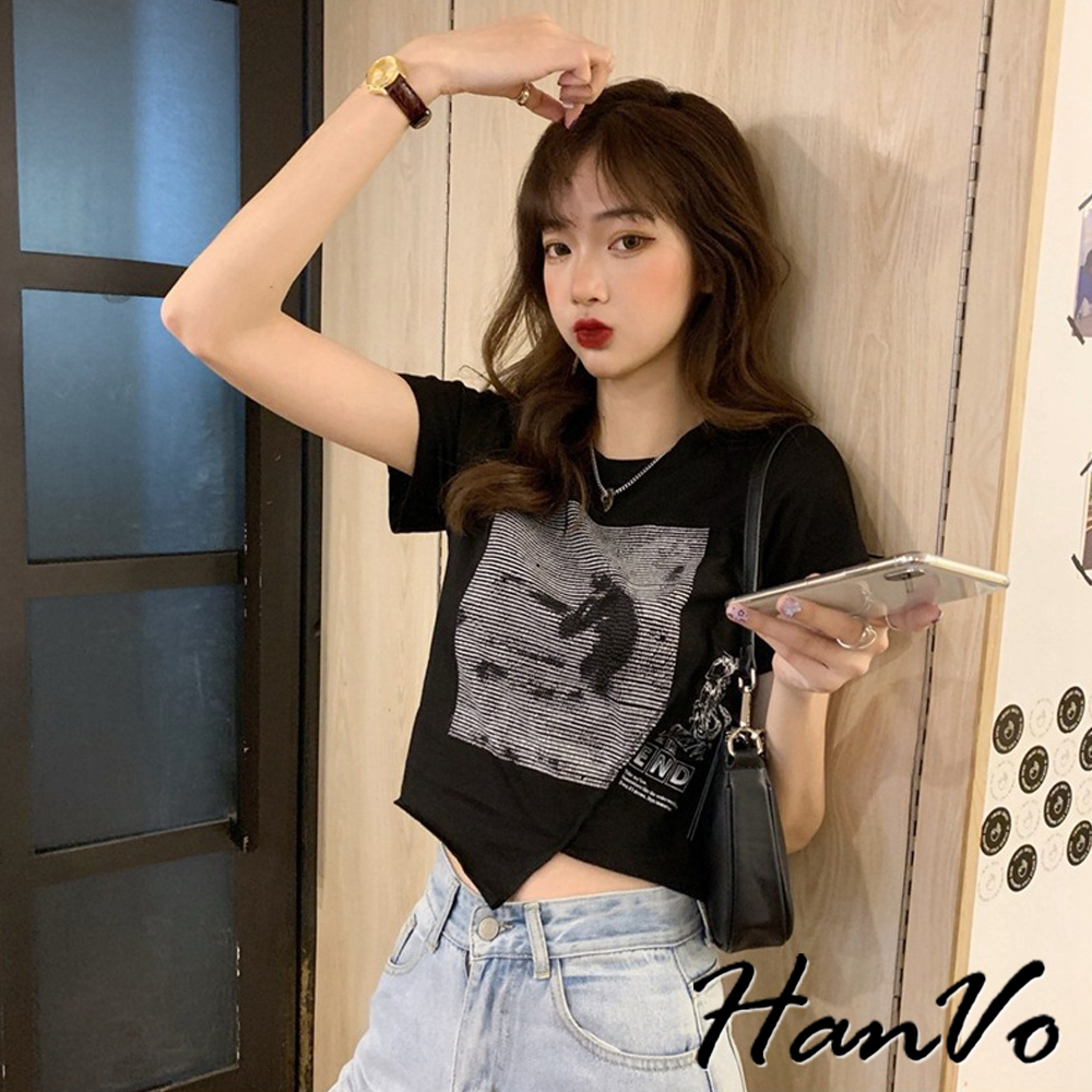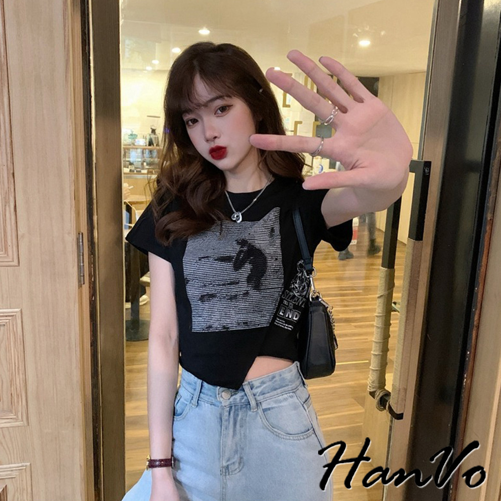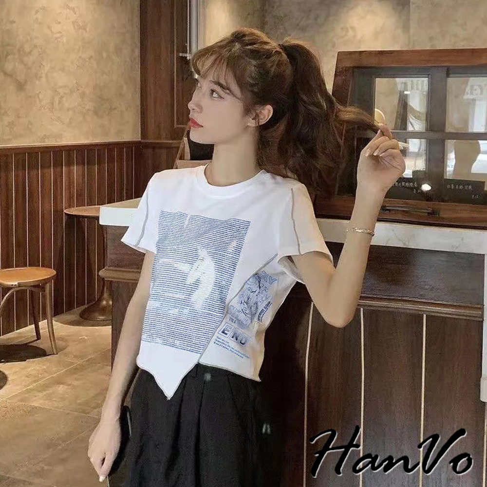 【HanVo】短版不規則獨角獸上衣 不規則短袖上衣 柔膚透氣棉質衣 韓國女裝 女生衣著 A01-0060黑色|白色T-shirtsHanVo Wear Collection