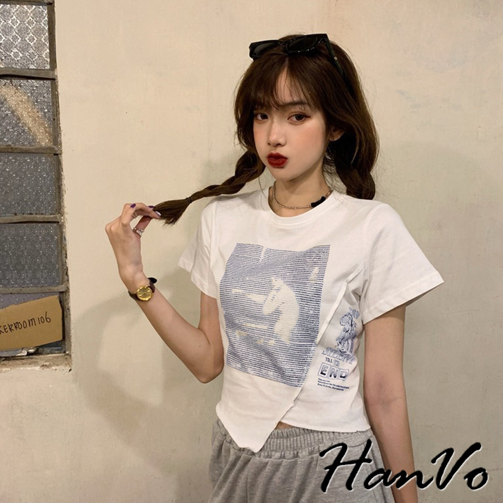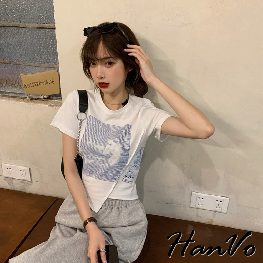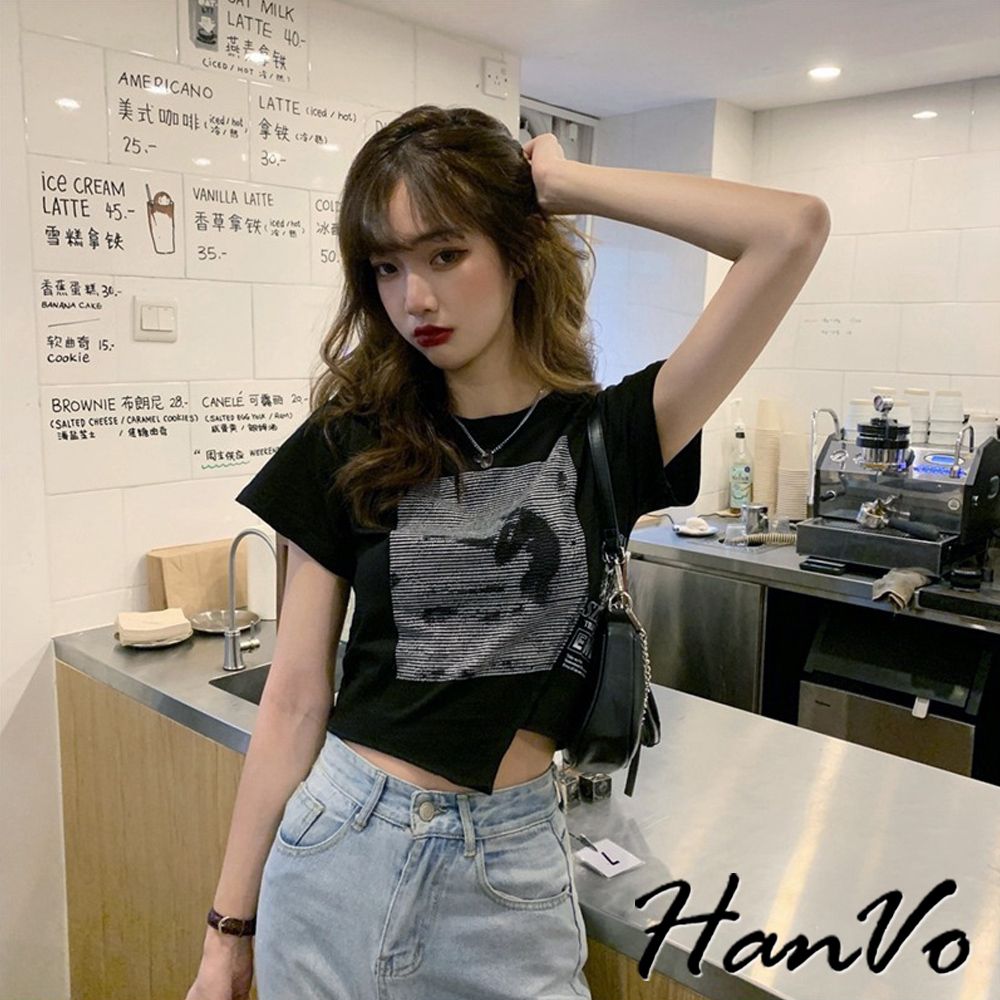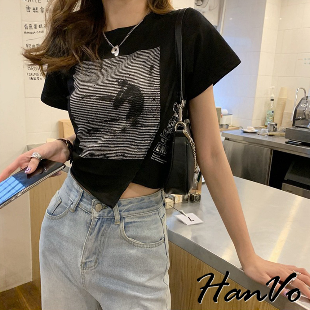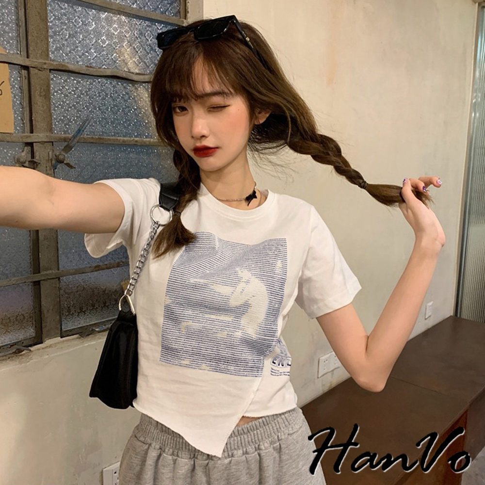 【HanVo】短版不規則獨角獸上衣 不規則短袖上衣 柔膚透氣棉質衣 韓國女裝 女生衣著 A01-0060黑色|白色T-shirtsHanVo Wear Collection