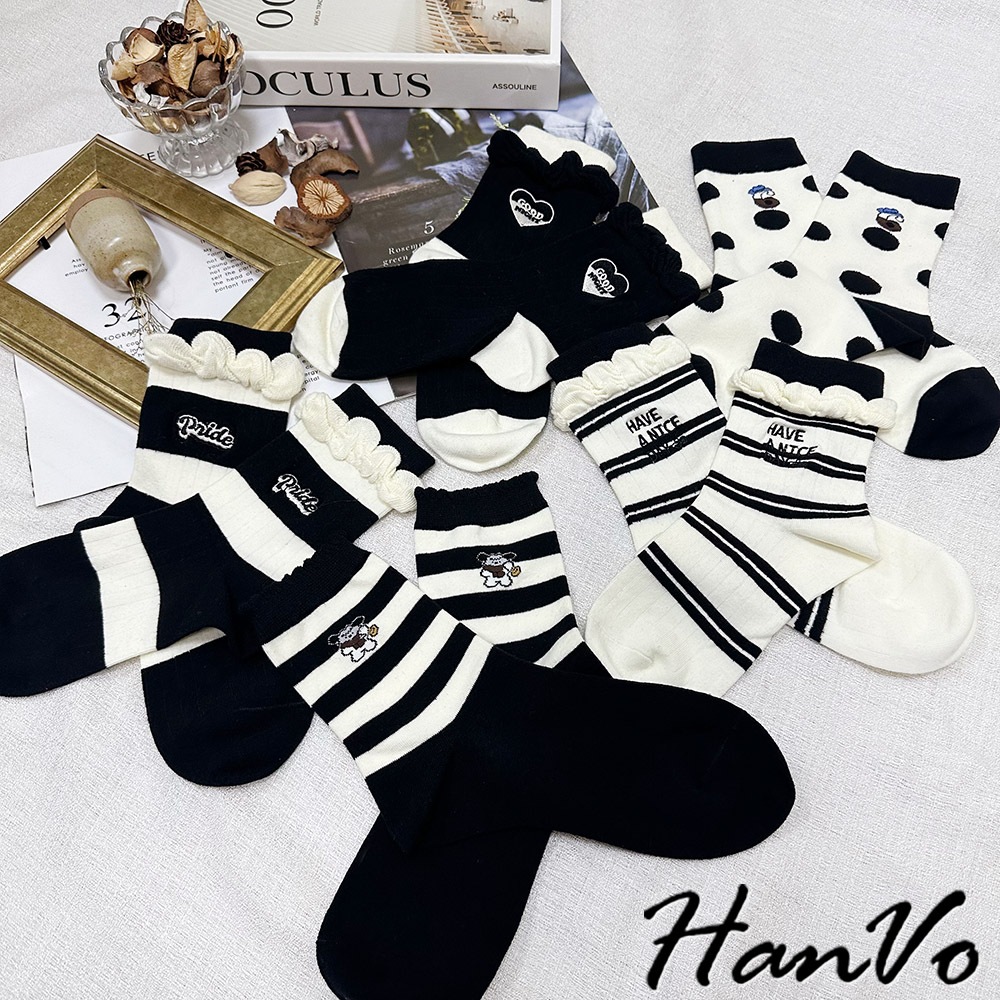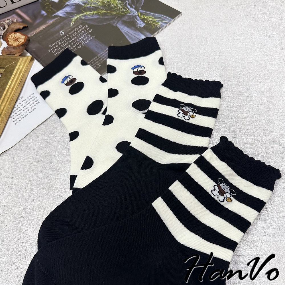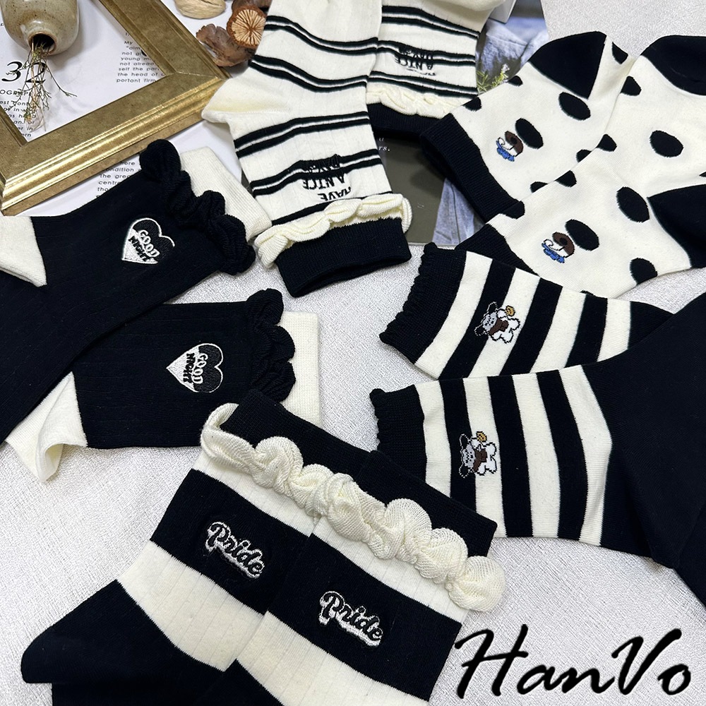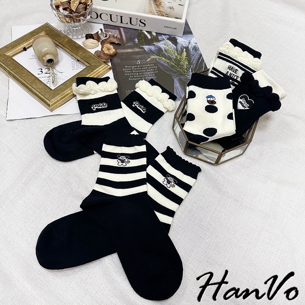 【HanVo】黑白流行條紋點點中筒襪 吸濕排汗透氣潮流個性襪 韓系休閒襪 女生配件 A12-6303條紋狗狗|滿版圓點|雙細條紋|粗條紋|愛心SocksHanVo Wear Collection