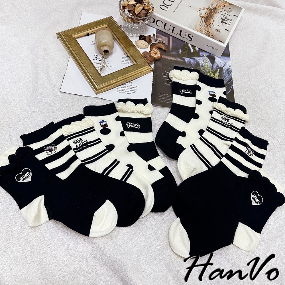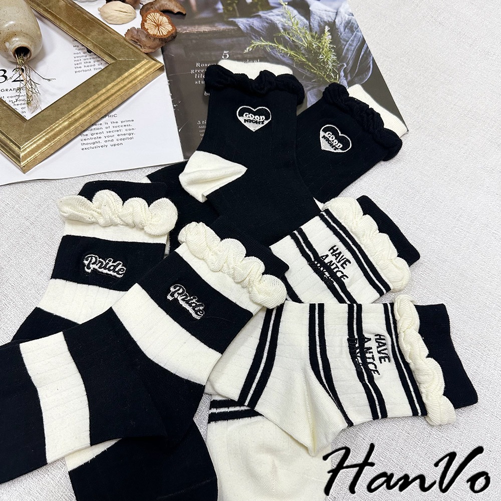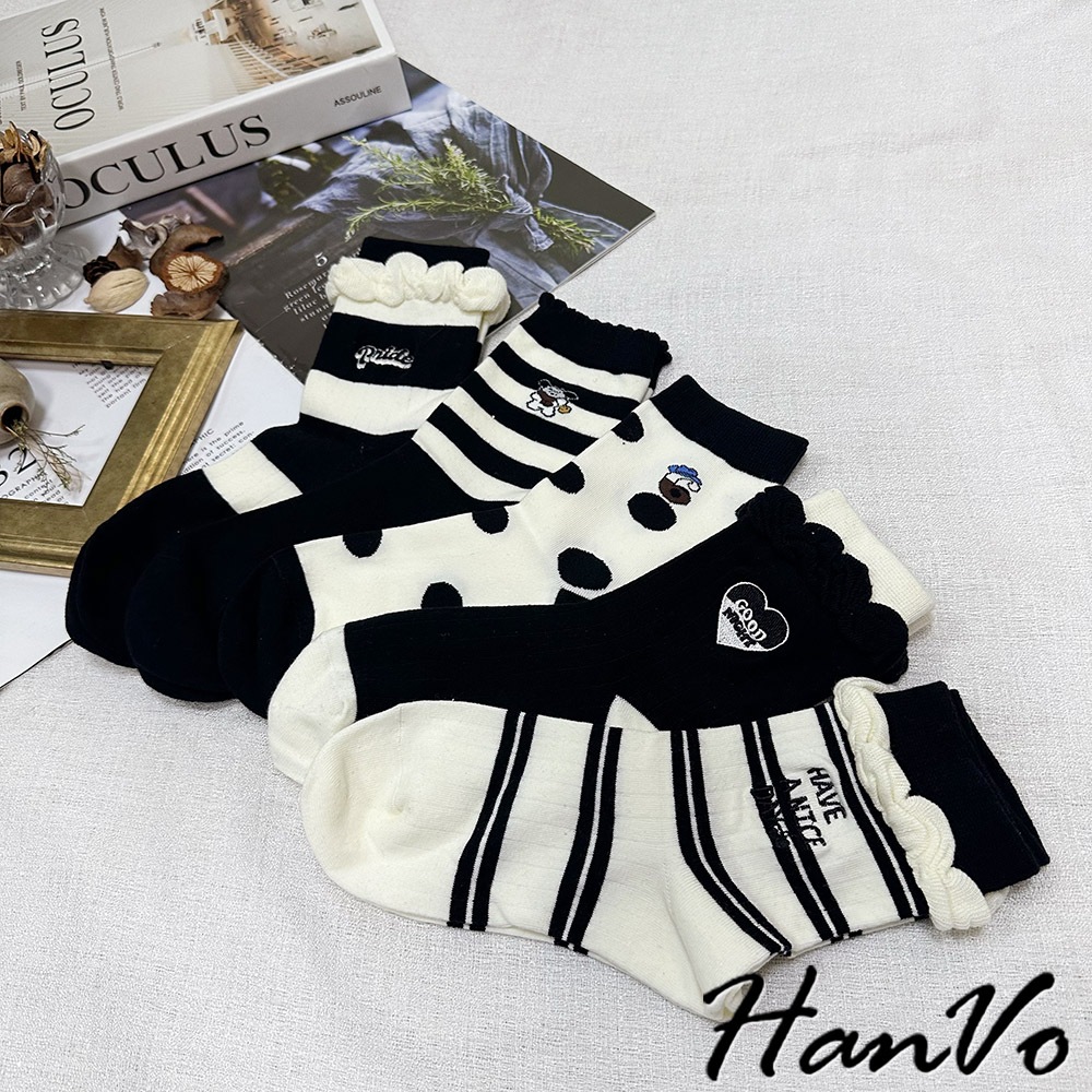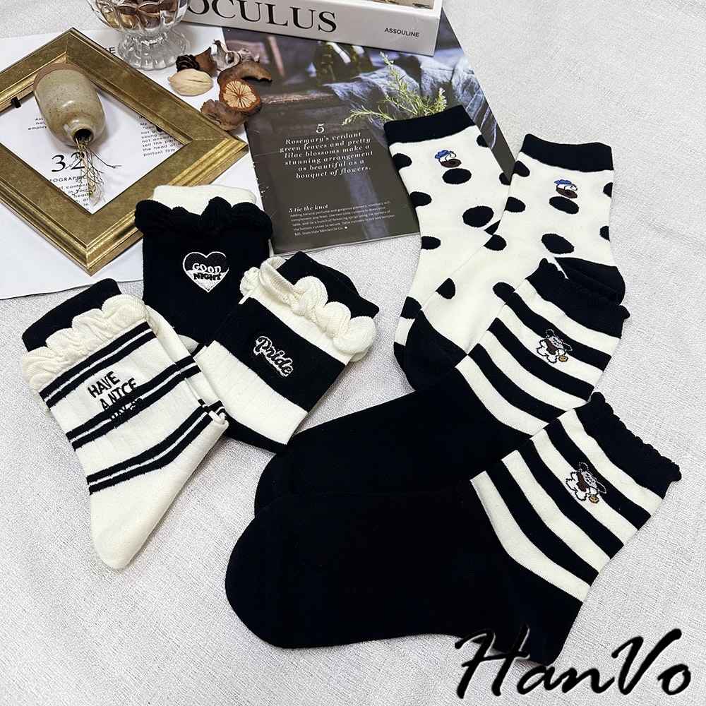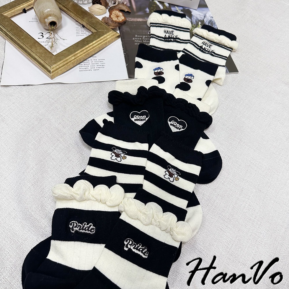 【HanVo】黑白流行條紋點點中筒襪 吸濕排汗透氣潮流個性襪 韓系休閒襪 女生配件 A12-6303條紋狗狗|滿版圓點|雙細條紋|粗條紋|愛心SocksHanVo Wear Collection