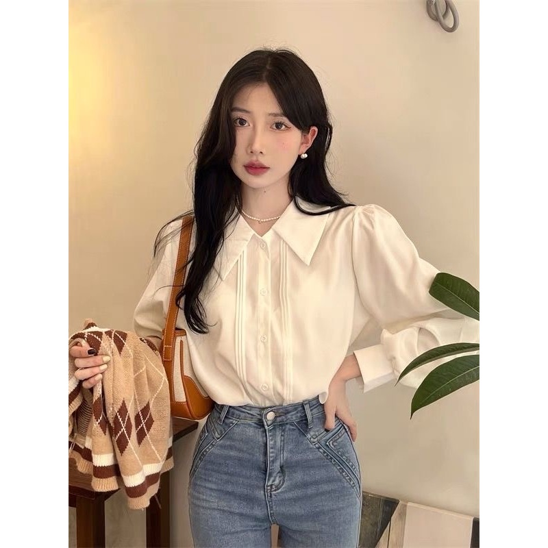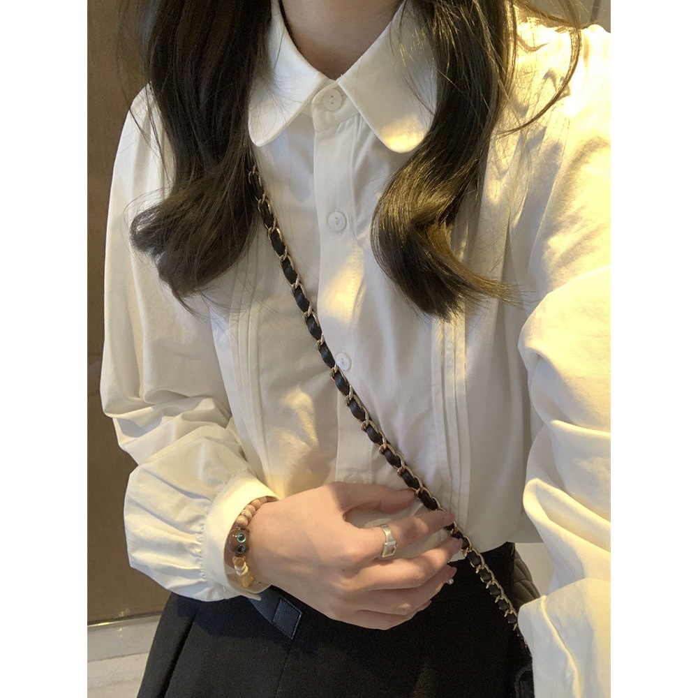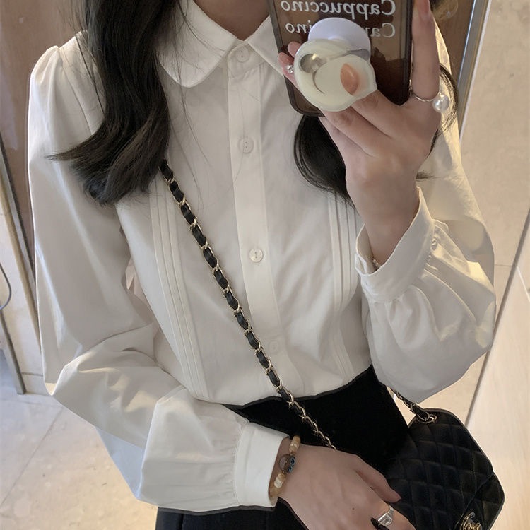 娃娃領襯衫女 白色襯衫 內搭襯衣 風琴褶襯衣 長袖襯衫 長袖上衣 氣質寬鬆顯瘦翻領襯衫 女裝 衣服