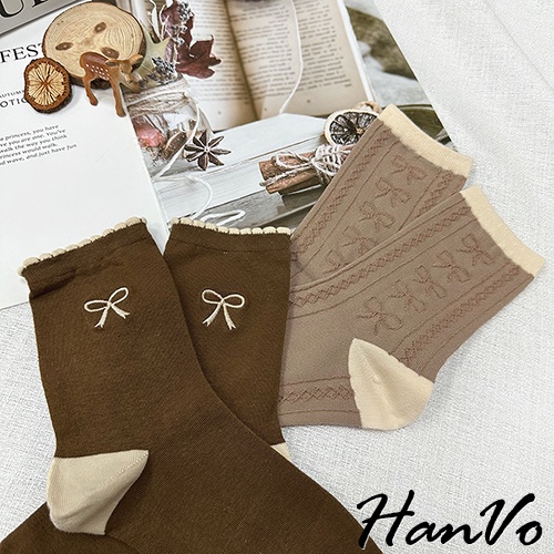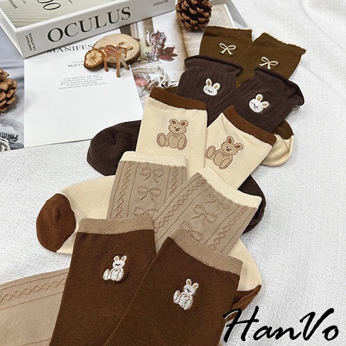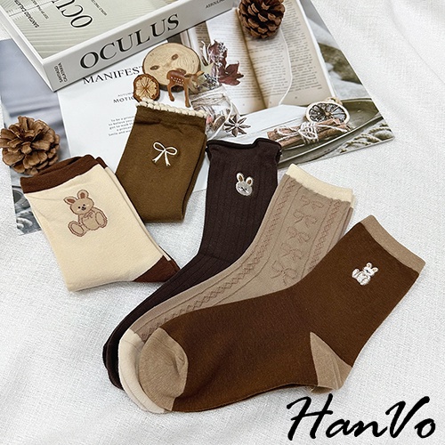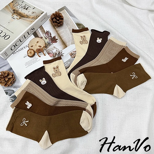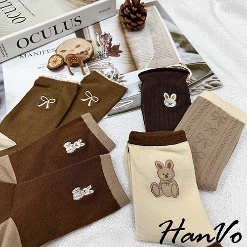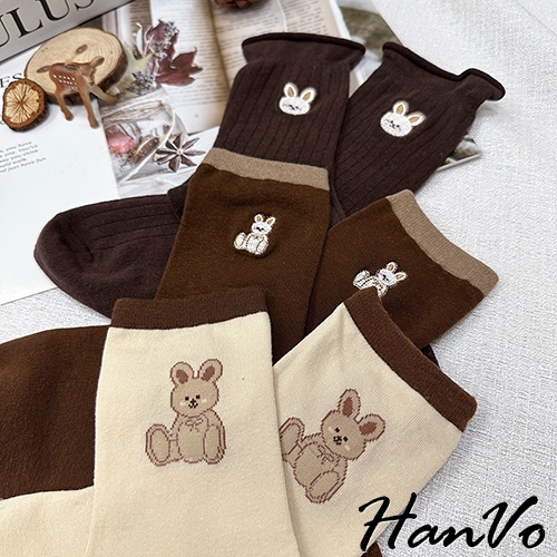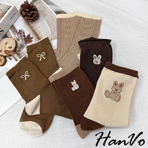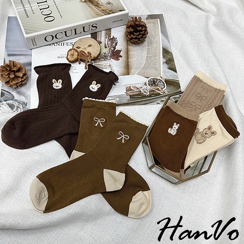【HanVo】蝴蝶結小兔咖色系中筒襪 韓系簡約百搭舒適柔軟棉質襪 韓國潮流時尚休閒襪 女生配件 A12-6178蝴蝶結刺繡|米杏大兔|深咖兔頭|棕咖小兔|蝴蝶結麻花SocksHanVo Wear Collection