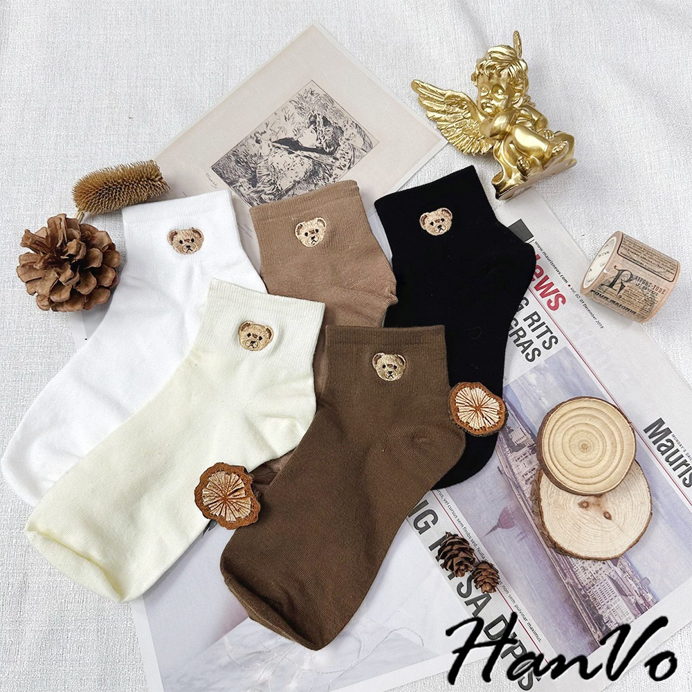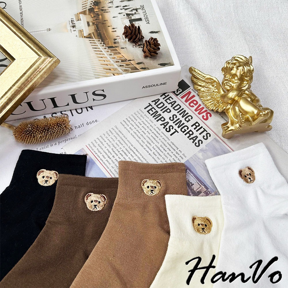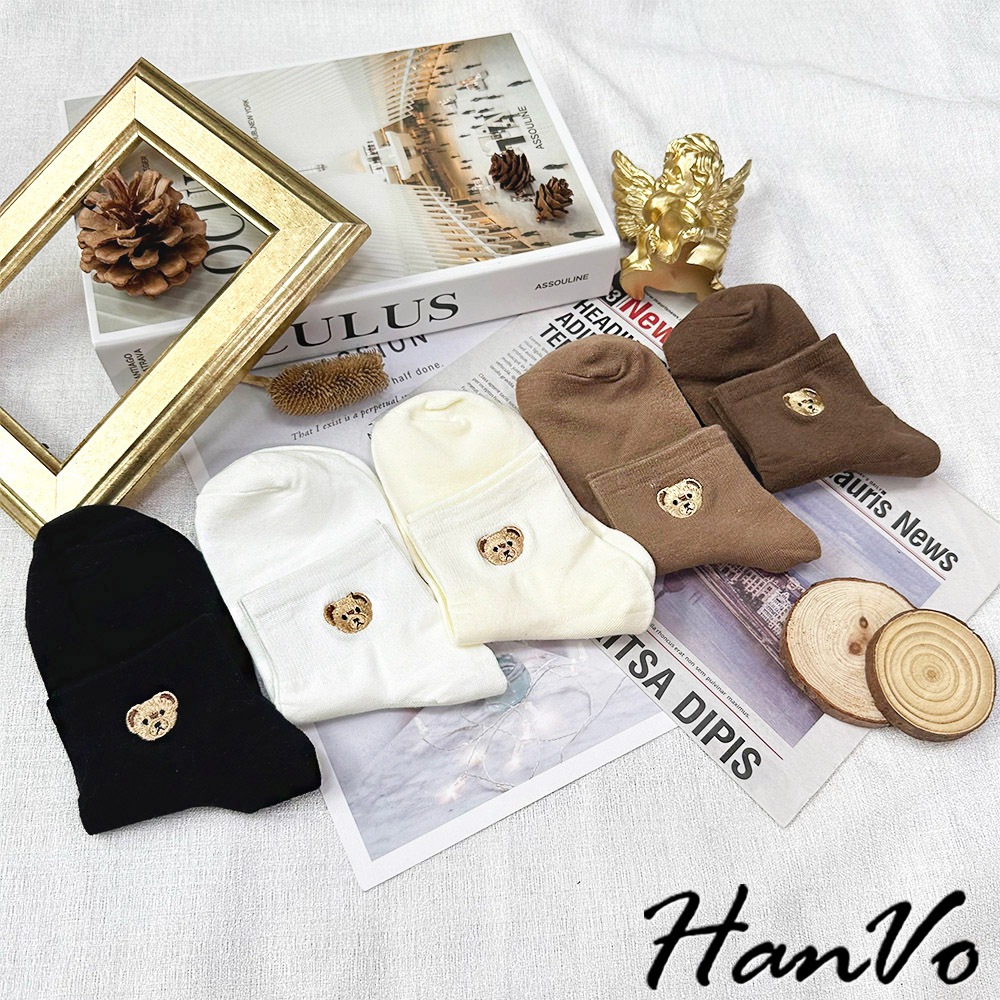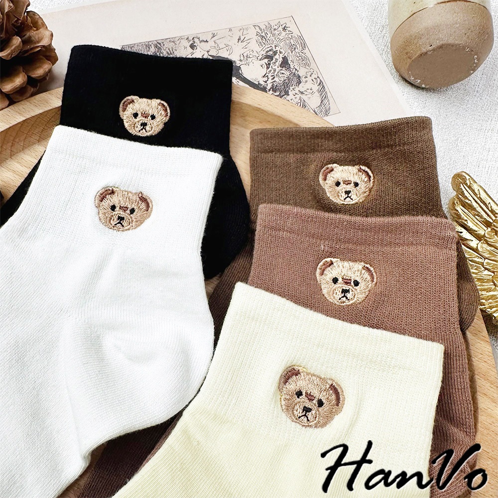 【HanVo】奶茶小熊刺繡中筒襪 日系甜美透氣親膚舒適棉質襪 潮流時尚休閒襪 女生配件 A12-6196卡其色|咖色|黑色|白色|米白色SocksHanVo Wear Collection