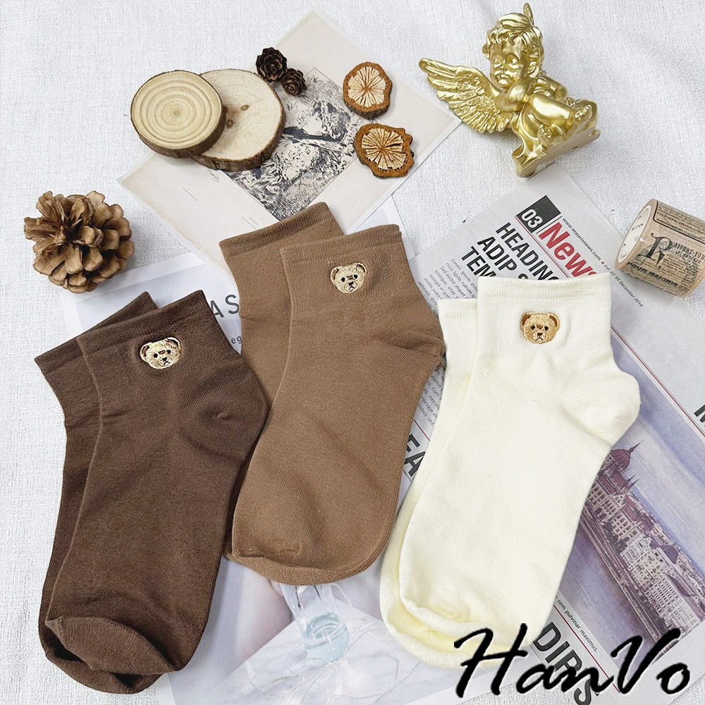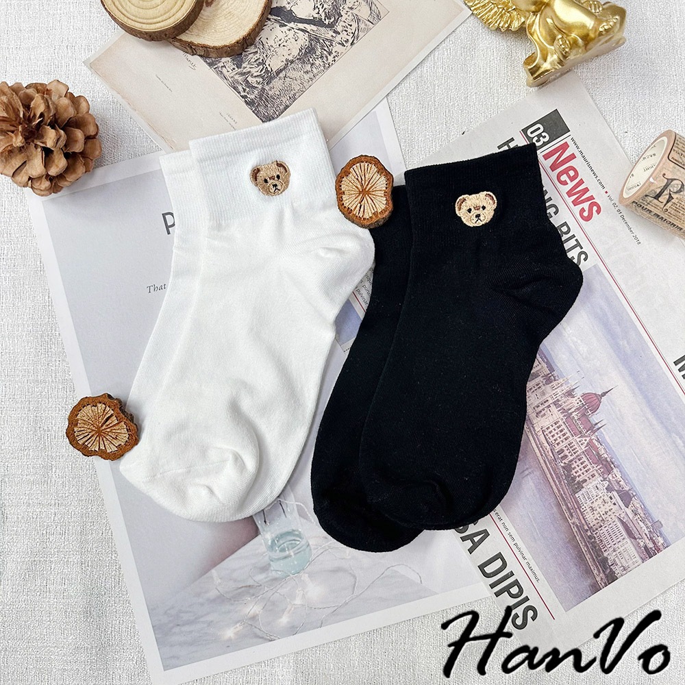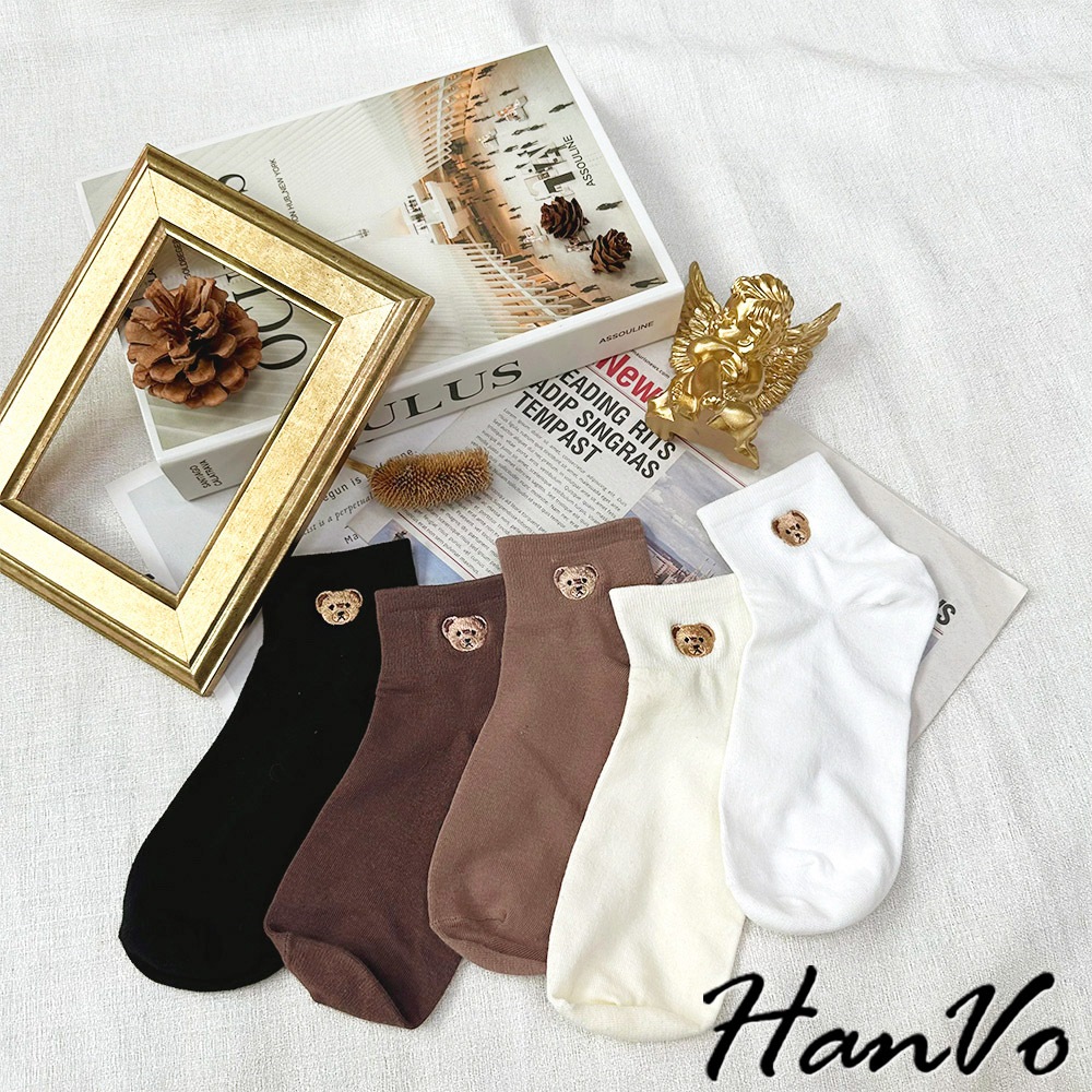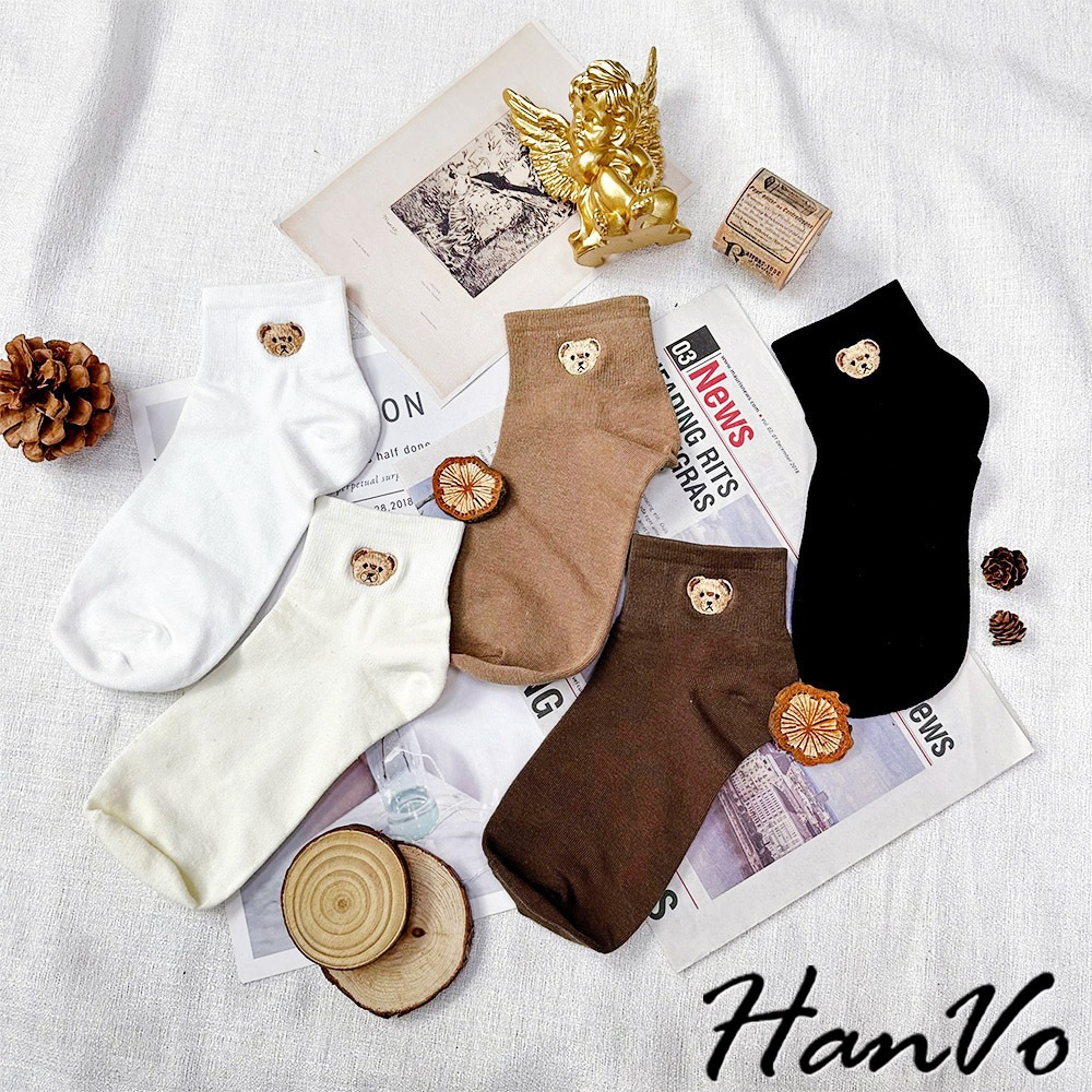 【HanVo】奶茶小熊刺繡中筒襪 日系甜美透氣親膚舒適棉質襪 潮流時尚休閒襪 女生配件 A12-6196卡其色|咖色|黑色|白色|米白色SocksHanVo Wear Collection